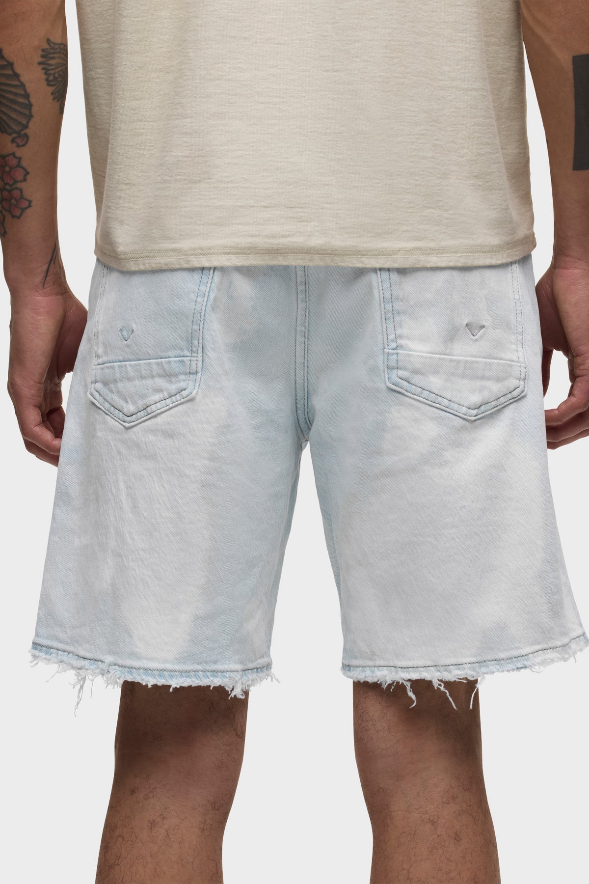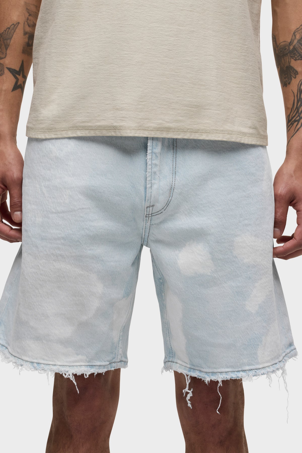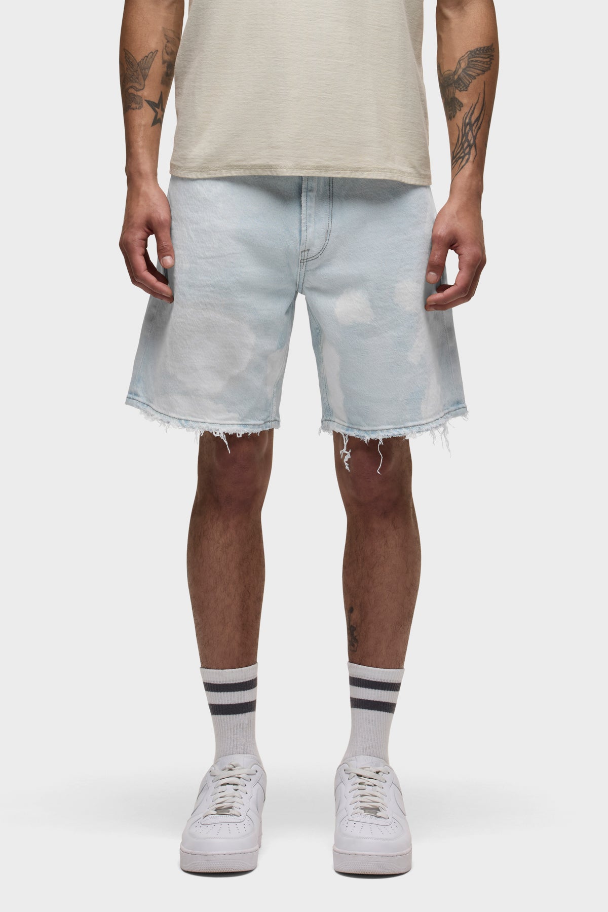 - The Clint Relaxed Short in Bleached Cloud is a versatile essential, offering a laid-back straight fit. This pair features a super light indigo wash with an all-over uneven treatment made to look like dirty stains and spots. Each short is custom dyed, and one of a kind. The dying process can vary from piece to piece and is what makes this garment unique.