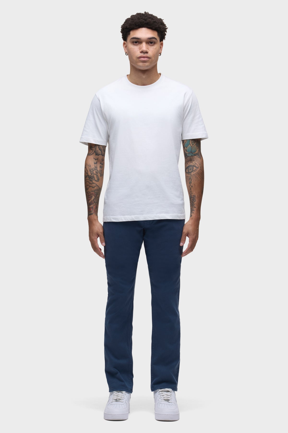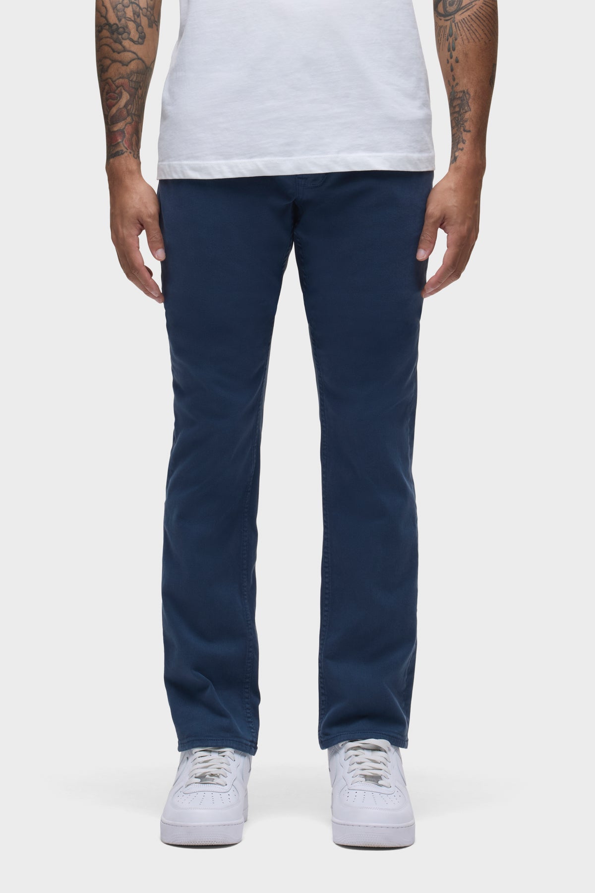 - Can’t beat Blake, our modern, just-right fit. Mid-rise, slim through the hip and thigh with a tapered leg. A classic. The overdyed Navy Blue wash is finished with grey hardware and a black leather back patch. This pair is made of premium comfort stretch denim with classic five-pocket detailing.