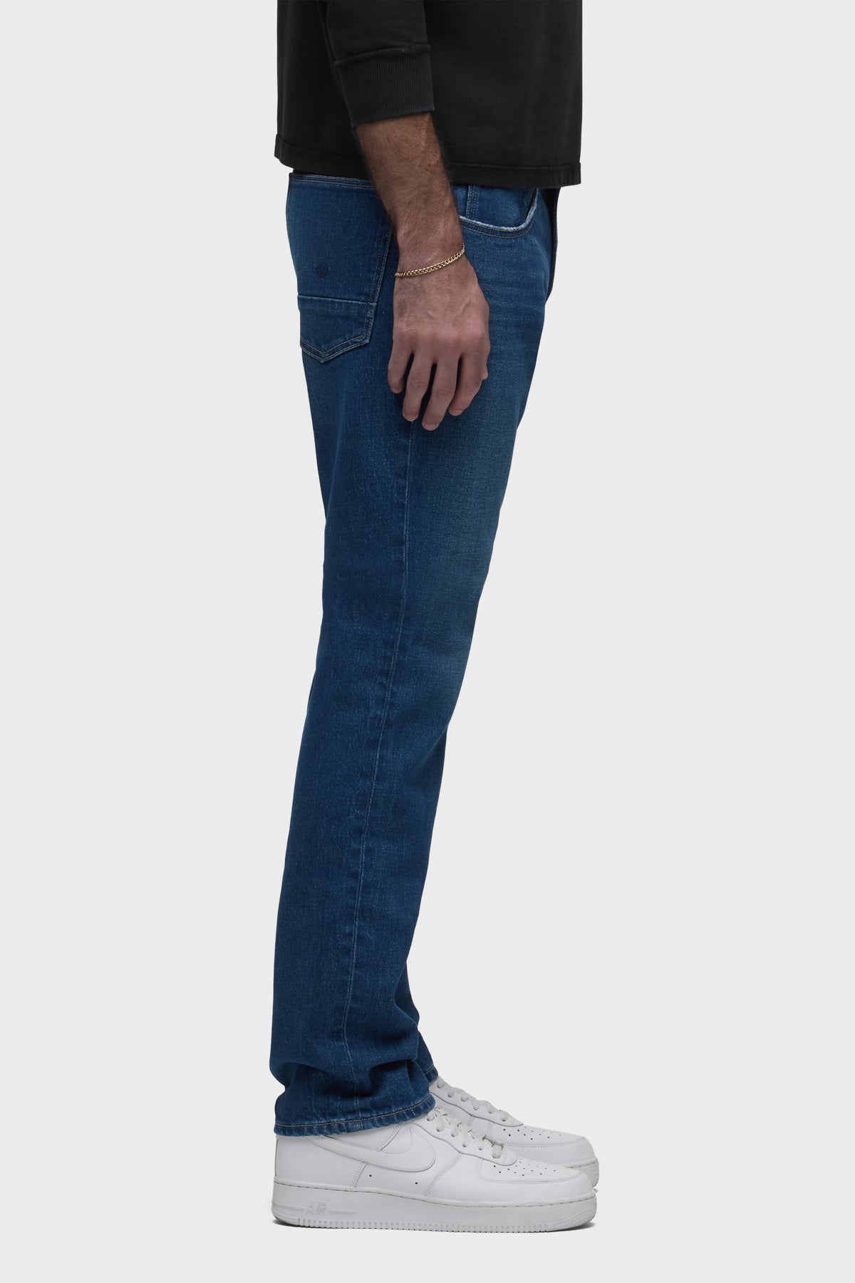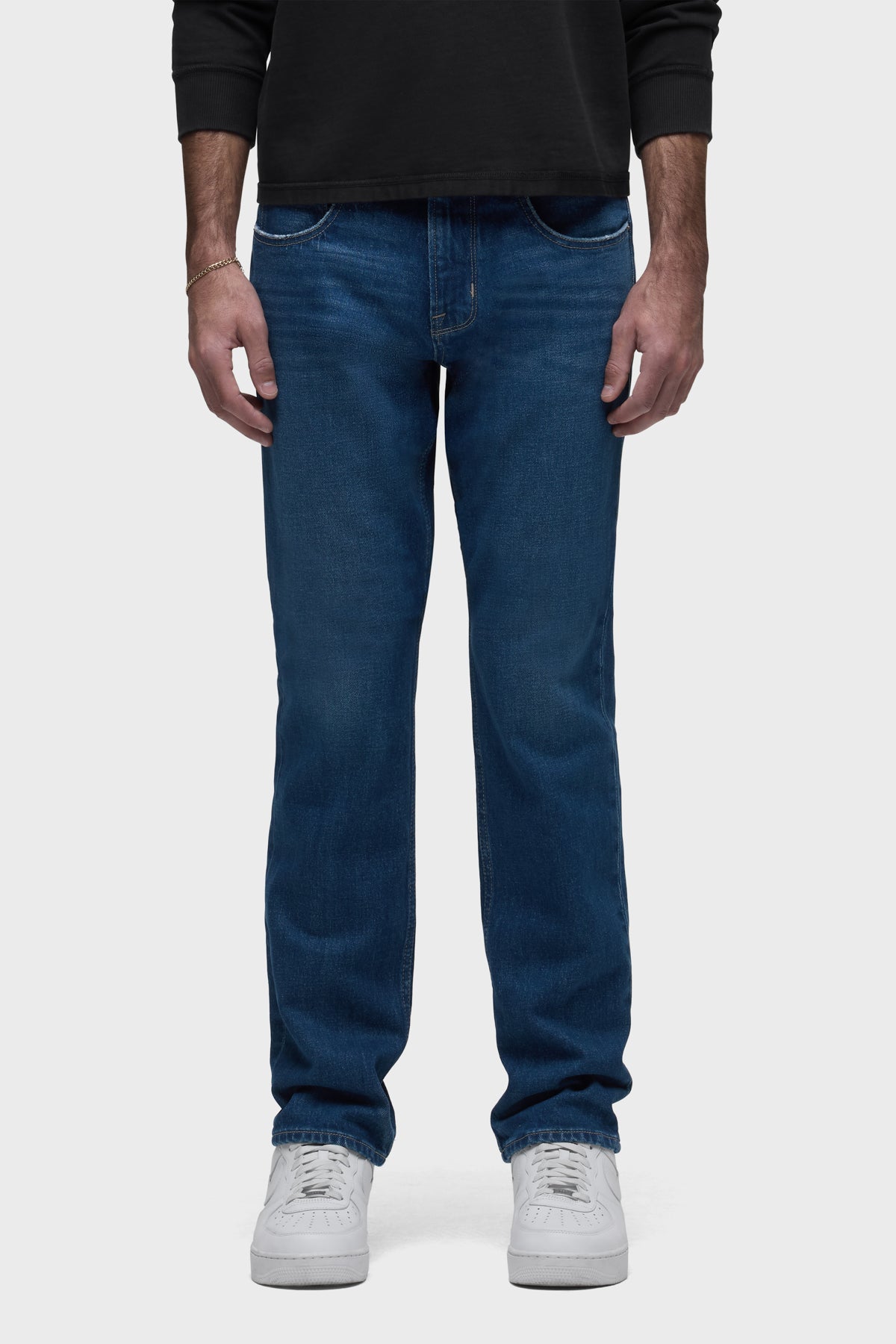 - The Byron is our most relaxed fit. Mid-rise, straight through the hip and thigh with a slim-straight leg. A classic. This pair features a medium-dark indigo wash, Sutton, and it is made of premium comfort stretch denim with classic five-pocket detailing.