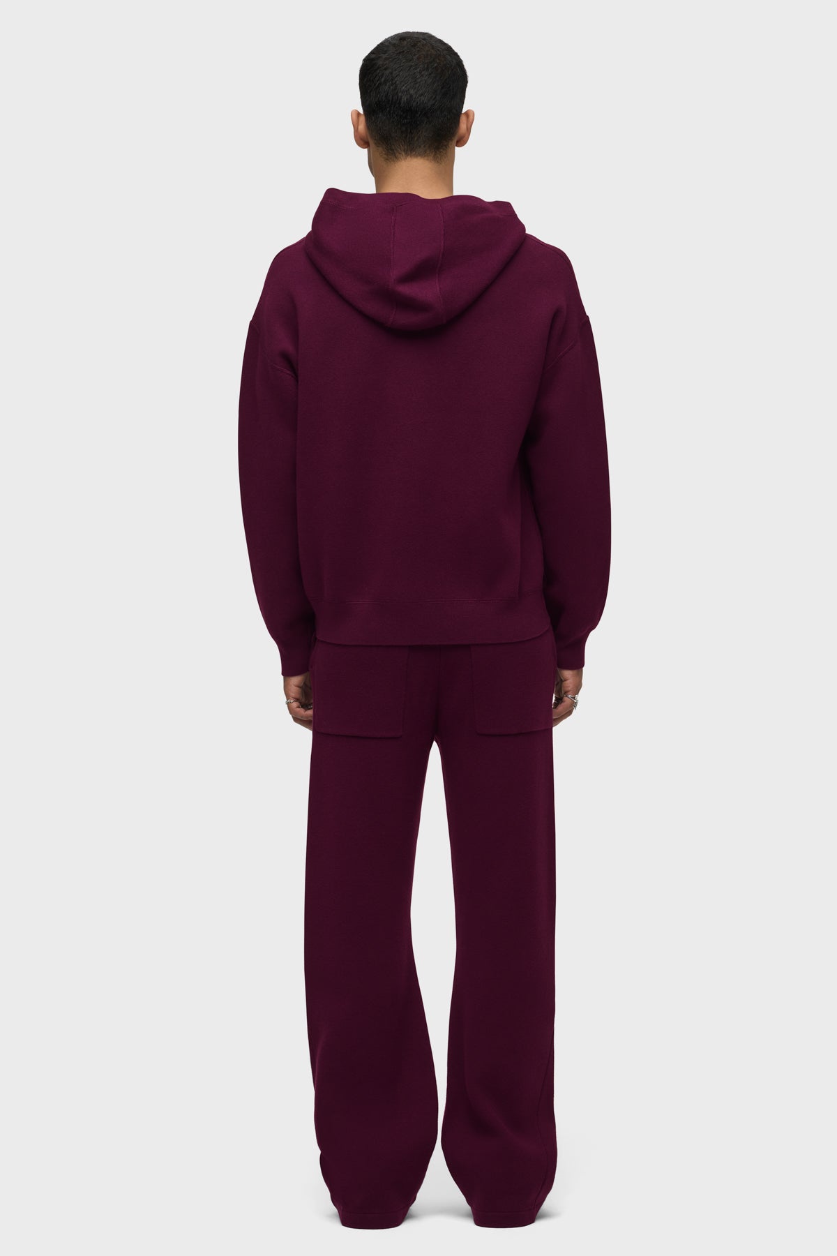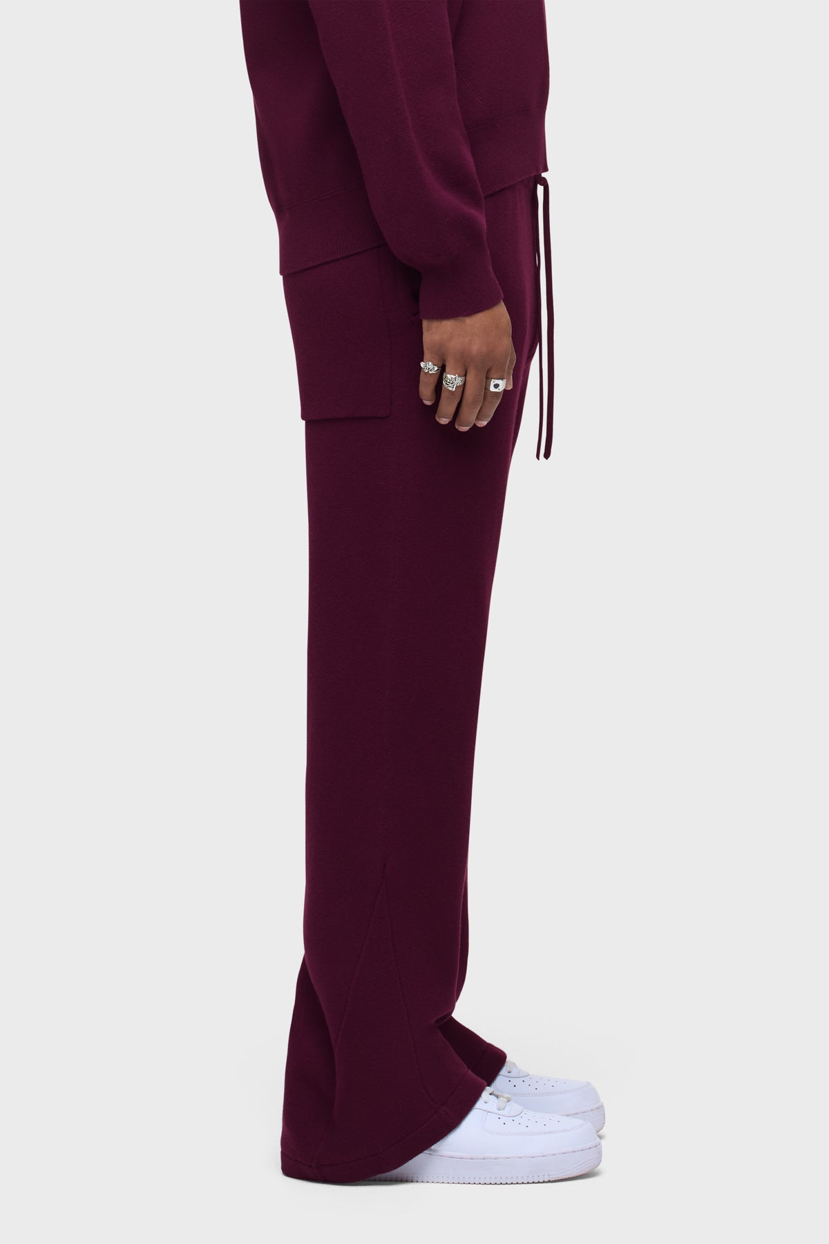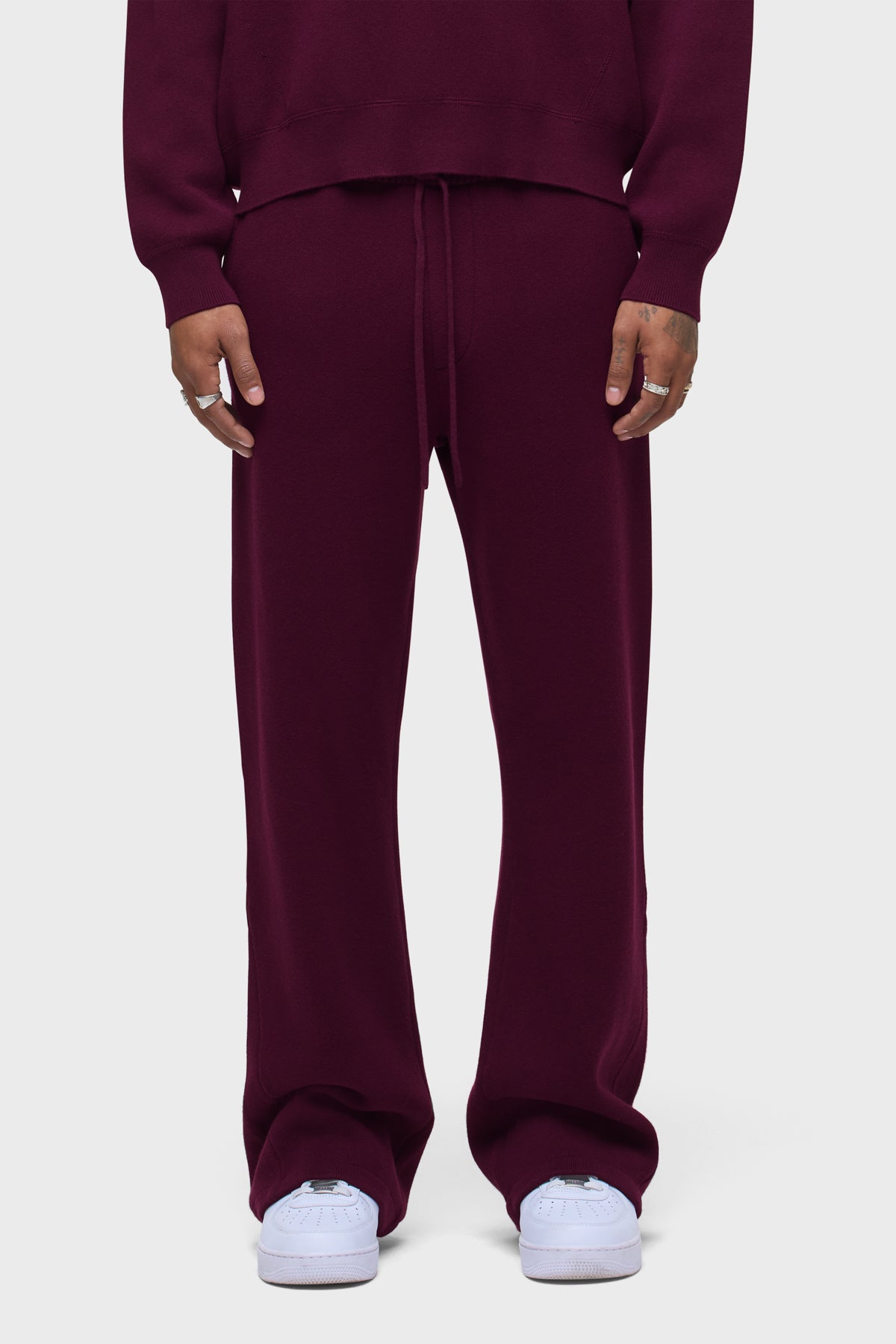 - The Double Knit Kick Flare in Bordeaux is designed with a relaxed fit, flared hem and drawcord elastic waistband. Made from a soft cotton-cashmere blend, this flared pant is finished with slash pockets, back patch pockets and gussets at the hem. Pair this pant with our coordinating Double Knit Hoodie to make it a complete set.