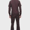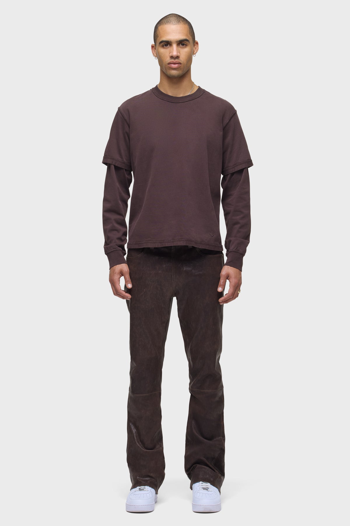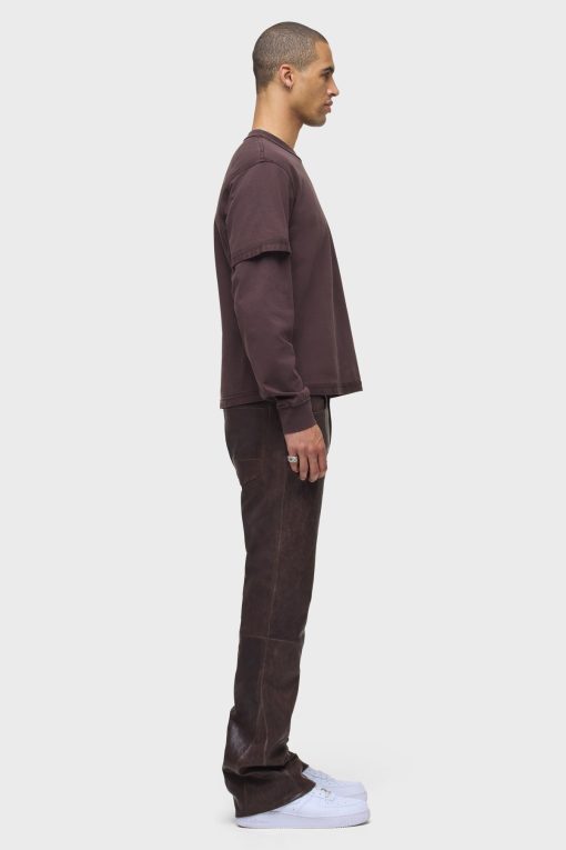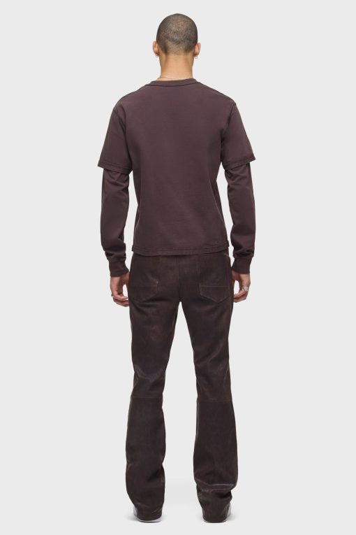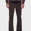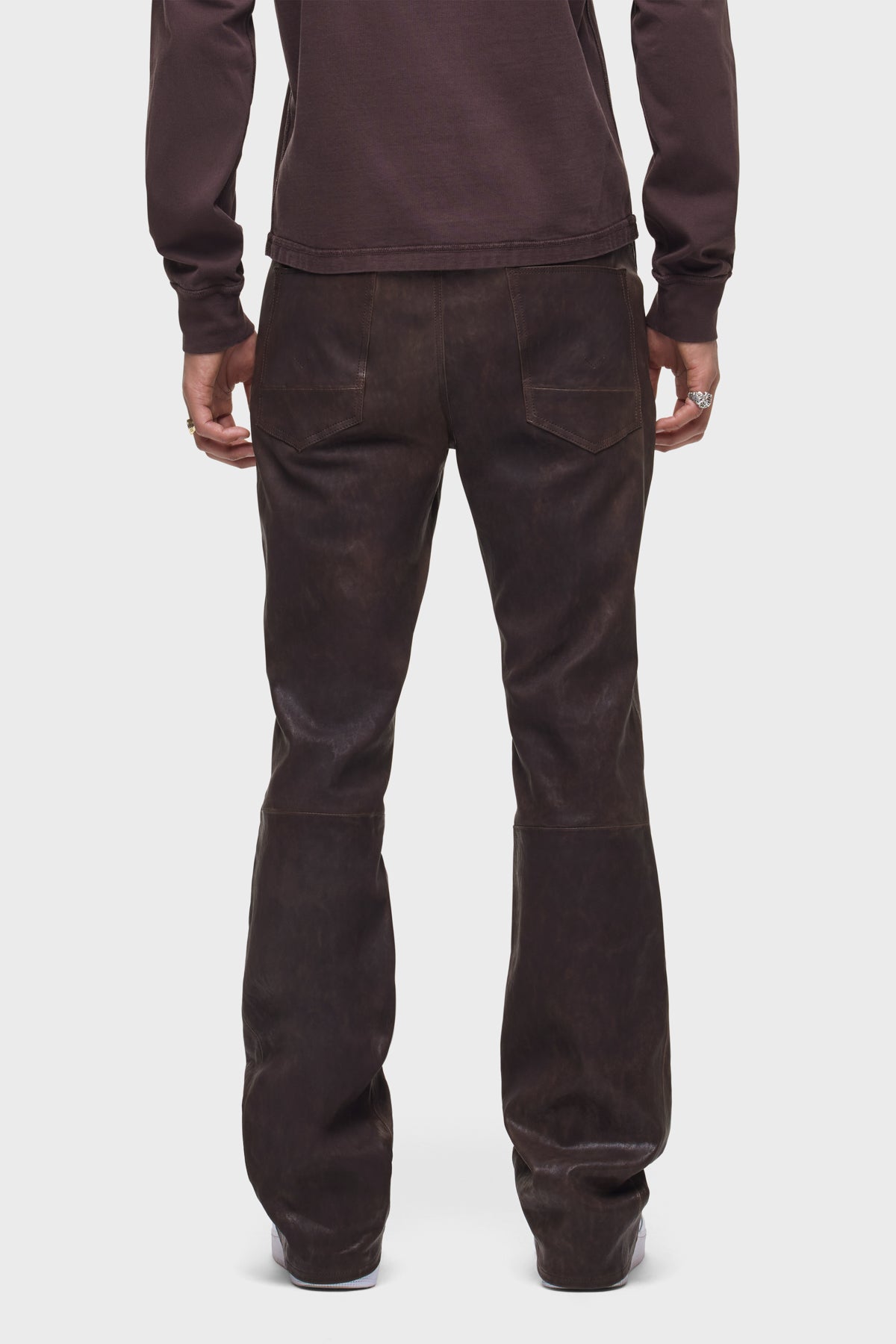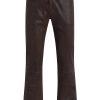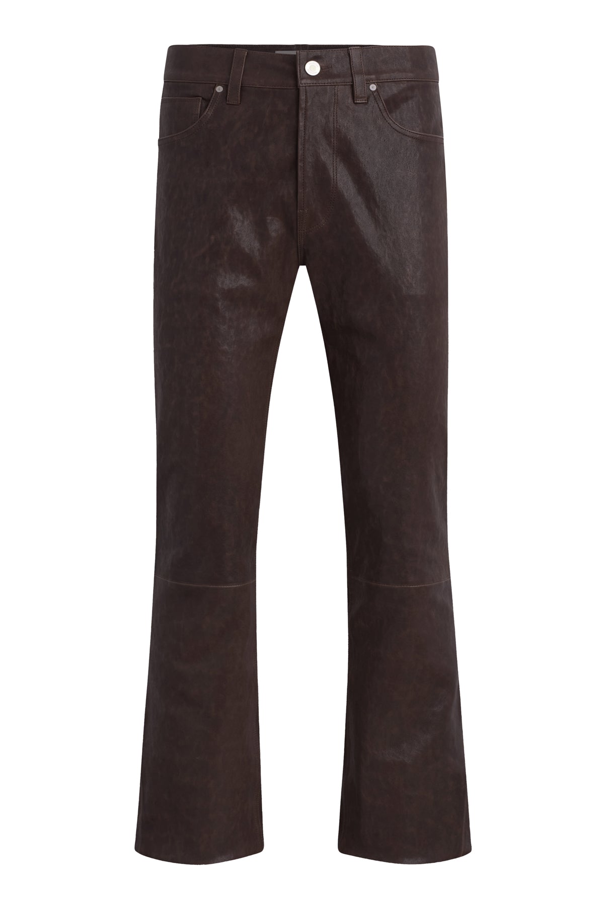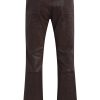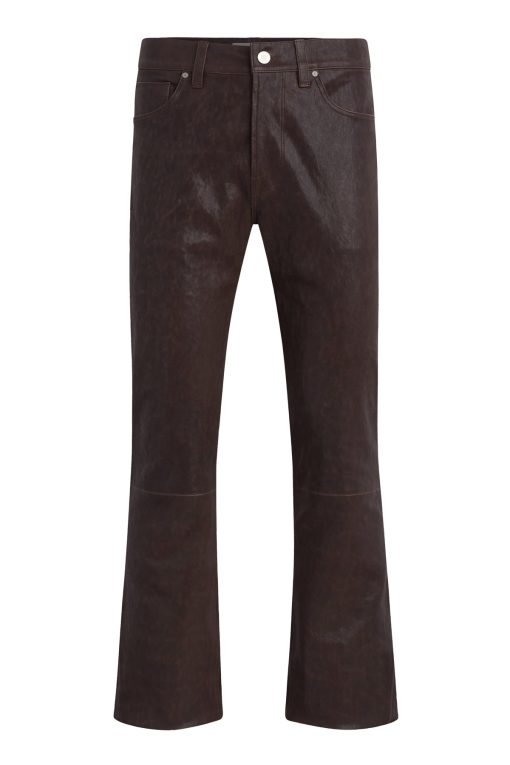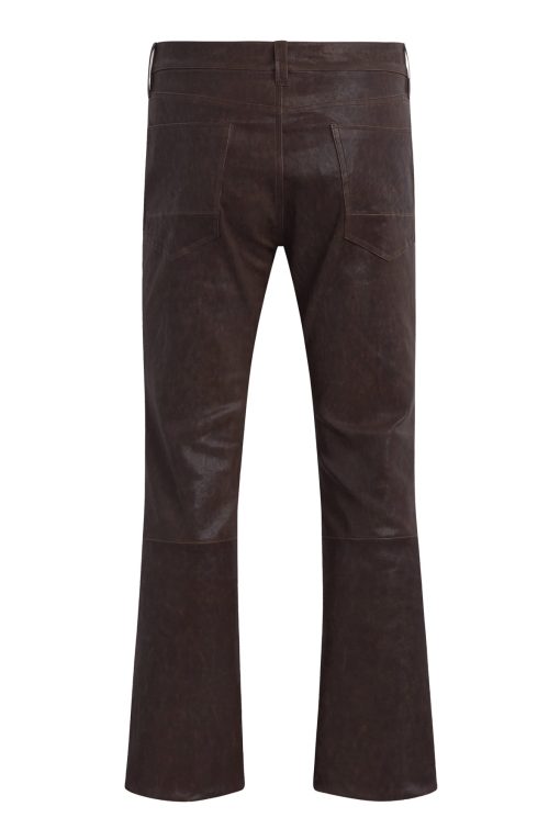 - Our Walker Kick Flare Pant in Distress Brown is mid-rise and slim through the hip and thigh with a flared bootcut hem. This pair features dark brown stretch leather with a distressed finish.