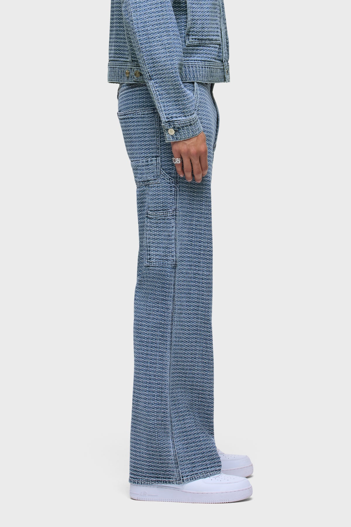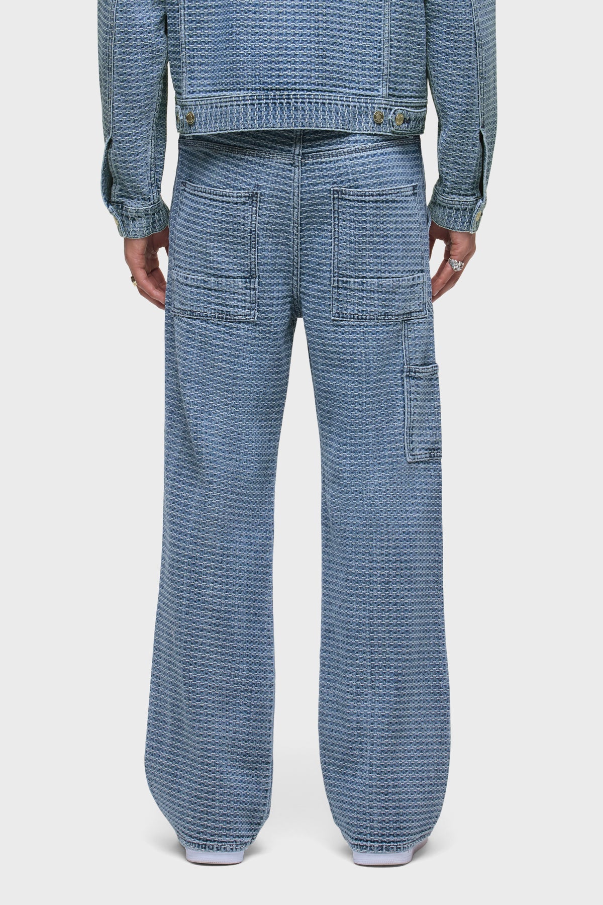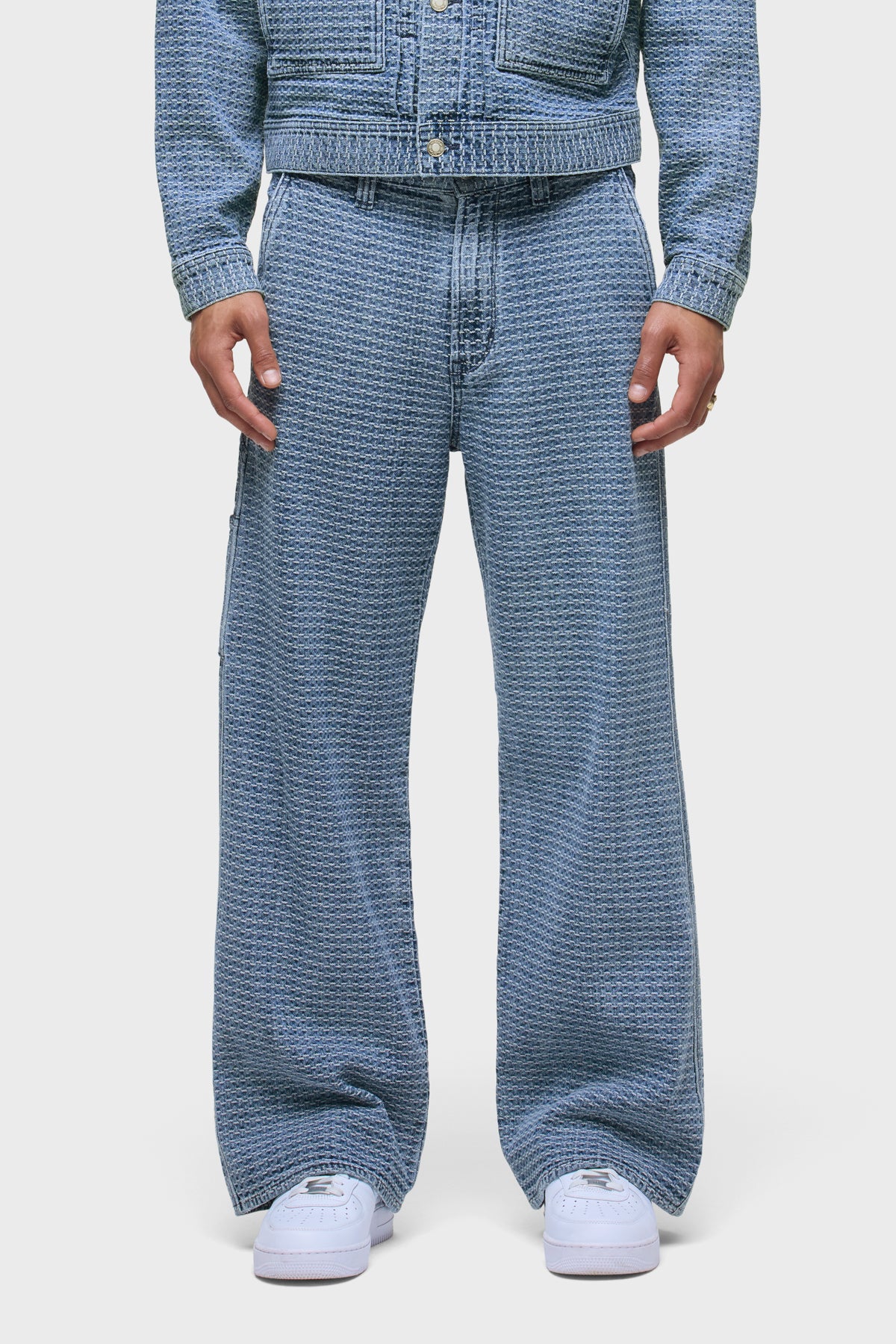 - With a 90s grunge look and feel, our Luca Wide Leg Carpenter Jean in Jacquard Indigo is a loose silhouette with a mid-rise waist and wide cut through the leg, now featured in an indigo jacquard fabrication for added visual interest and texture.