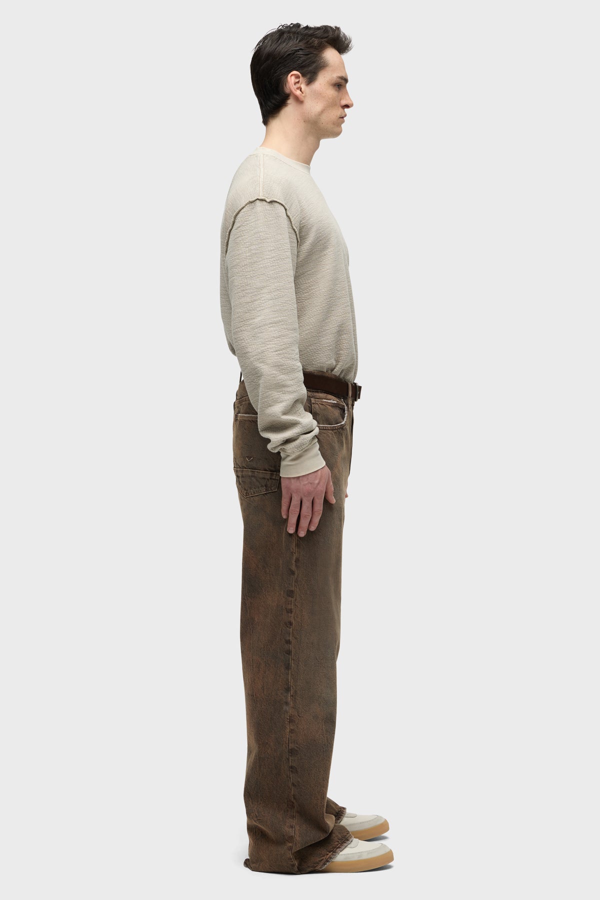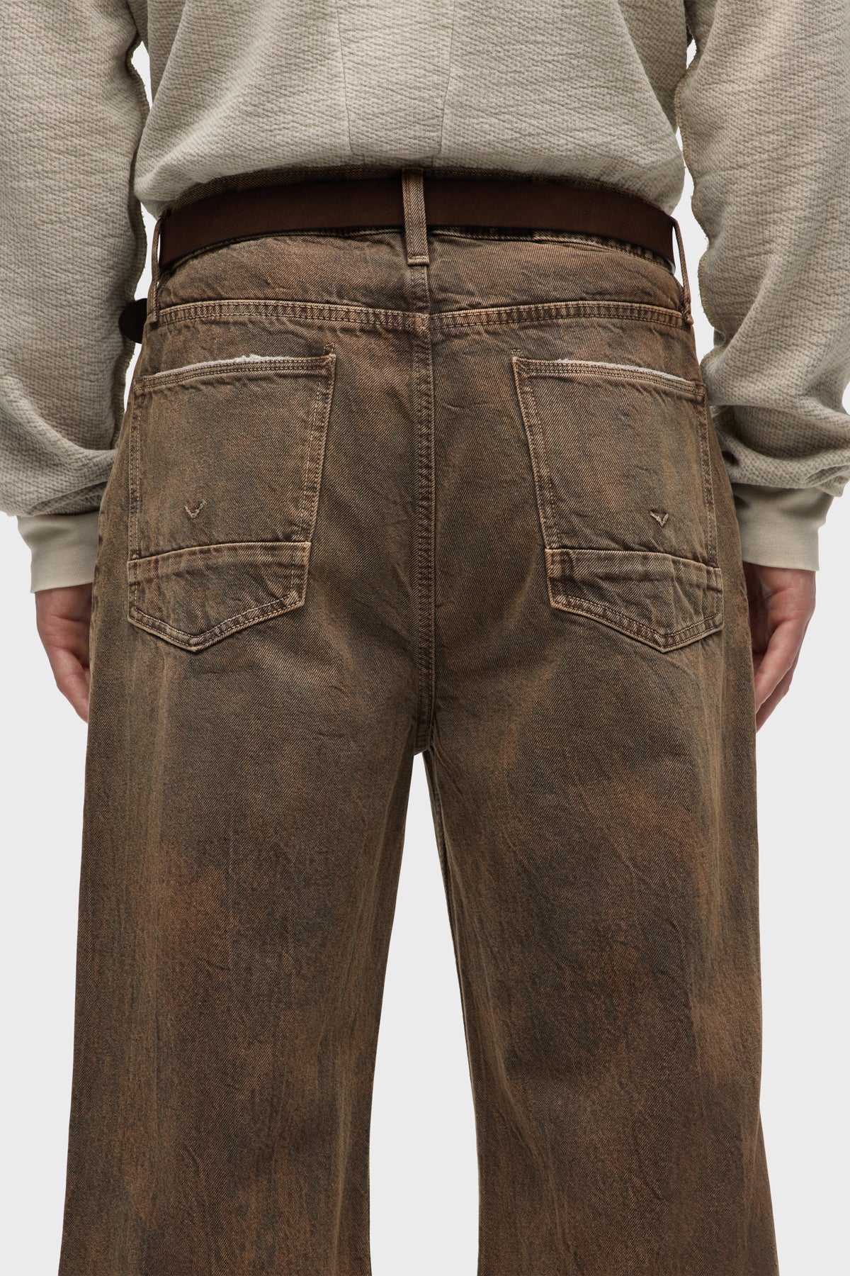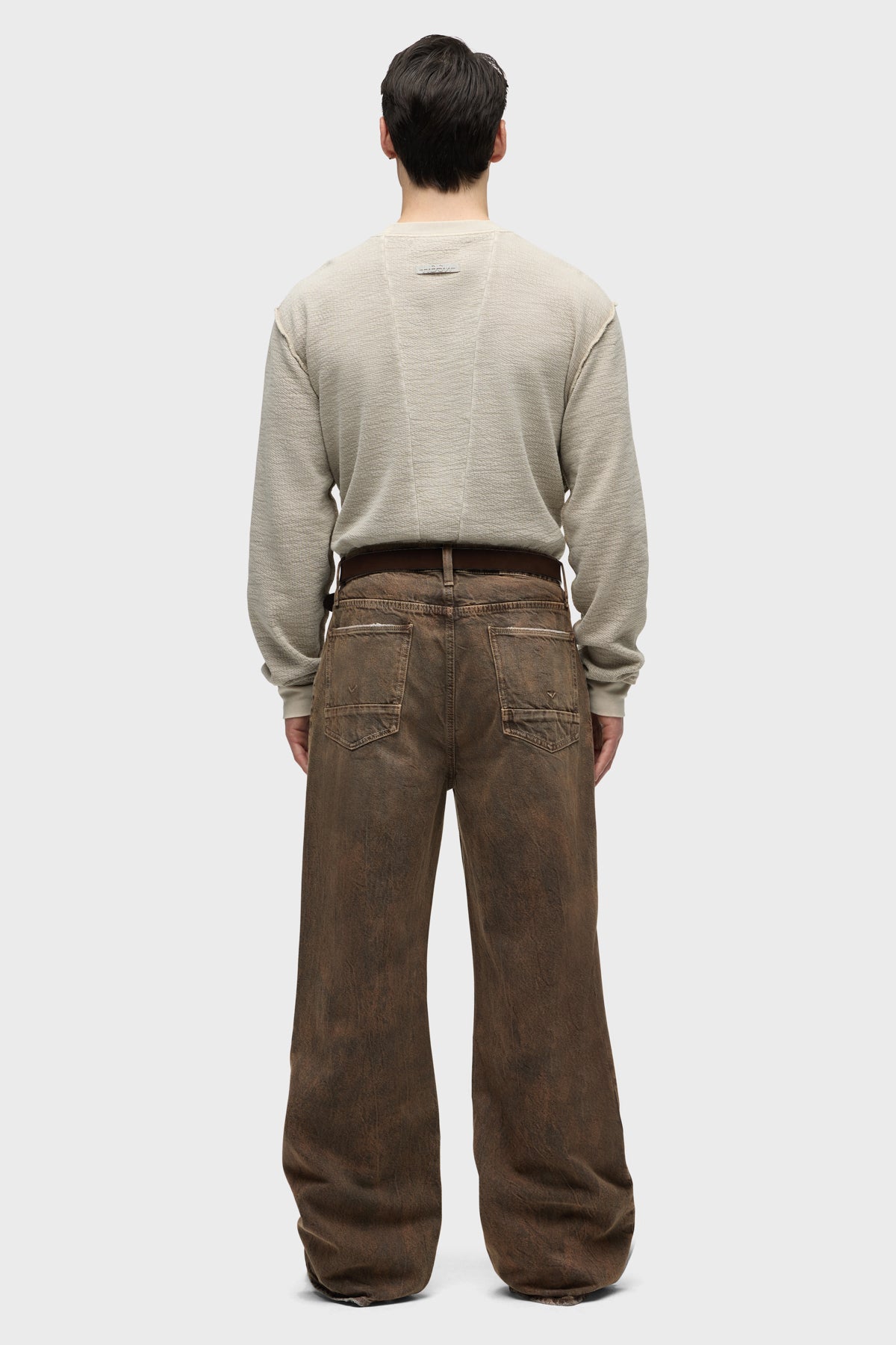 - With a 90’s grunge look and feel, our Luca Wide Leg Jean in Dark Earth has a loose fit, mid-rise waist and is wide cut through the leg. The distressed dark brown wash is overdyed for a lived-in, stained look and is finished with five-pocket detailing, grinding along the edges and matte grey hardware with signature embroidery at the waistband.