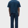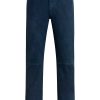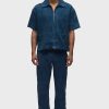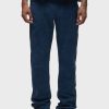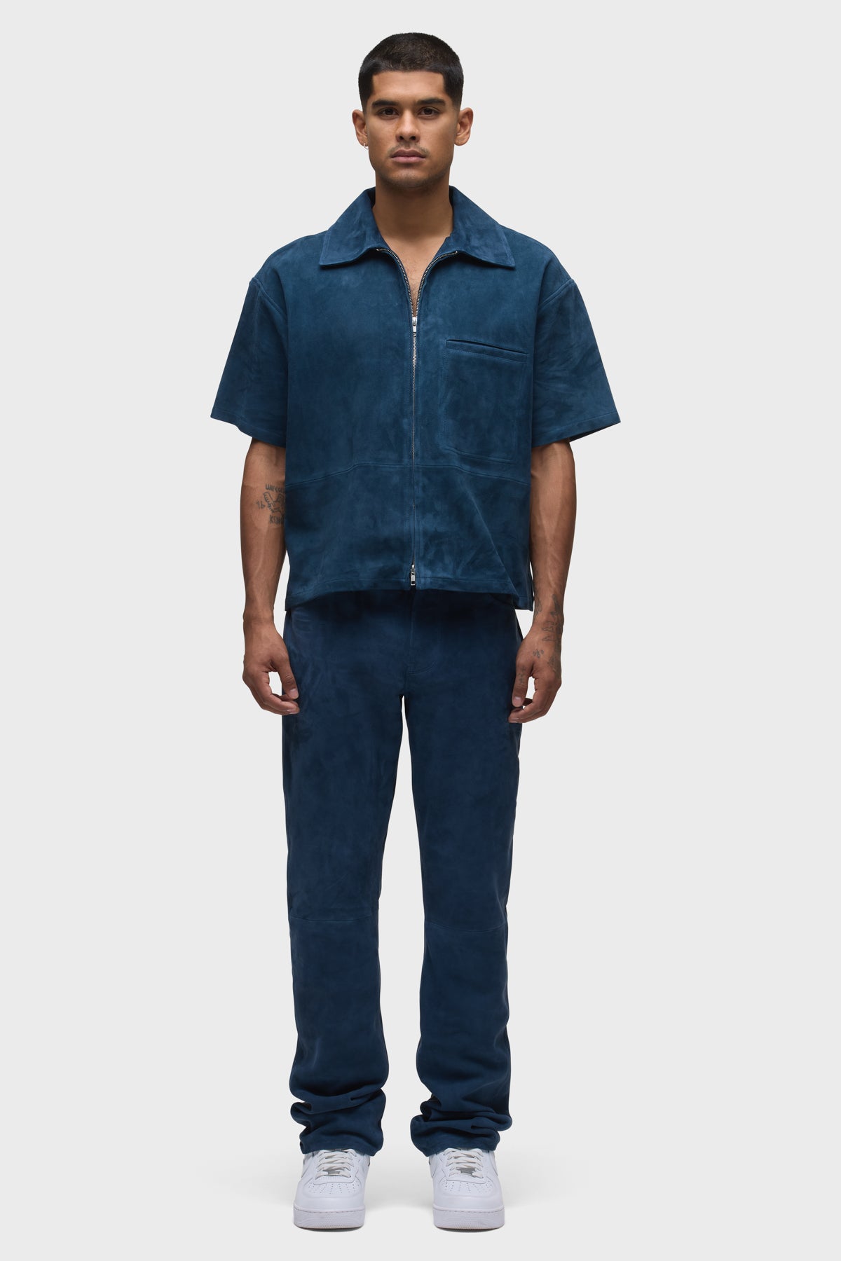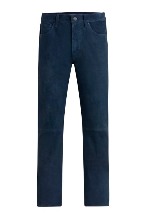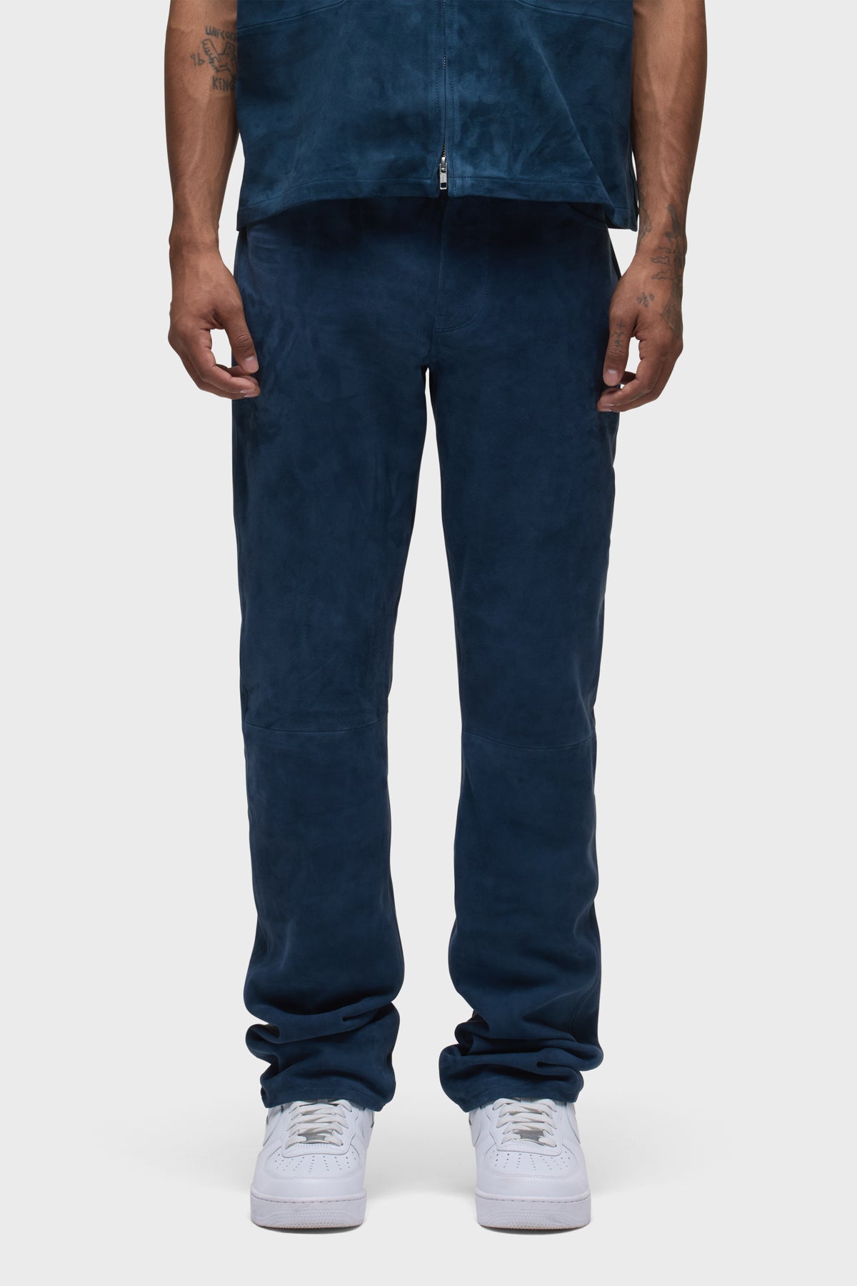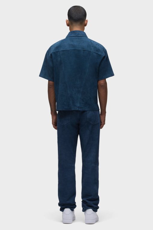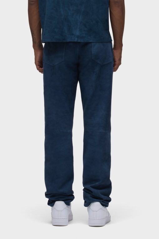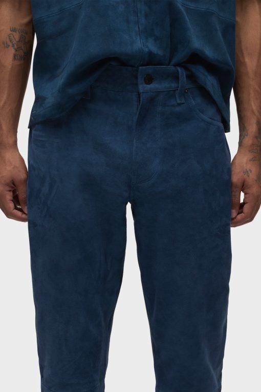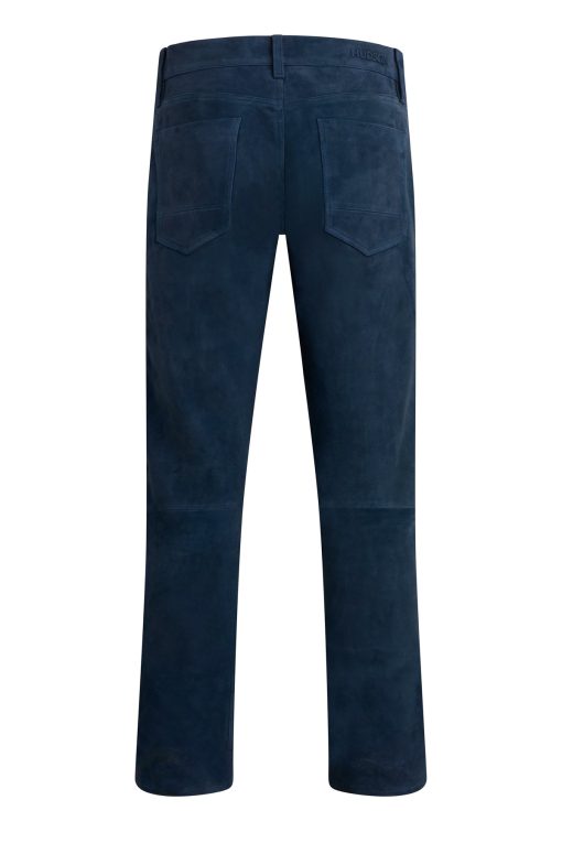 - Mid-rise, slim through the hip and thigh with a tapered leg. Petrol is cut from premium medium-blue suede with five-pocket details, matte black hardware and signature embossed logo at back waistband.