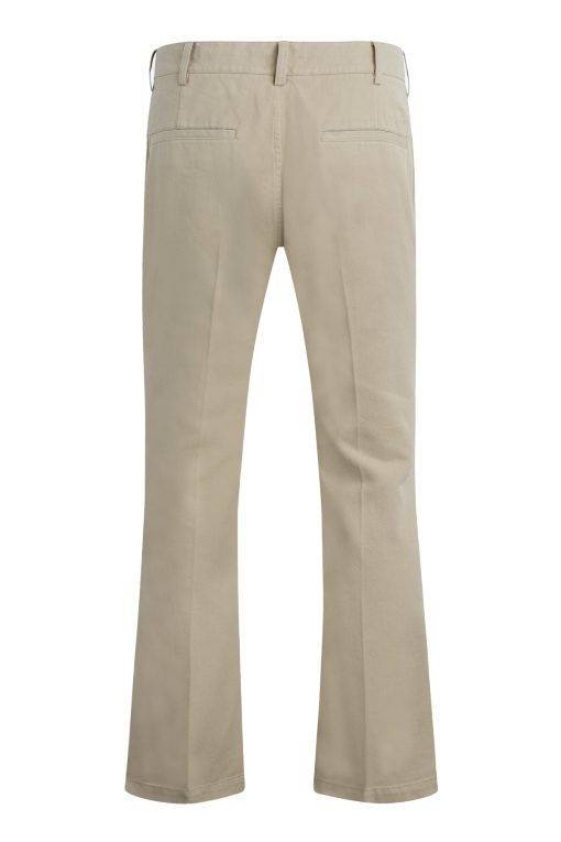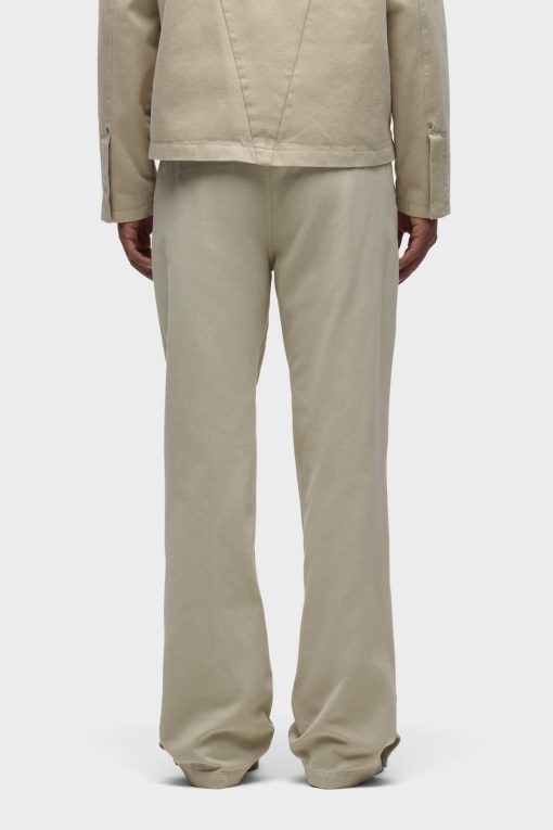 - Our Walker Trouser Pant is an easy, mid-rise fit with a flared bootcut hem, track-inspired details, slash front pockets and back welt pockets. This pair is cut from 100% cotton twill, then overdyed in a dark ecru shade, Desert, and finished with hidden hem snaps, a hook-and-eye closure, and our signature “V” embroidery above the wearer’s right back pocket.