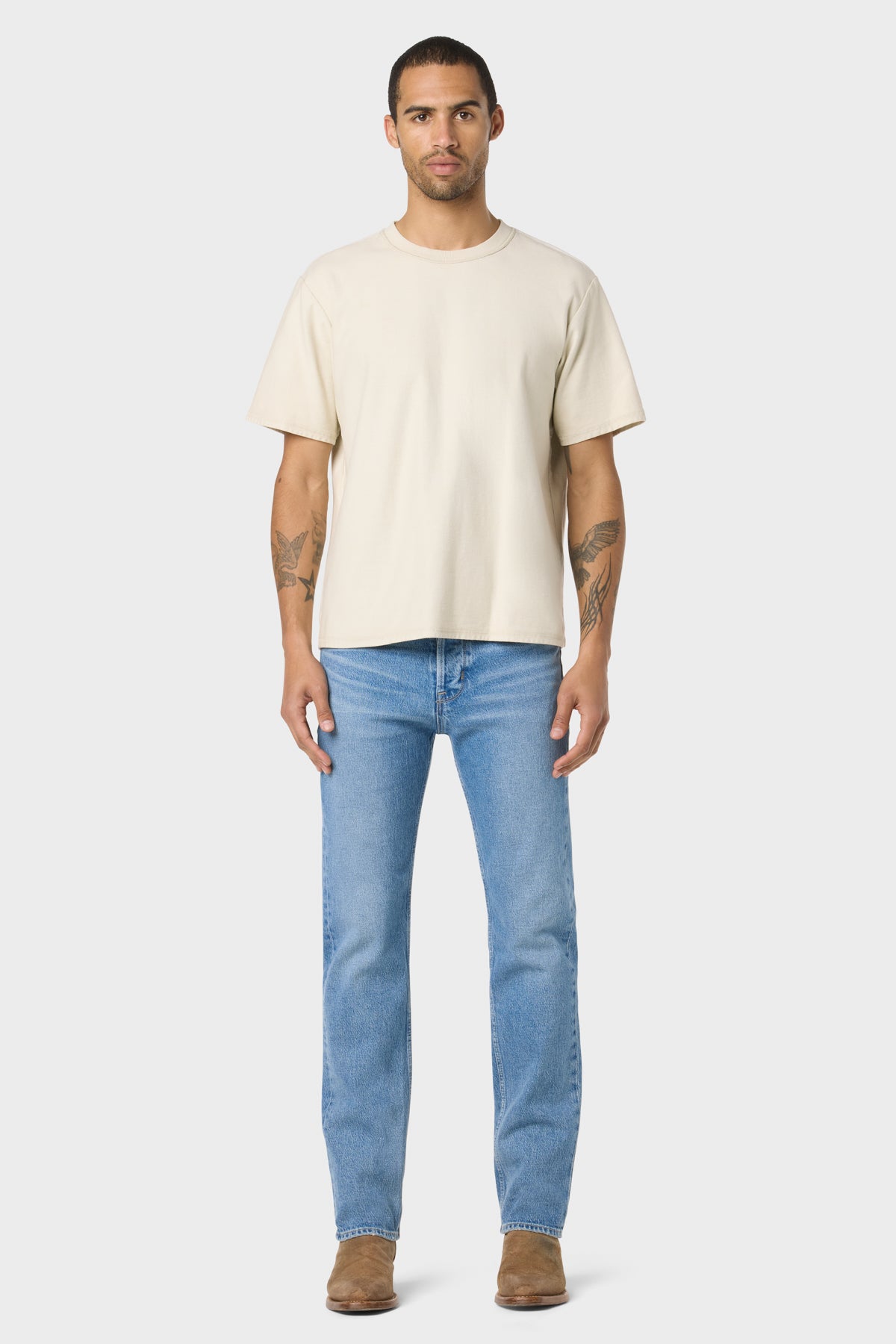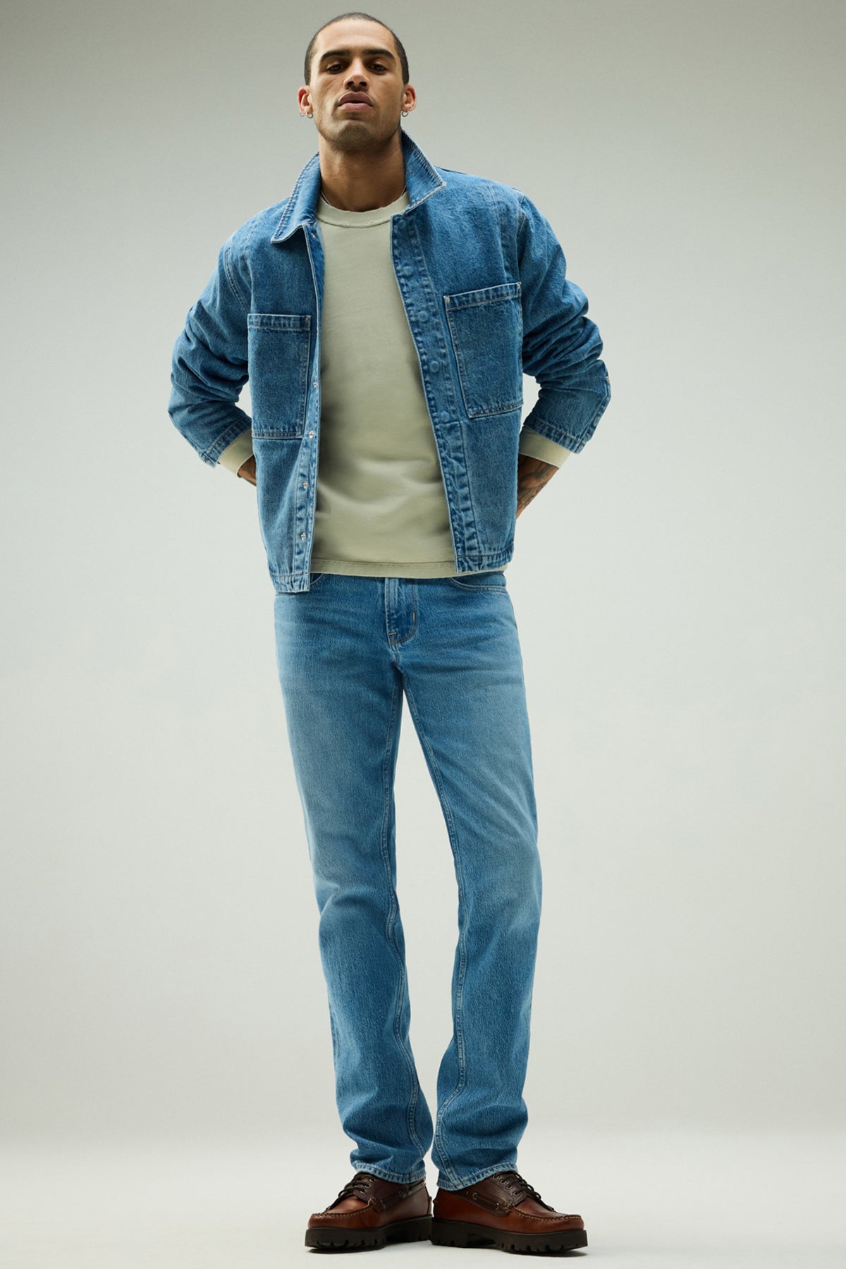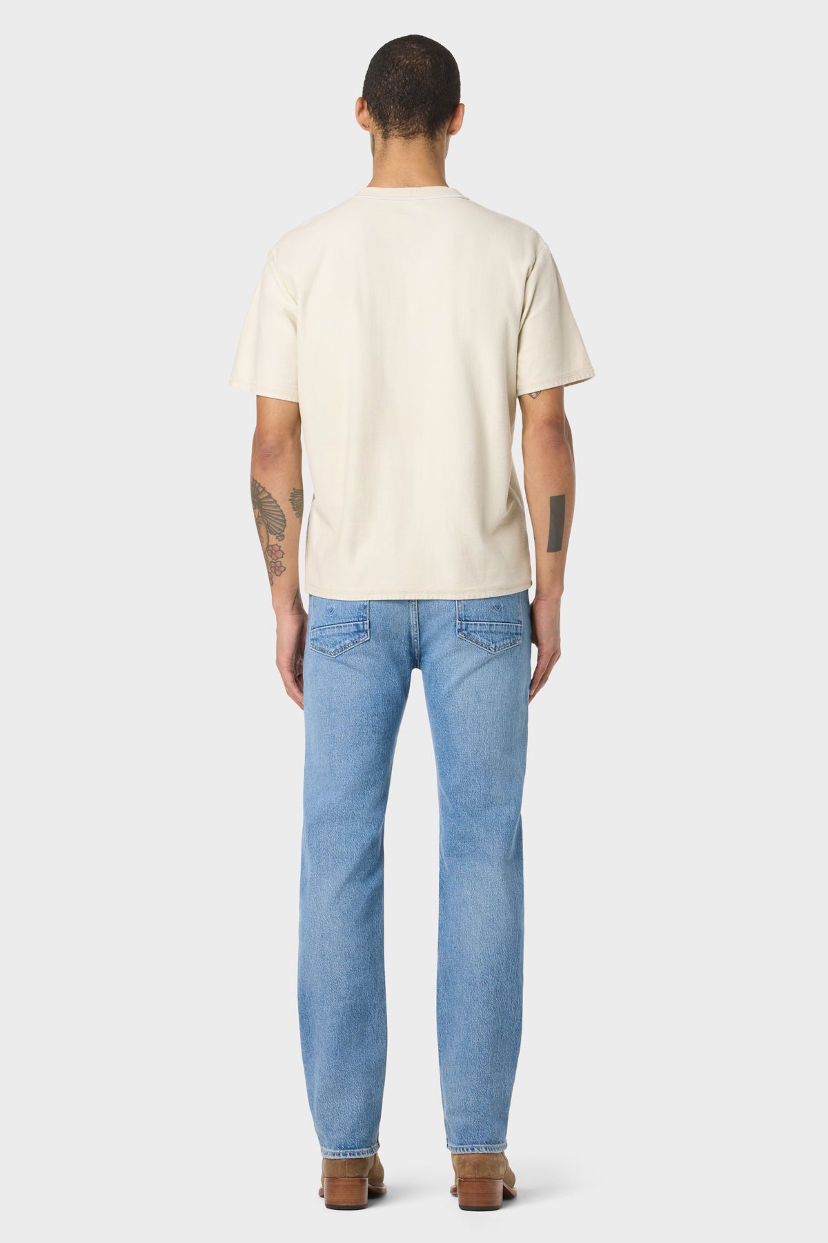 - The Wes Classic Straight Leg Jean is a mid-rise, easy straight leg that fits slim through the hip. The light indigo Valley wash is made from premium comfort stretch denim with subtle grinding along the edges, whiskering and contrast topstitching. Finished with five-pocket construction, button fly, dull nickel hardware with copper rivets and grey leather back patch.