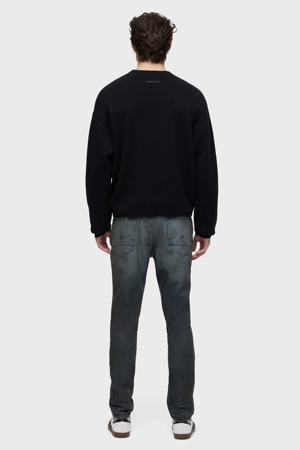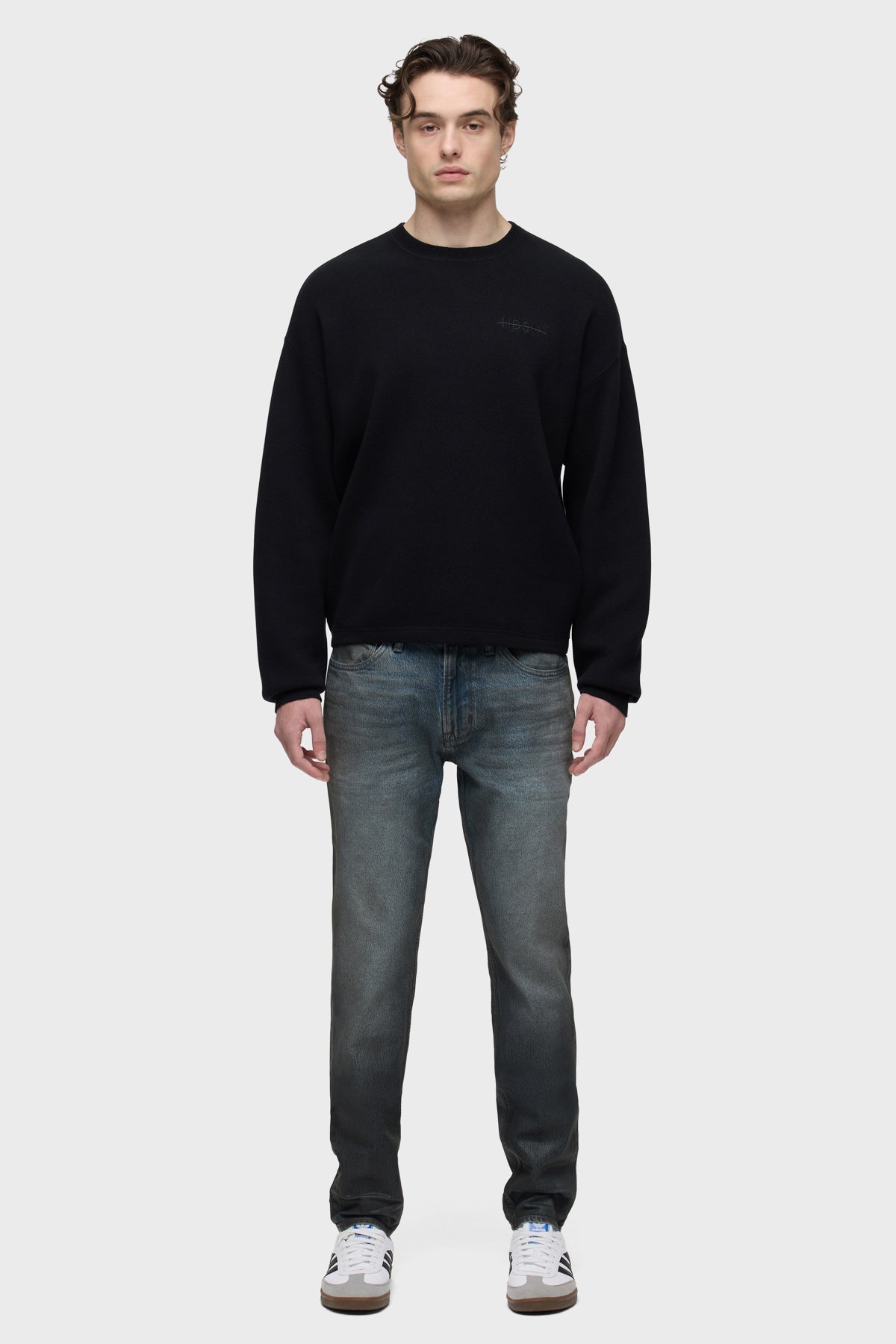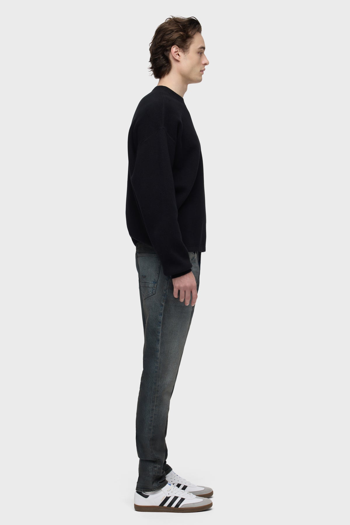 - For a snug fit, look no further than our Zack Skinny Jean. Mid-rise, slim through the hip and thigh with a narrow leg and 34” inseam. Done in premium comfort stretch denim with a medium, vintage-inspired Coated Charcoal wash and a mist coating for subtle sheen and uneven pigmentation. Dull nickel hardware and signature embroidery on back waistband finish the look.