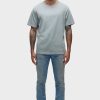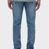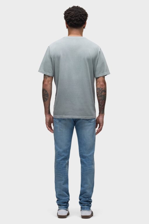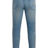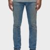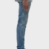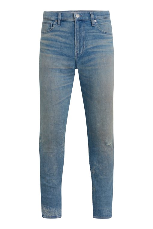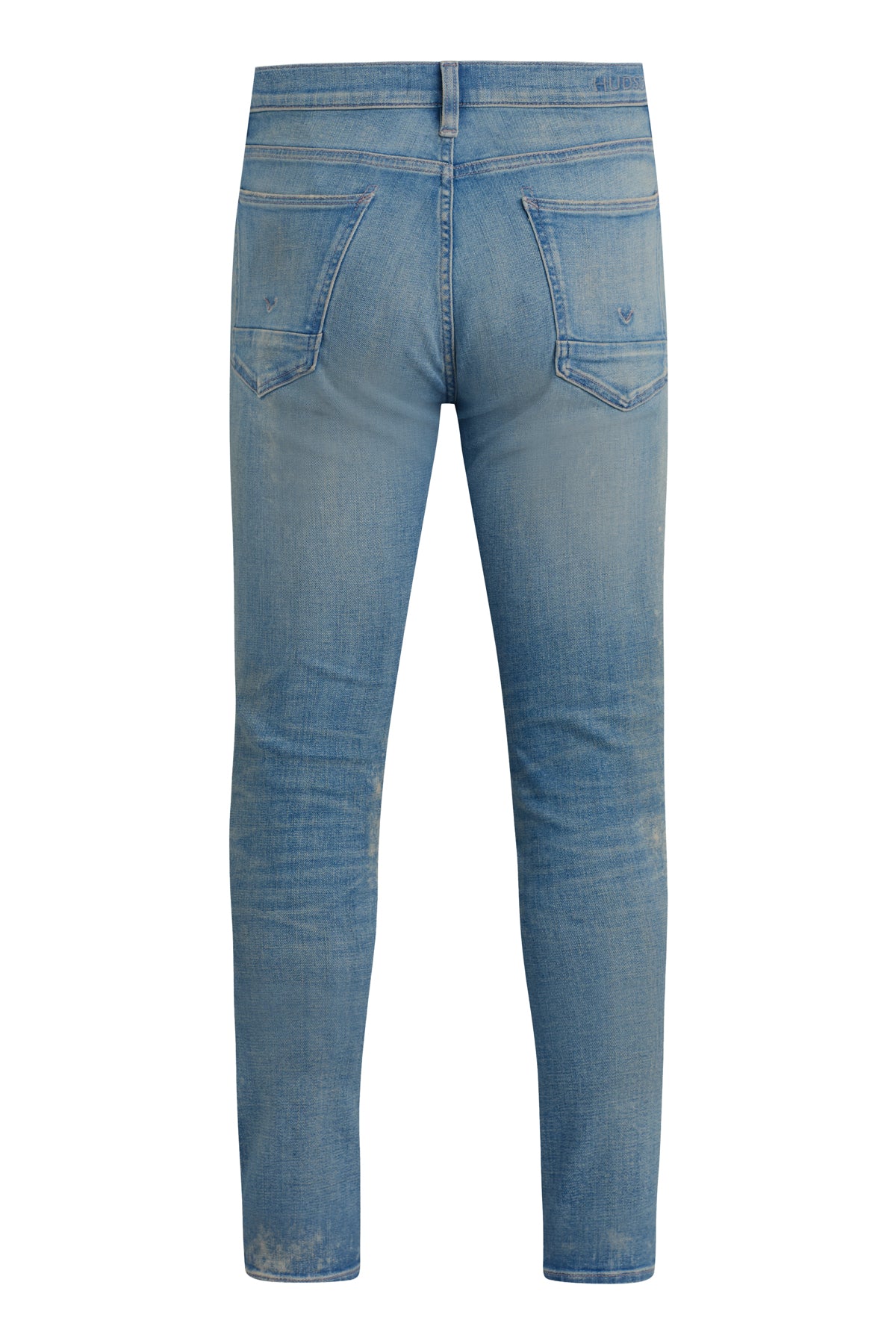 - For a snug fit, look no further than our Zack Skinny Jean. Mid-rise, slim through the hip and thigh with a narrow leg and 34” inseam. This pair is made of comfort stretch denim in a medium indigo wash, Ocean Ave, with heavy stone washing, bleaching, all-over hand-sanding, whiskering and edge grinding. All-over pigment splatter, brown pigment spray and all-over bleach splatter finish the look.
