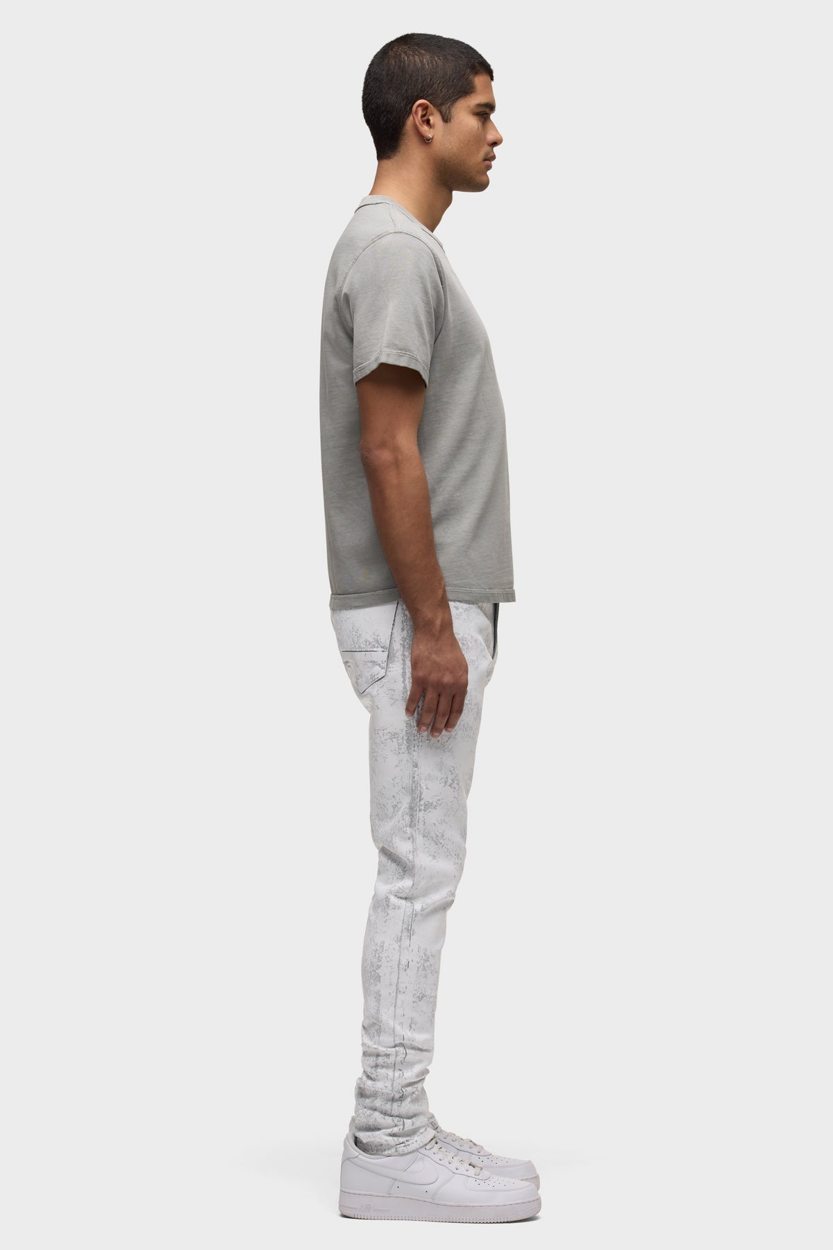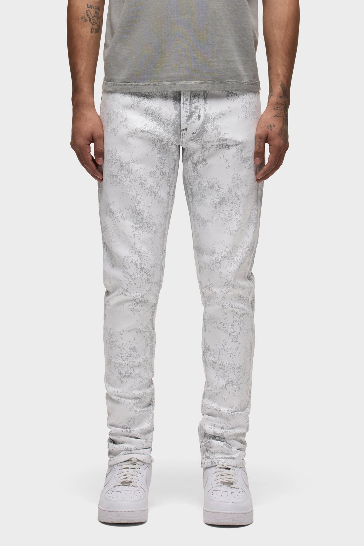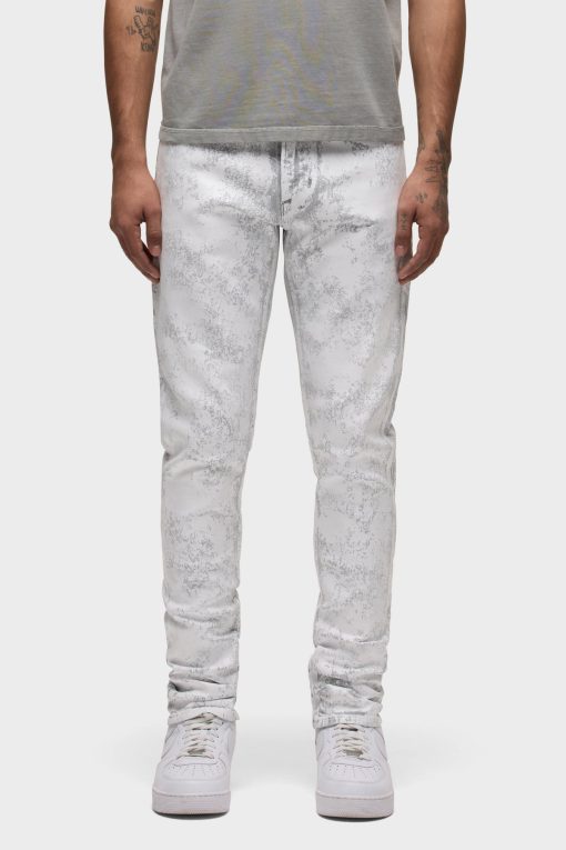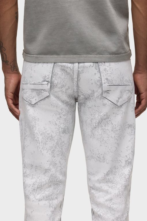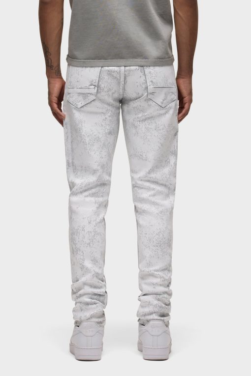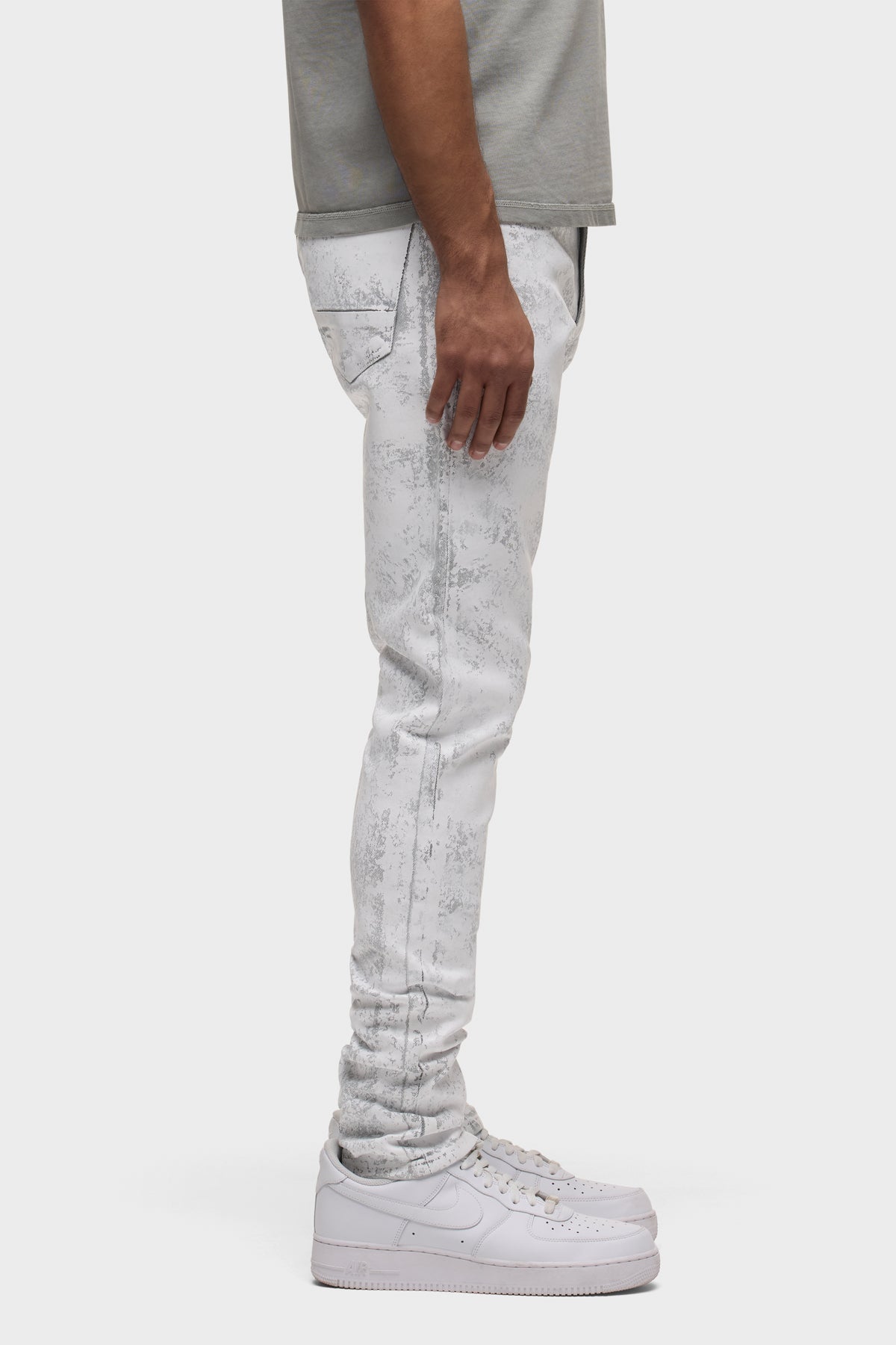 - For a snug fit, look no further than our Zack Skinny Pant. Mid-rise, slim through the hip and thigh with a narrow leg and 34” inseam. This pair is made of stretch twill in a spotty white wash, White Shatter. Matte grey hardware and a signature grey leather patch on the back waistband finish the look.