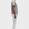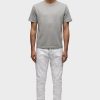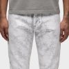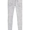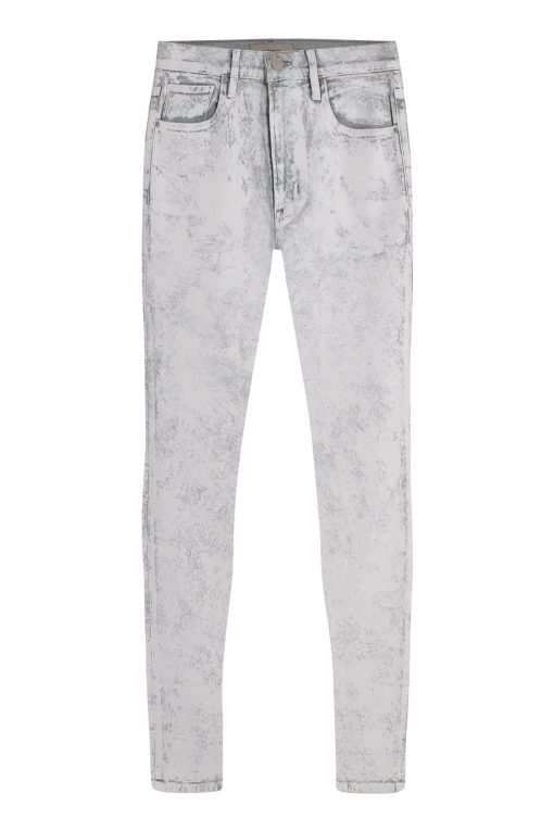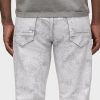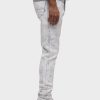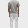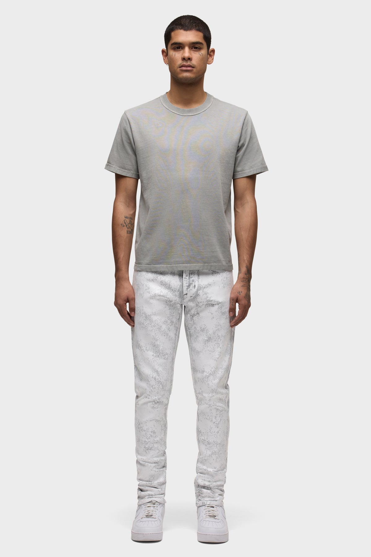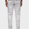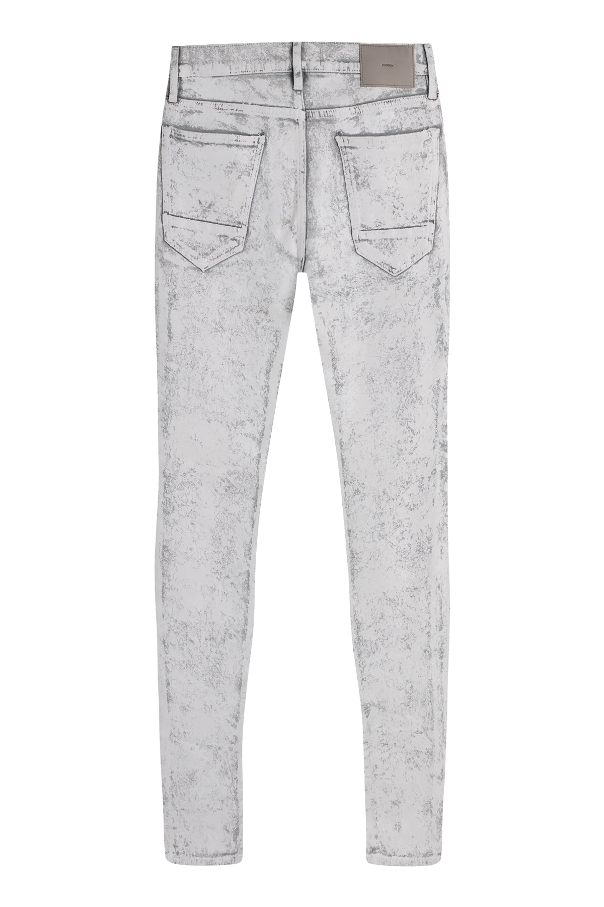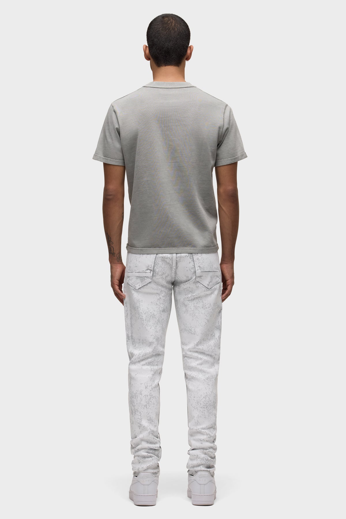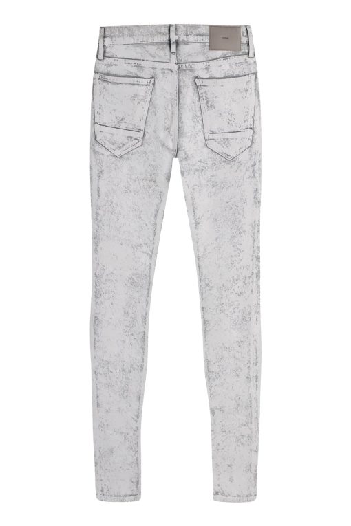 - For a snug fit, look no further than our Zack Skinny Pant. Mid-rise, slim through the hip and thigh with a narrow leg and 34” inseam. This pair is made of stretch twill in a spotty white wash, White Shatter. Matte grey hardware and a signature grey leather patch on the back waistband finish the look.
