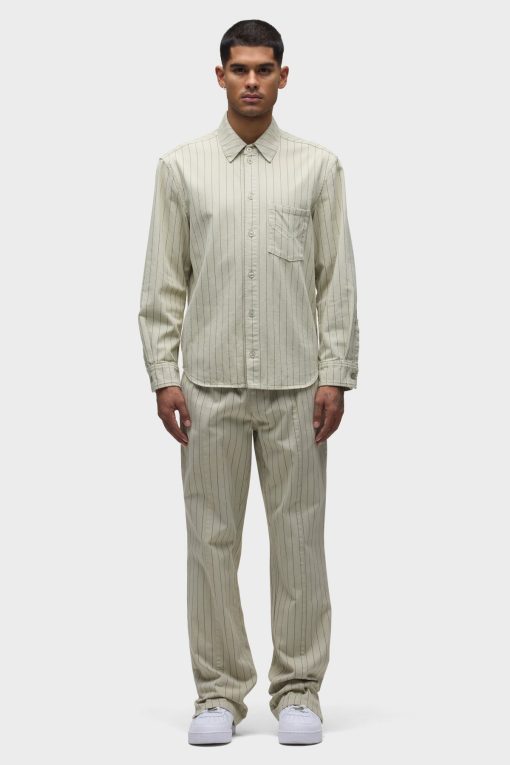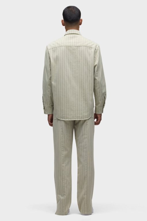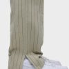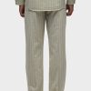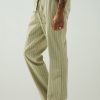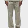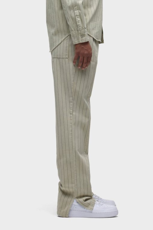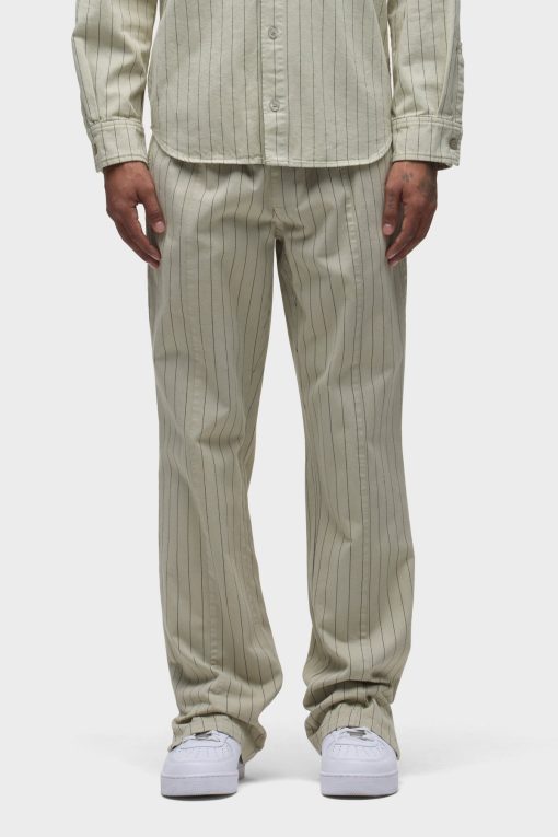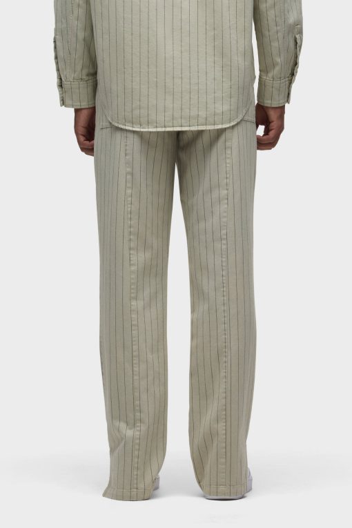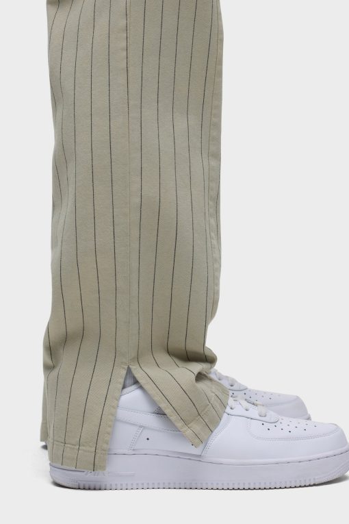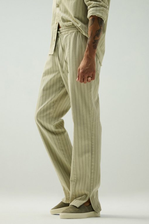 - Our Trouser Pant in Pinstripe has a relaxed fit and is crafted in overdyed ecru pinstripe fabric for a dressy yet casual look. This pair features an elastic waistband with a tonal drawcord, side slash pockets, back patch pockets and a bottom hem slit.