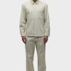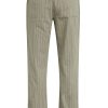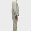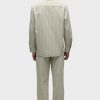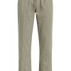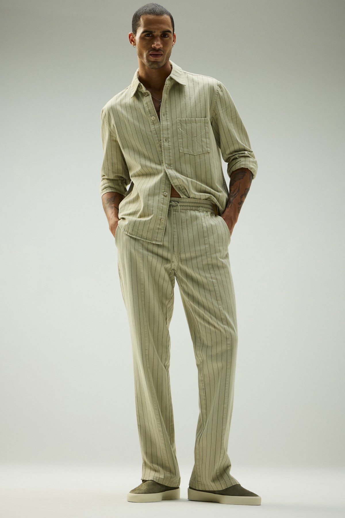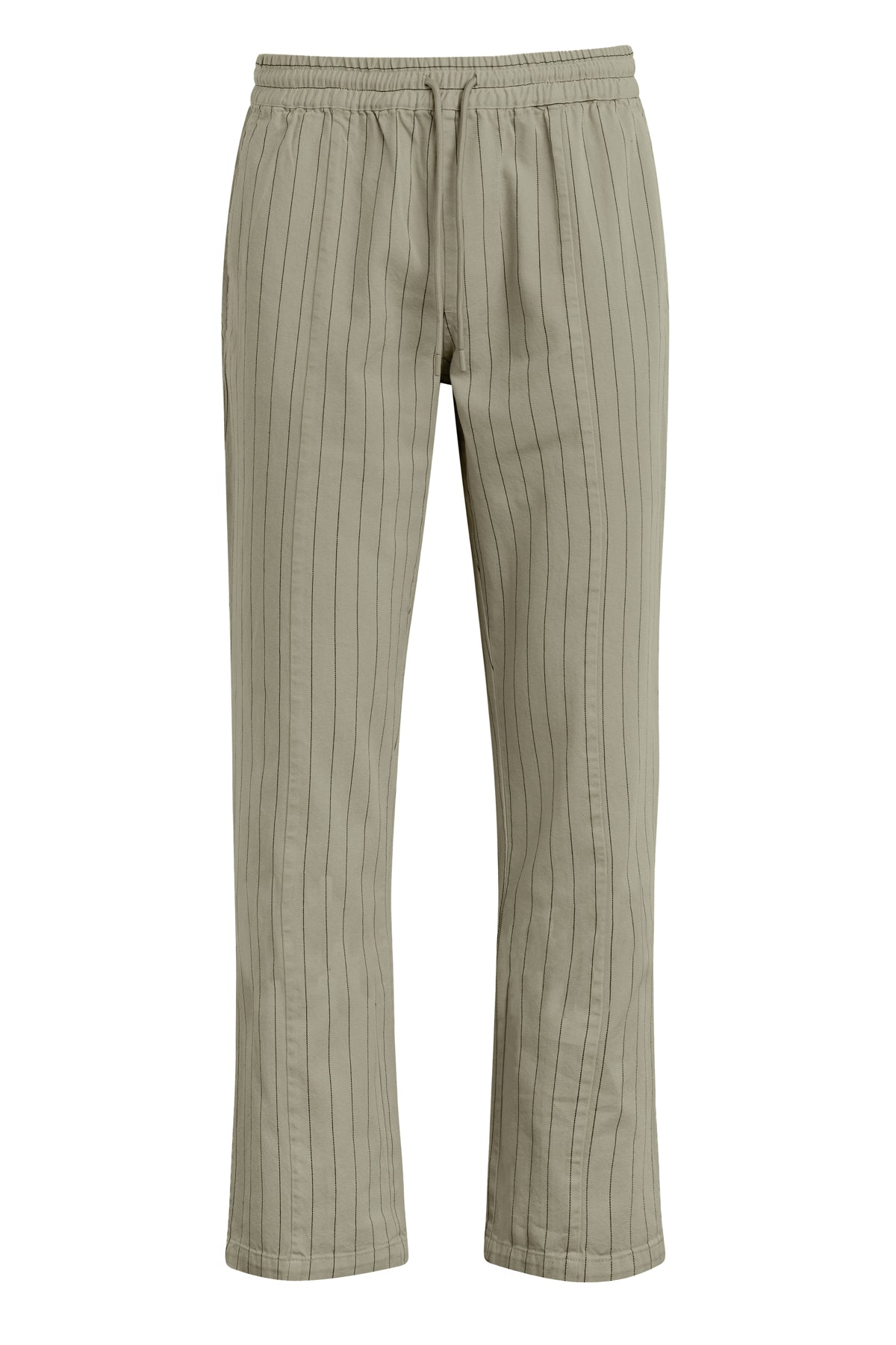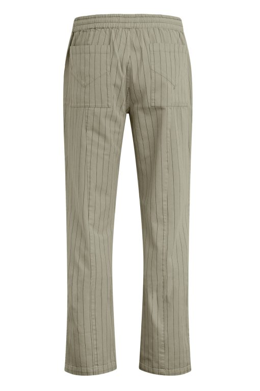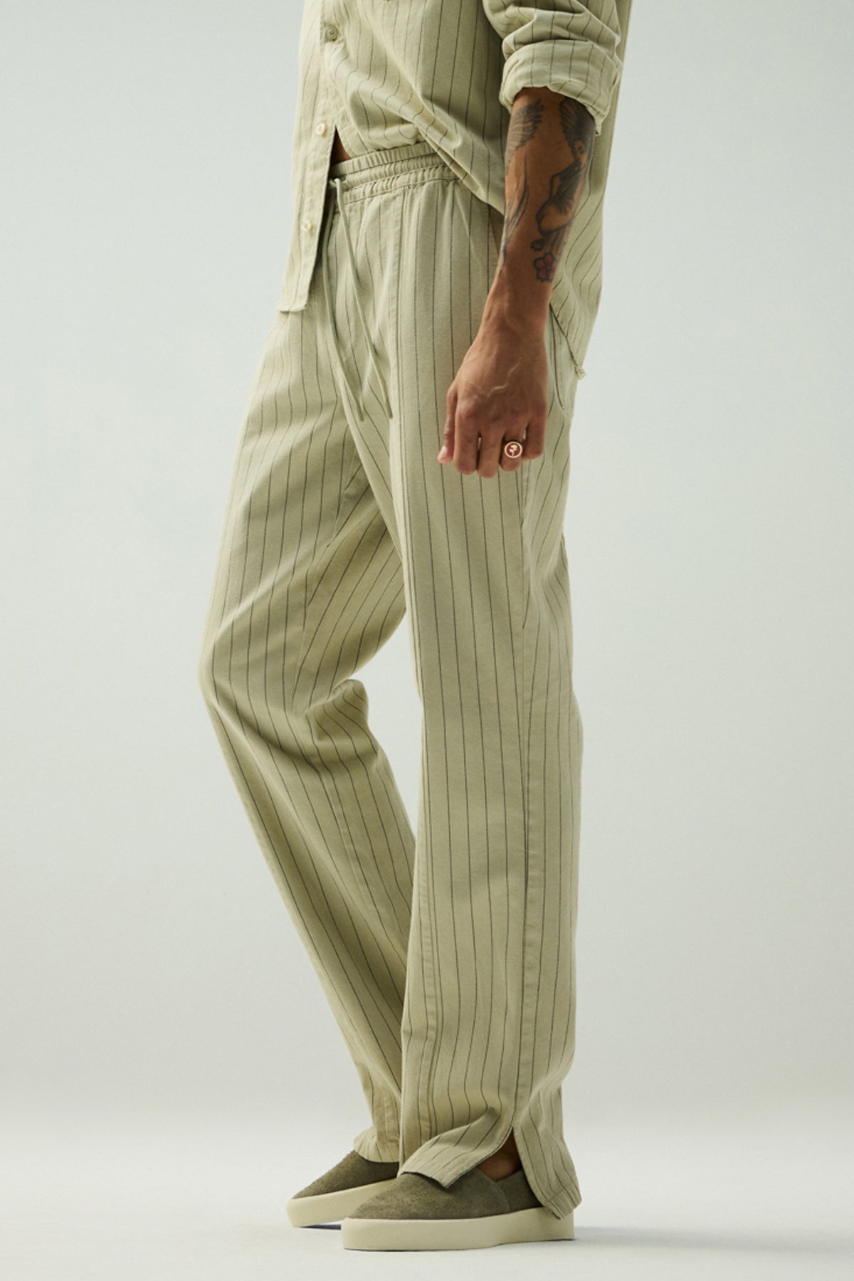 - Our Trouser Pant in Pinstripe has a relaxed fit and is crafted in overdyed ecru pinstripe fabric for a dressy yet casual look. This pair features an elastic waistband with a tonal drawcord, side slash pockets, back patch pockets and a bottom hem slit.