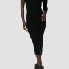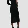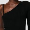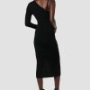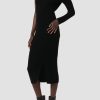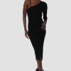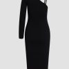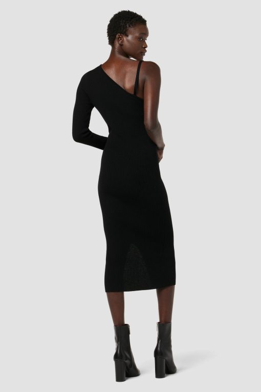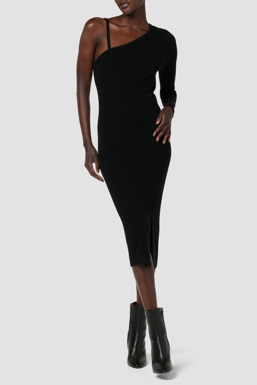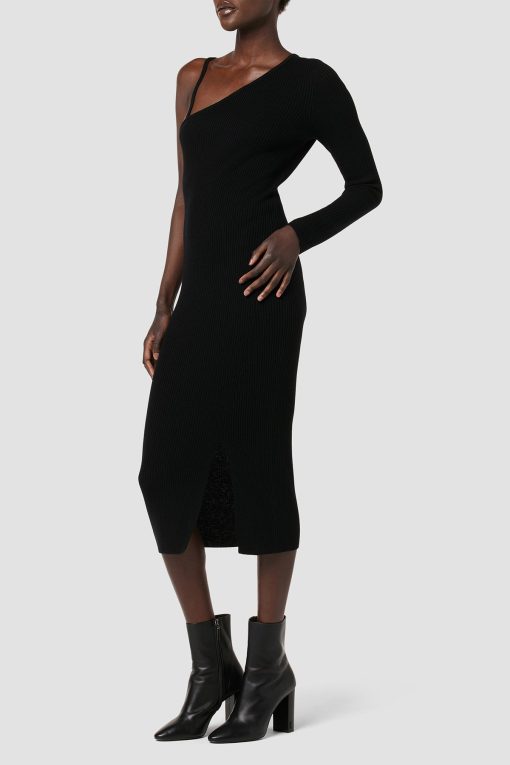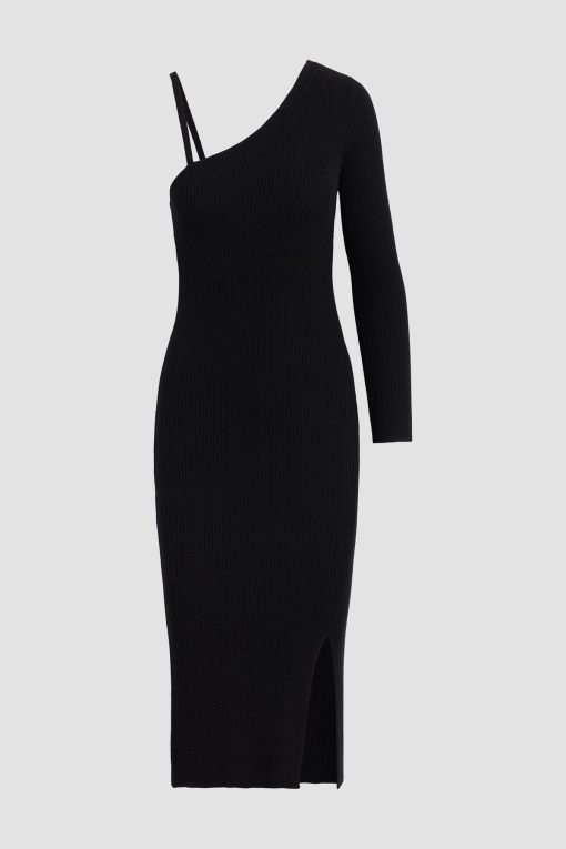 - Our Asymmetrical Long Sleeve Dress in Black is cut from a soft Merino Wool featuring a front slit and one shoulder detail.