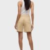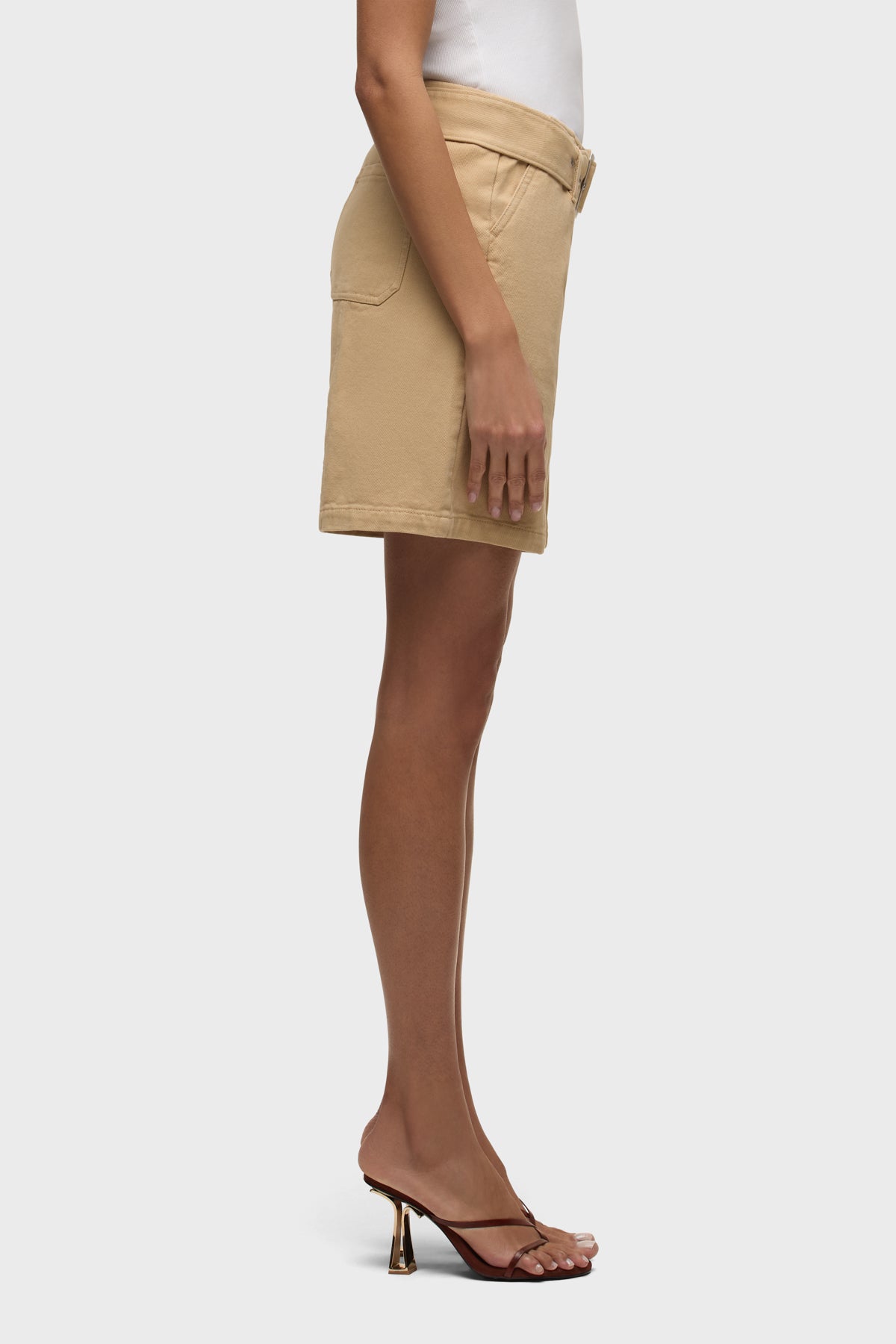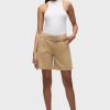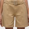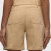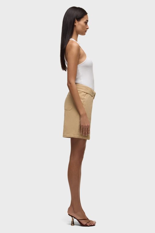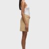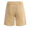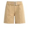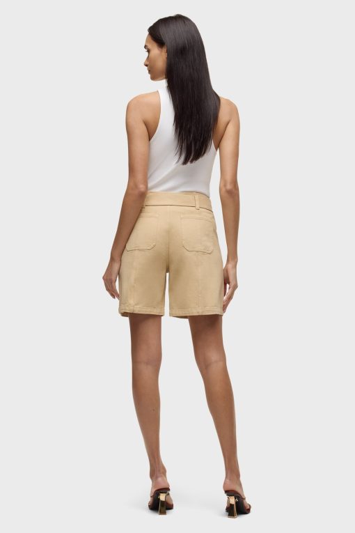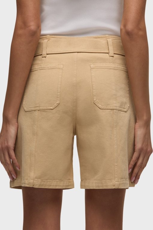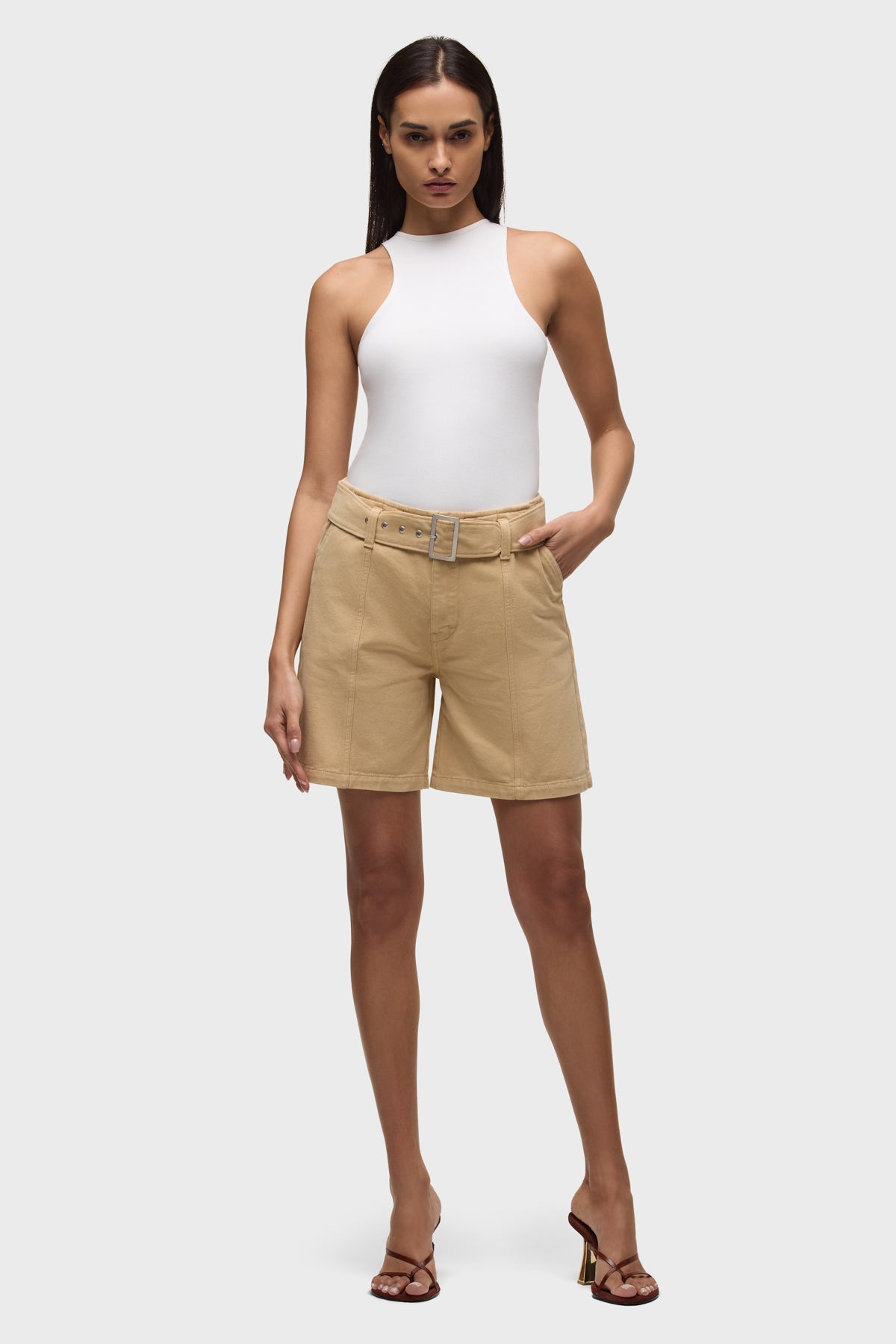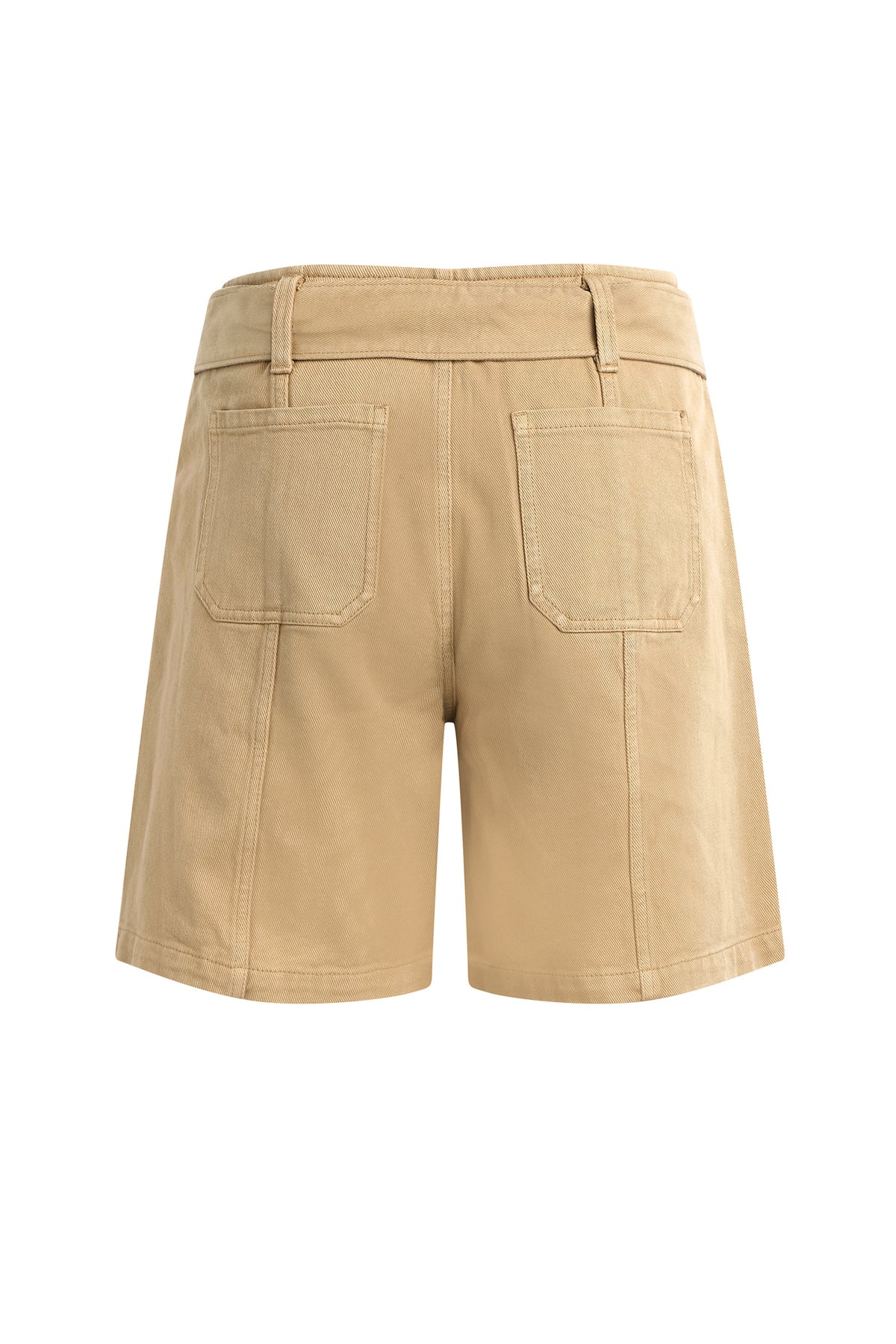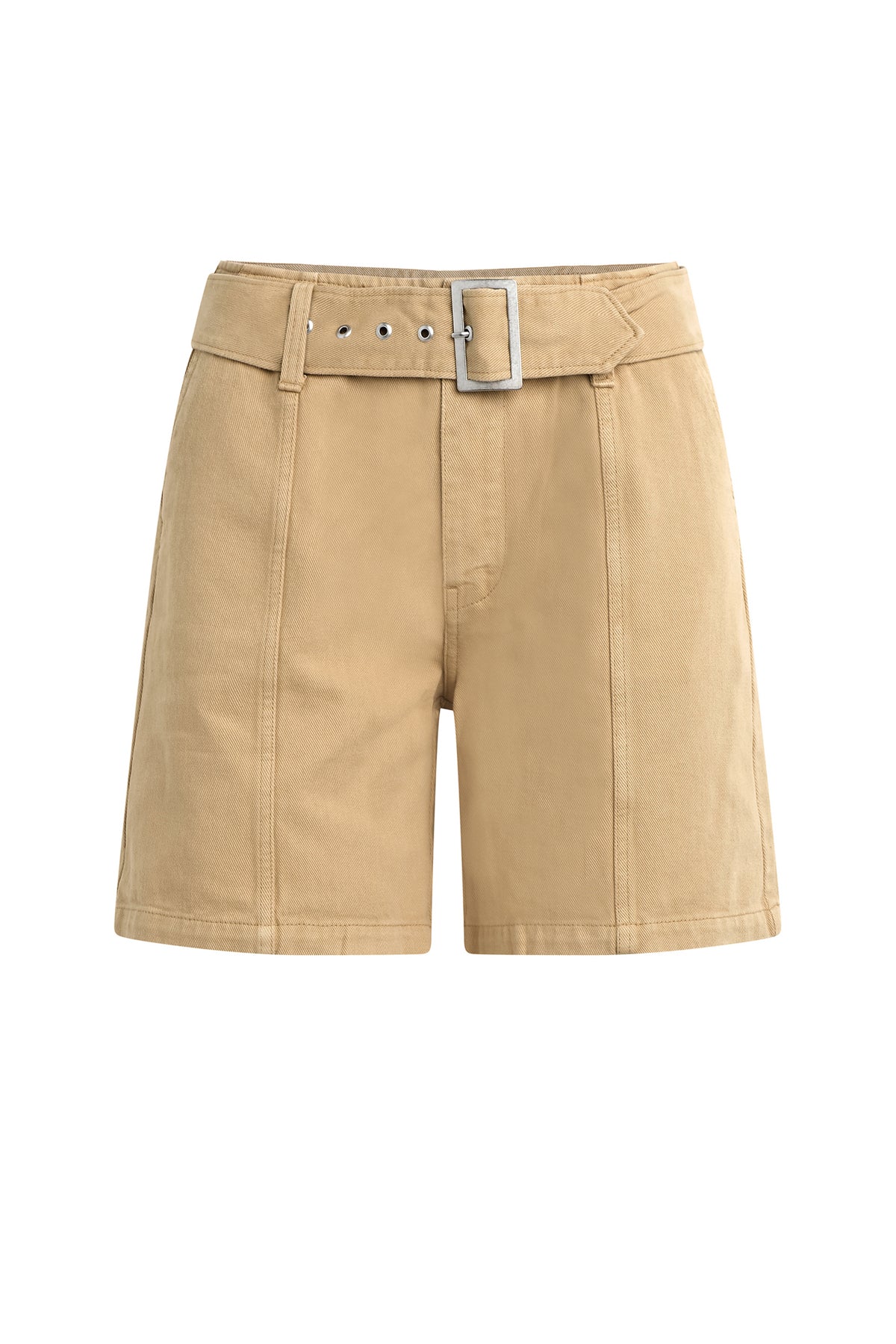 - The Belted Long Short in Cornfield is a chic short with a 6.5″ inseam, a belt at the waistband in the same material as the body, side pockets and a clean finished hem. It is made of non-stretch, heavy twill in a reactive overdyed khaki shade.