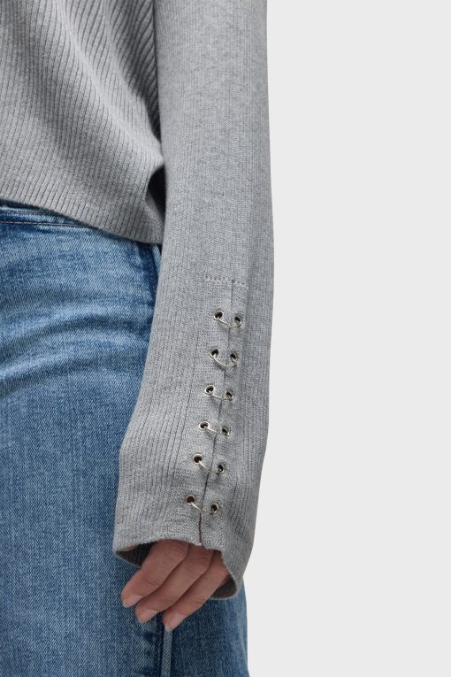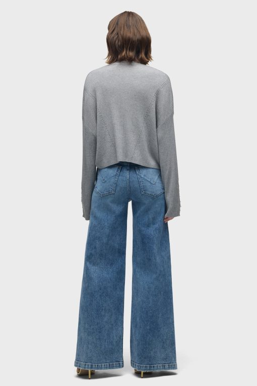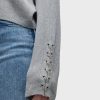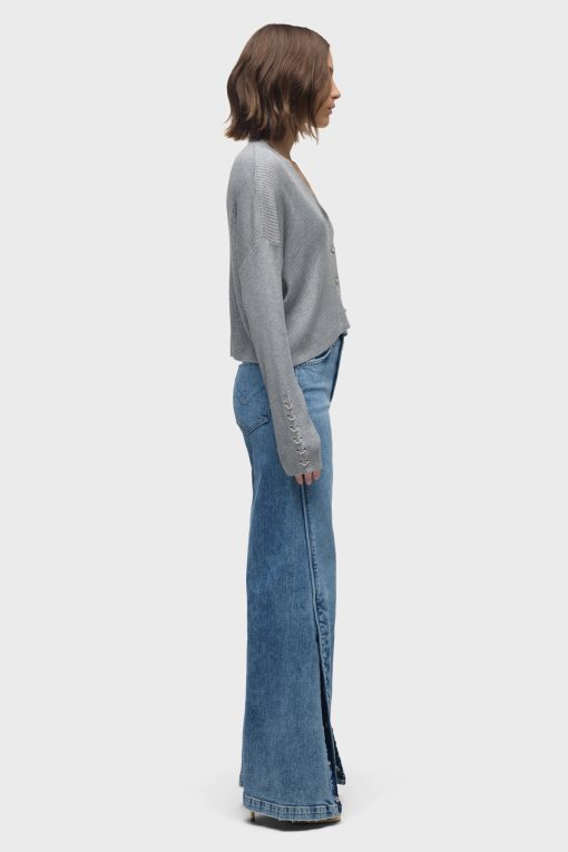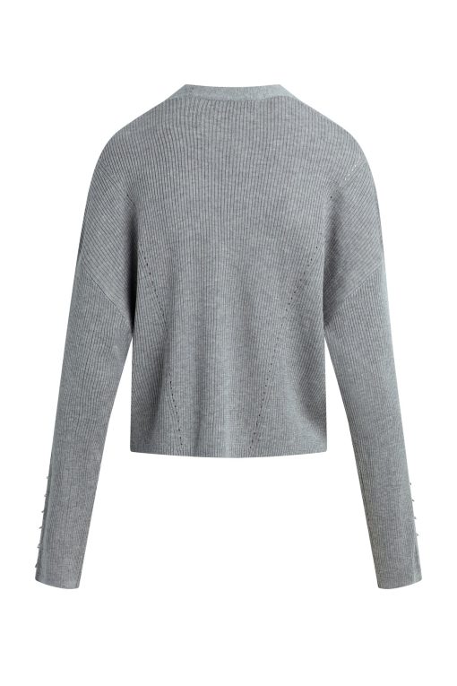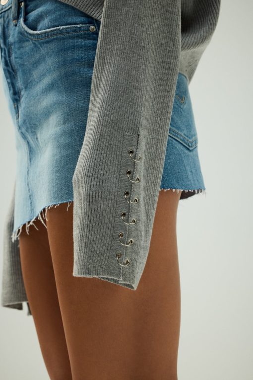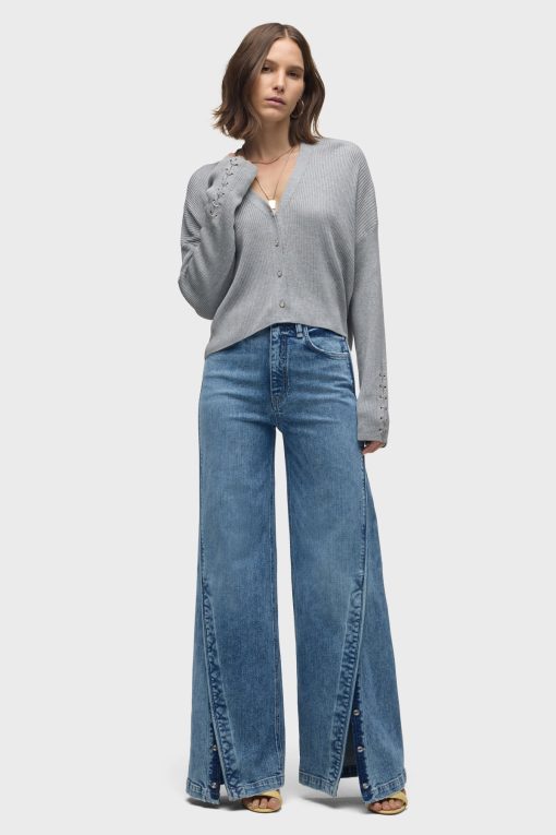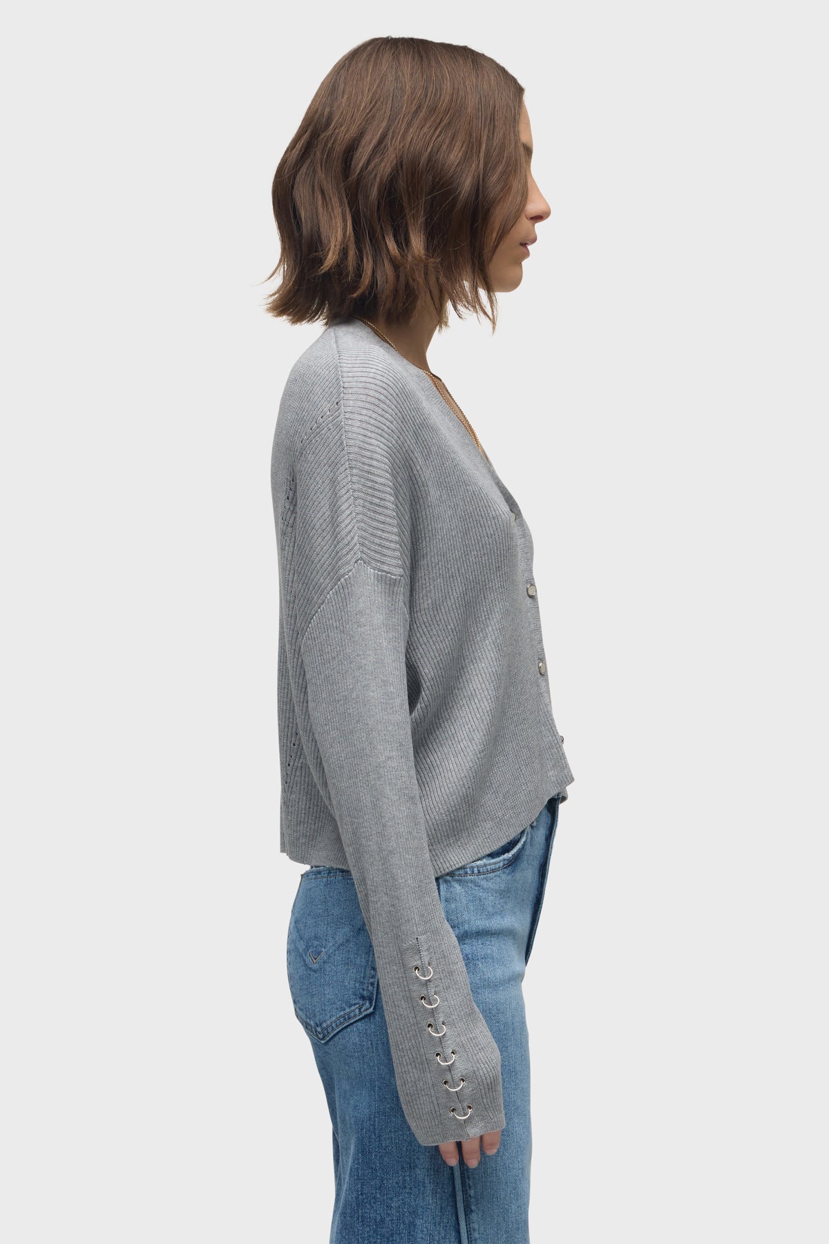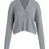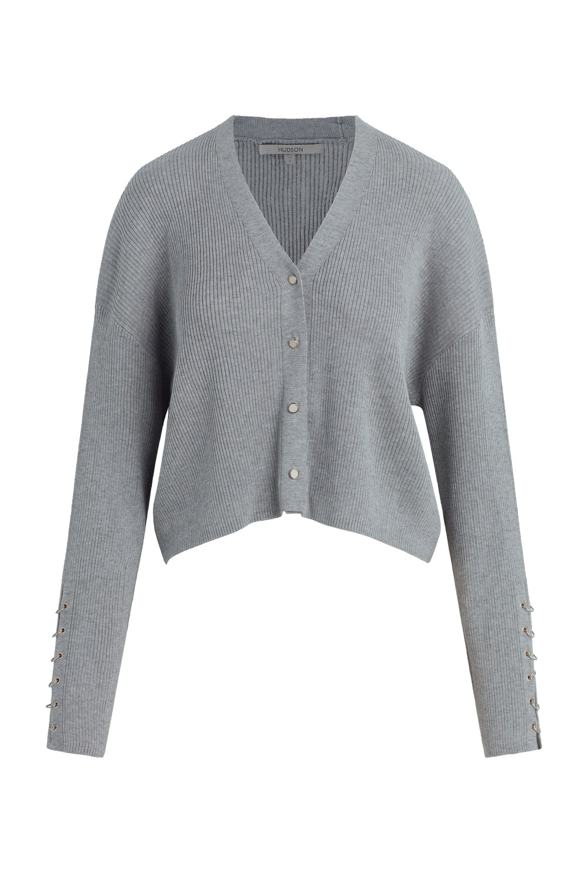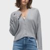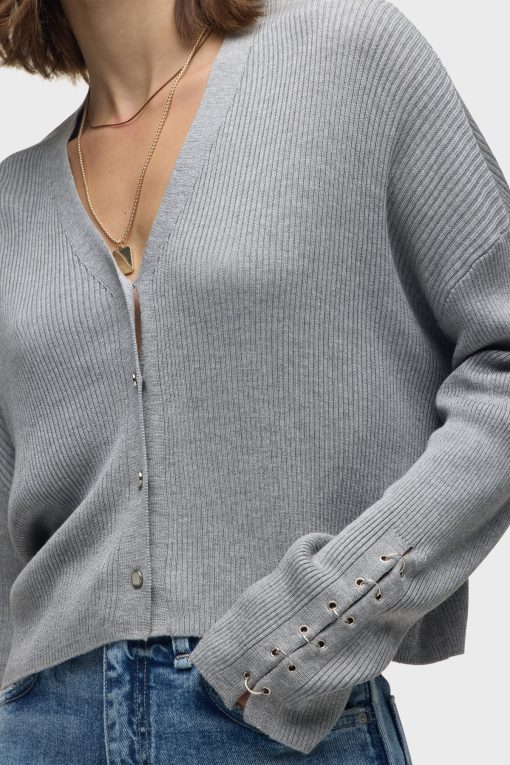 - Our Boxy Cardi in High Rise is a long sleeve cardigan, featuring novelty buttons down the center front and o-ring embellishments down the side of the sleeves to elevate the look. This cozy essential is made from light grey soft yarn.