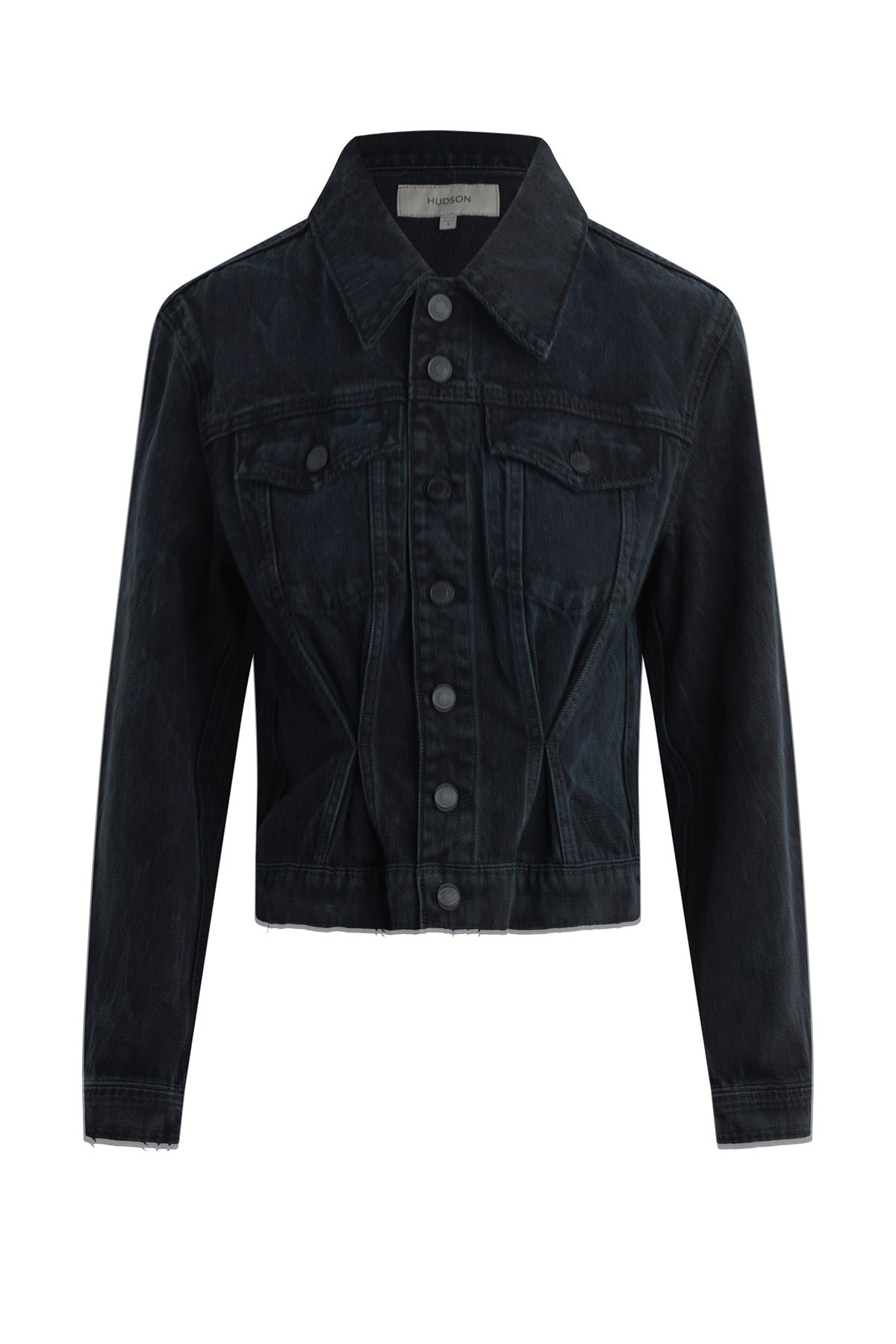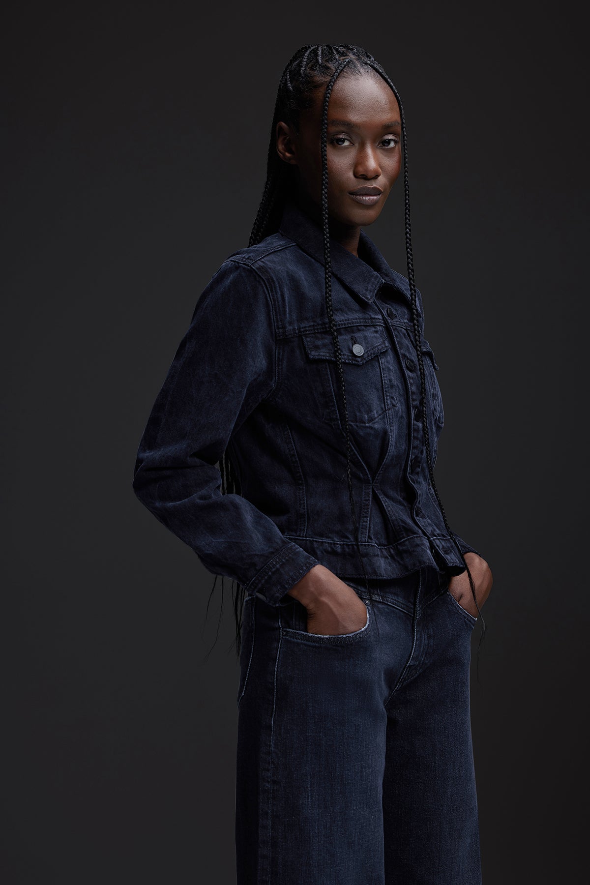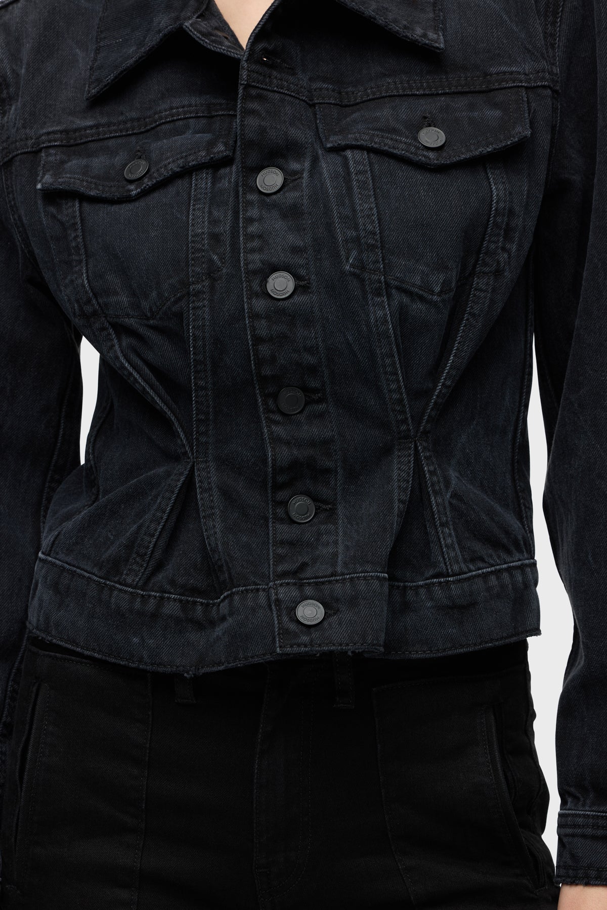 - Cut from premium Italian rigid denim, our Cinched Waist Jacket in washed black Dark Night has a pleated waist for a corset look and is finished with long sleeves, pointed collar and front buttons.