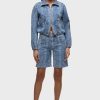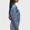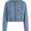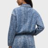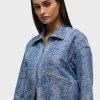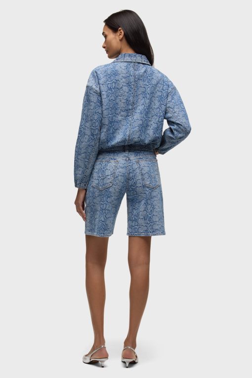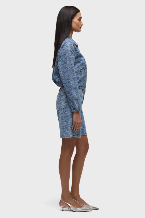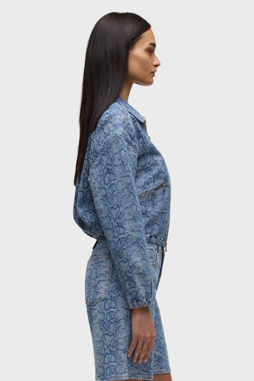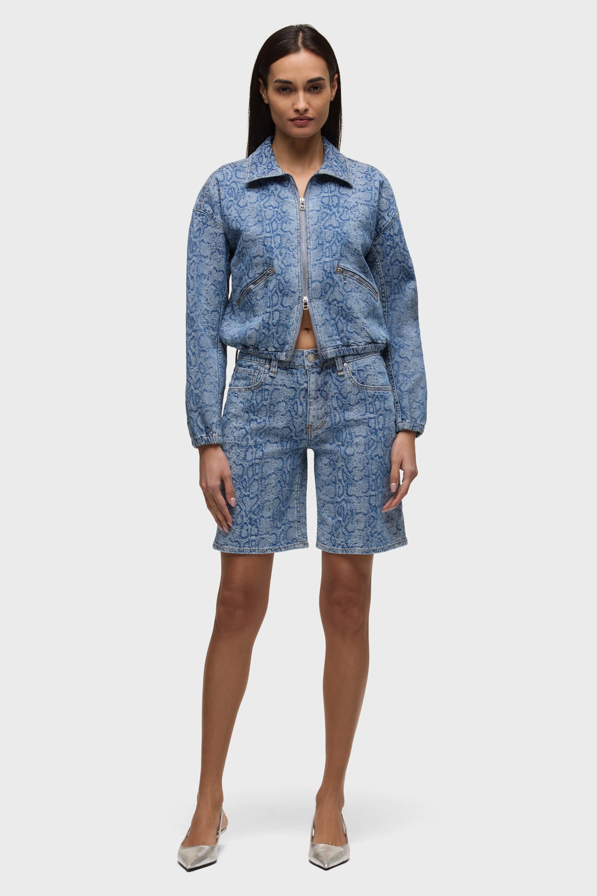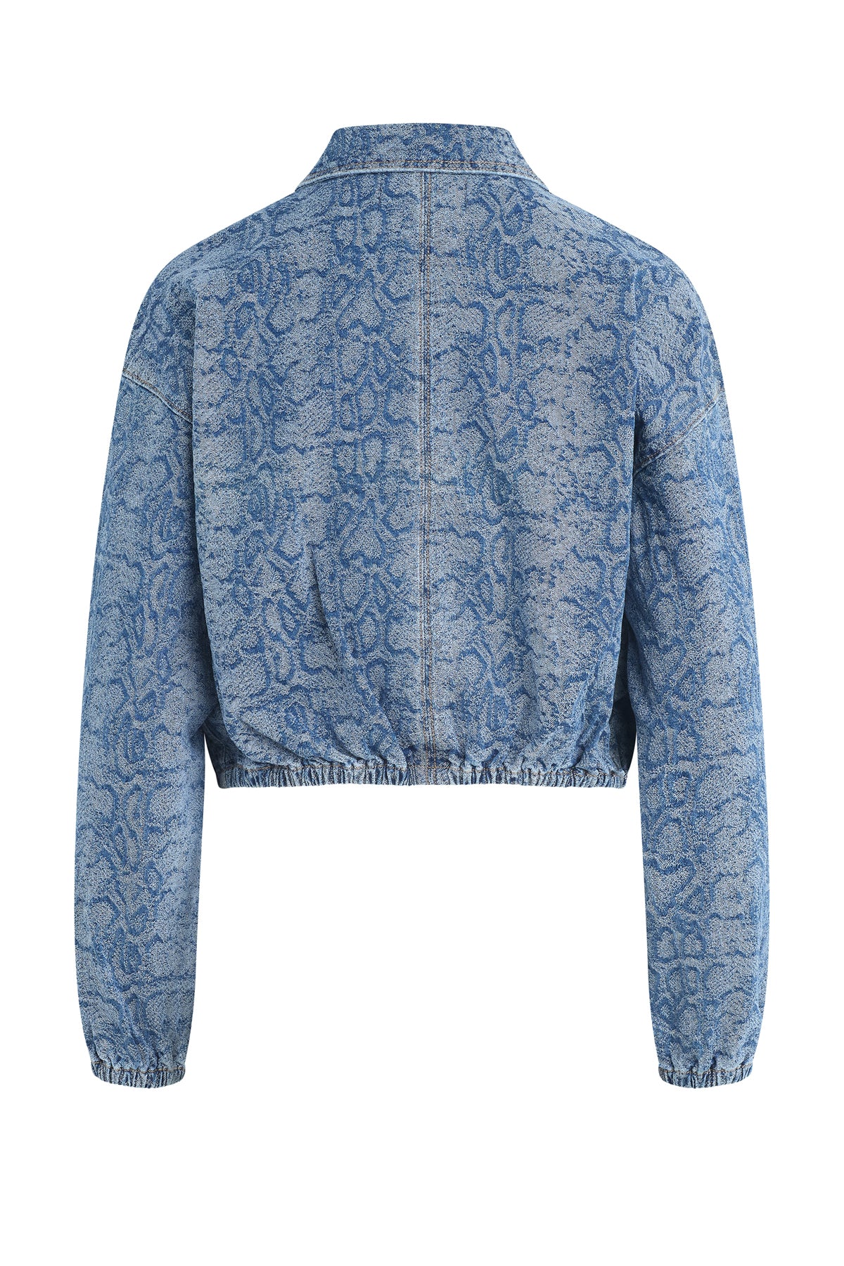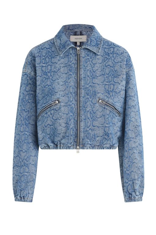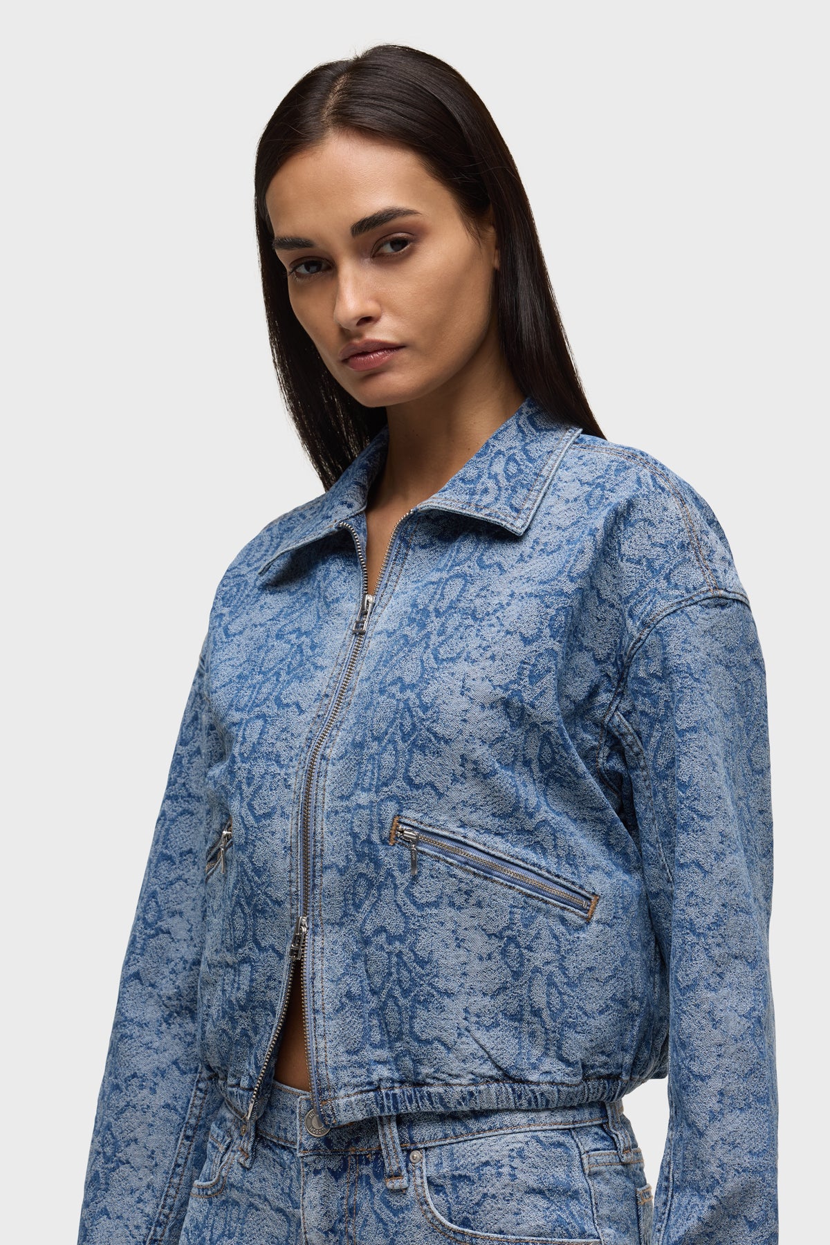 - The Cropped Zip-Up Jacket in Venom is a bomber-inspired unlined jacket. The star of this style is the snake jacquard in a medium indigo wash on slightly stretchy denim. It is finished with a two-way zipper at the center front with zipper pockets.