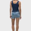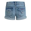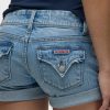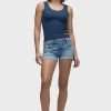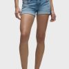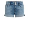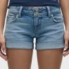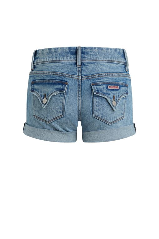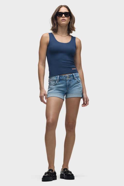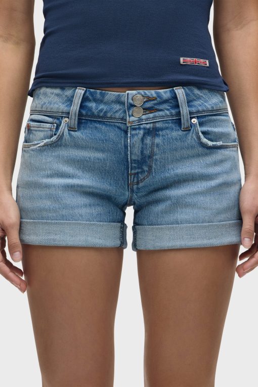 - Featuring our signature original flap pocket with the Union Jack flag, the Croxley Mid-Rise Short in Anthem has a rolled-hem that hits right above the mid-thigh. This pair is made of premium comfort stretch denim in a vintage-inspired medium indigo wash with heavy stone washing, bleaching and edge grinding.