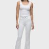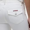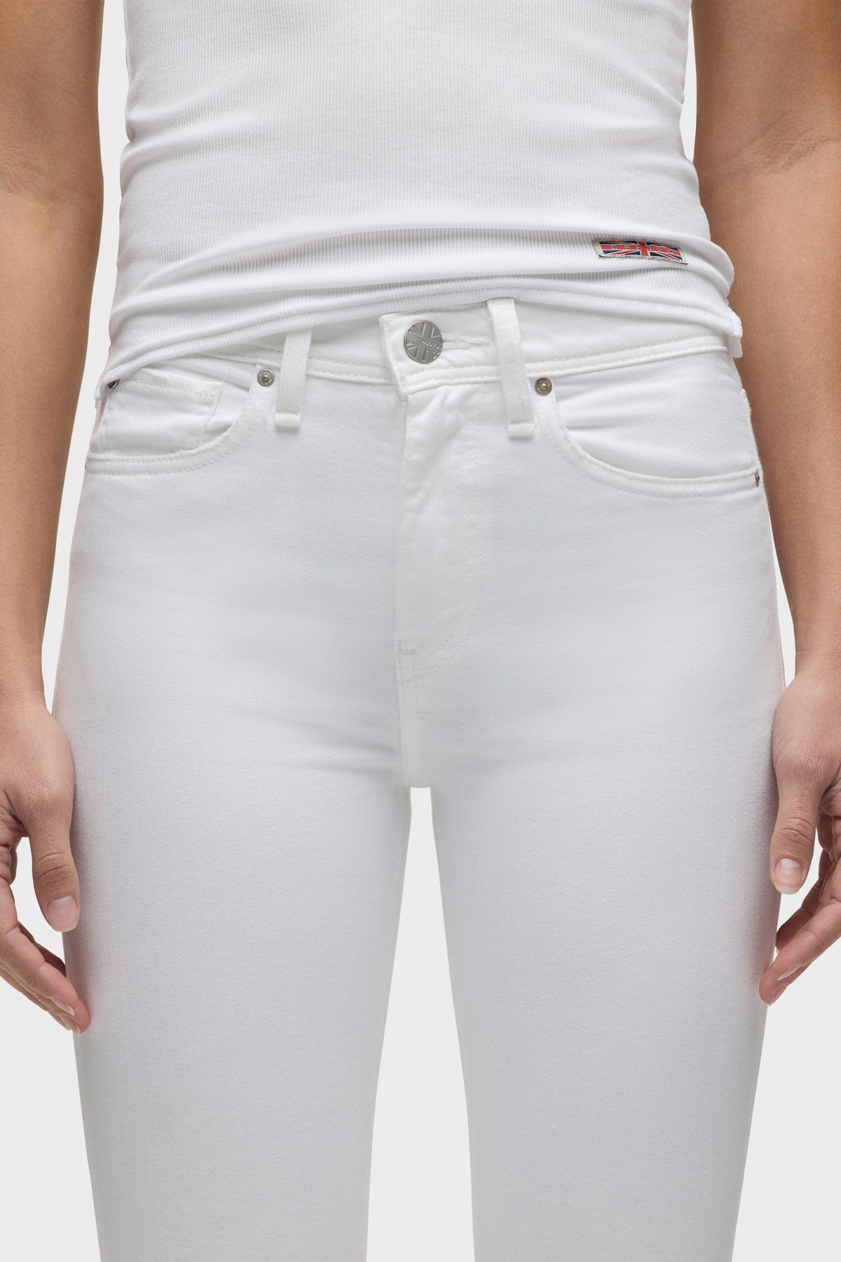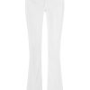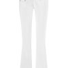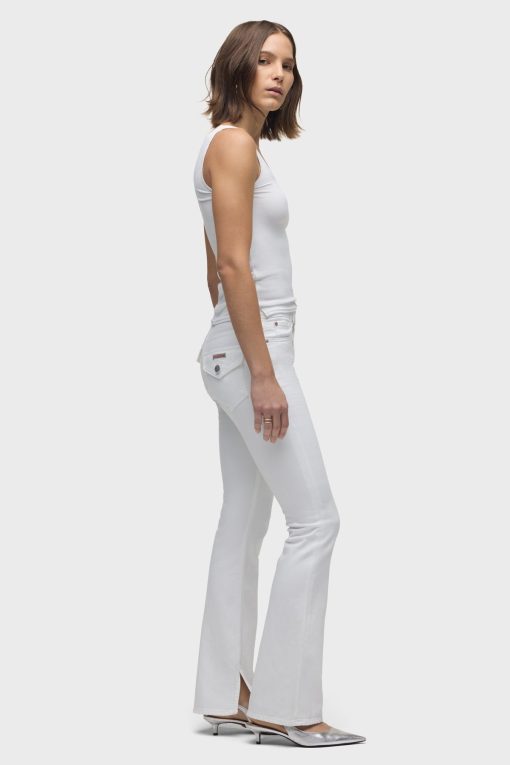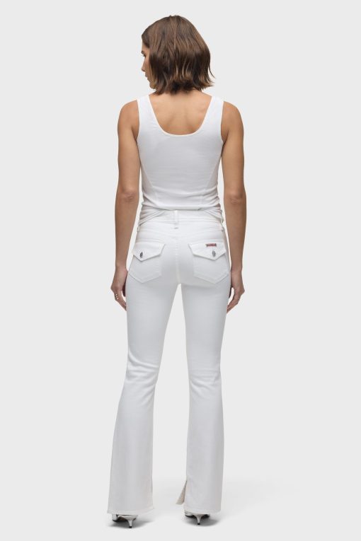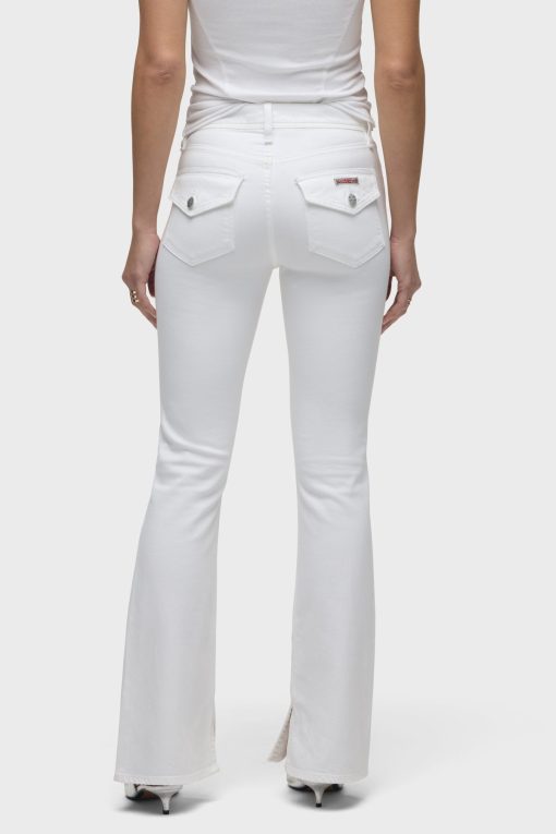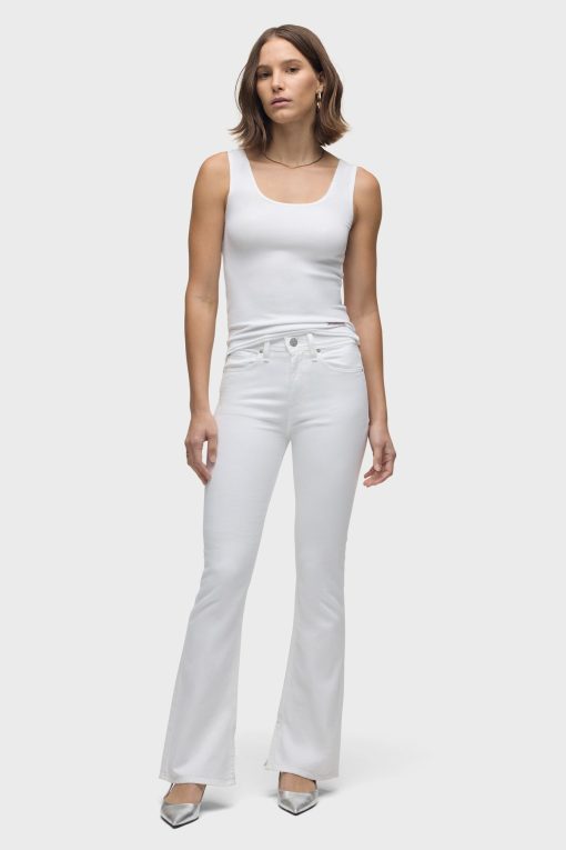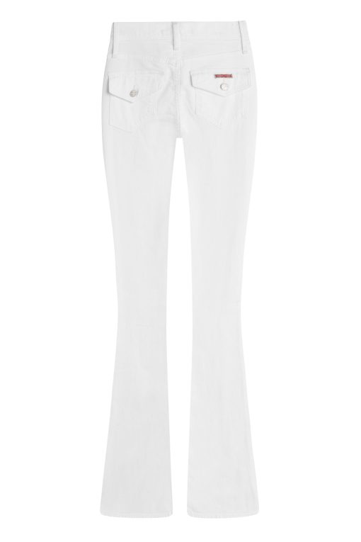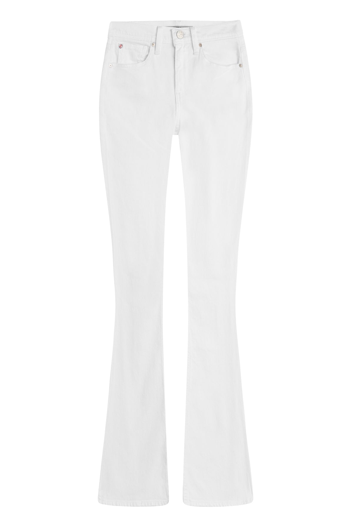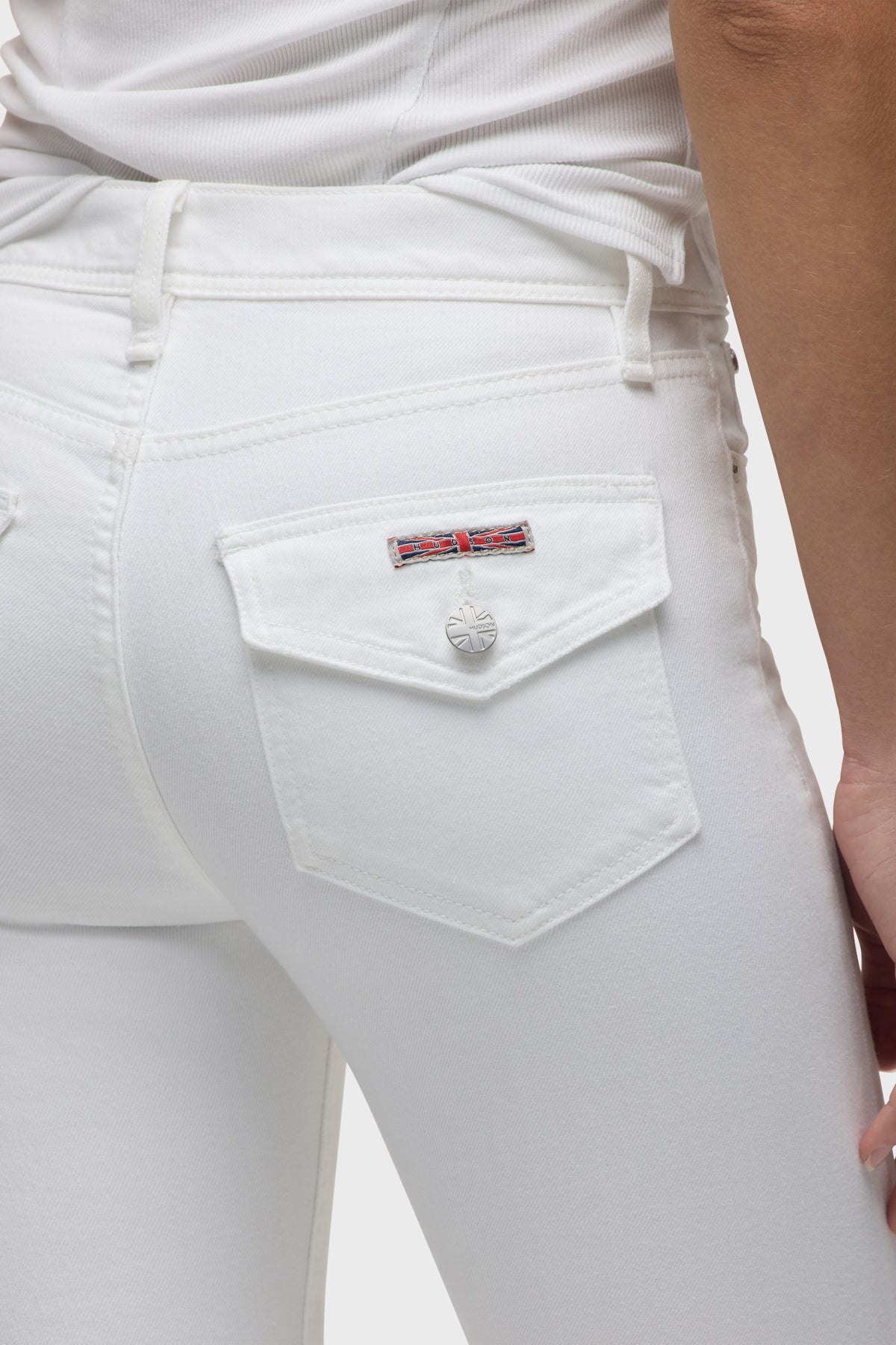 - Streamlined and flattering, our Barbara High-Rise Bootcut Jean w/ Flap in White has a slim, contoured fit with an elevated waistline and a gently flared leg. This pair features our updated button-flap pocket with a new modern shape. Made of premium comfort stretch denim in a clean white shade, it is finished with a high rise, 32″ inseam and 5″ inseam slit with a clean finished hem.