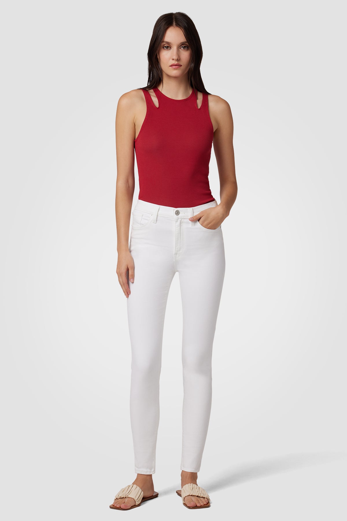 - Our Barbara High-Rise Super Skinny Ankle Jean in White is a slim, contoured fit with a high, holds-you-in waistline. Made from premium super stretch denim, it’s finished with faux front pockets for a smooth silhouette.