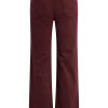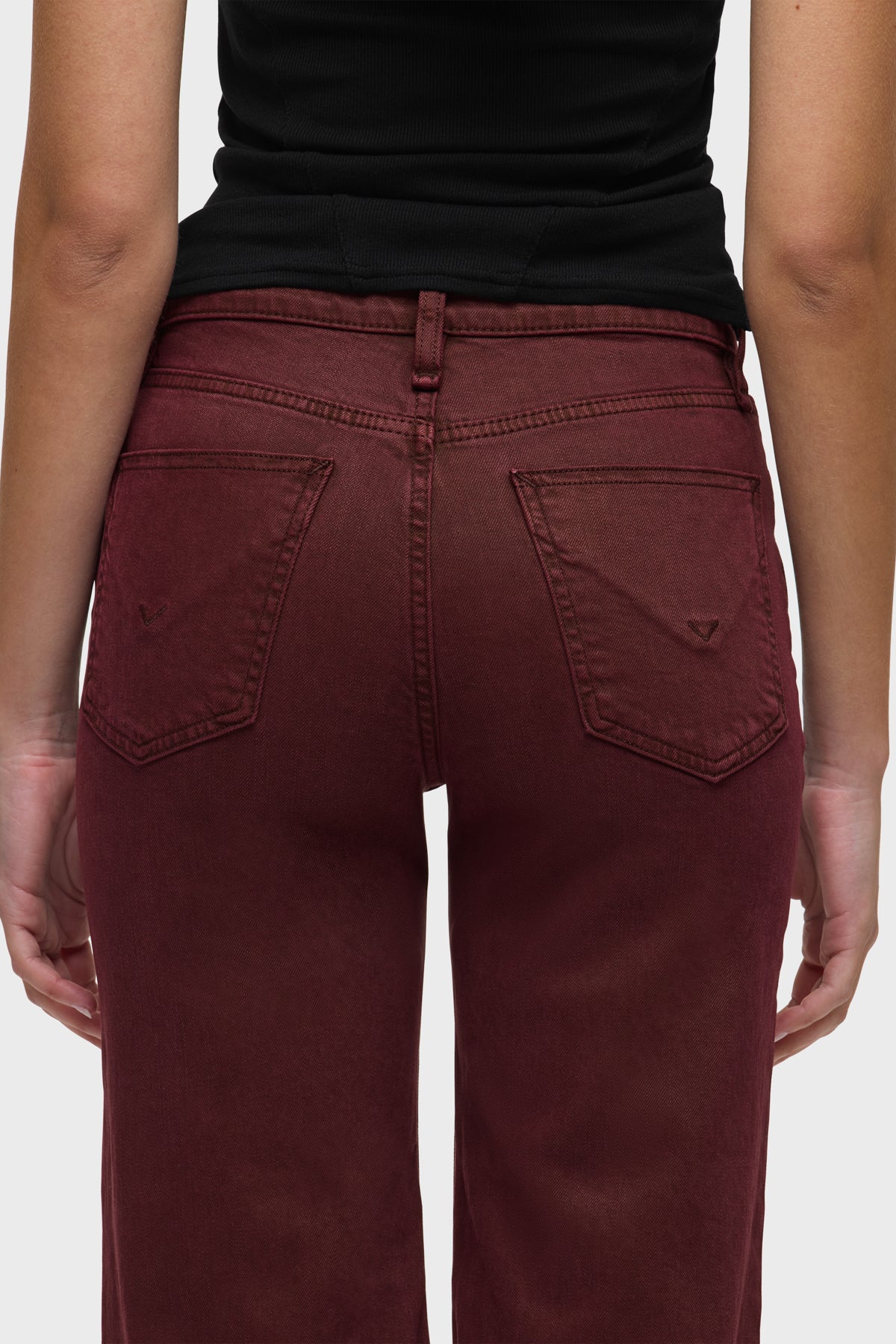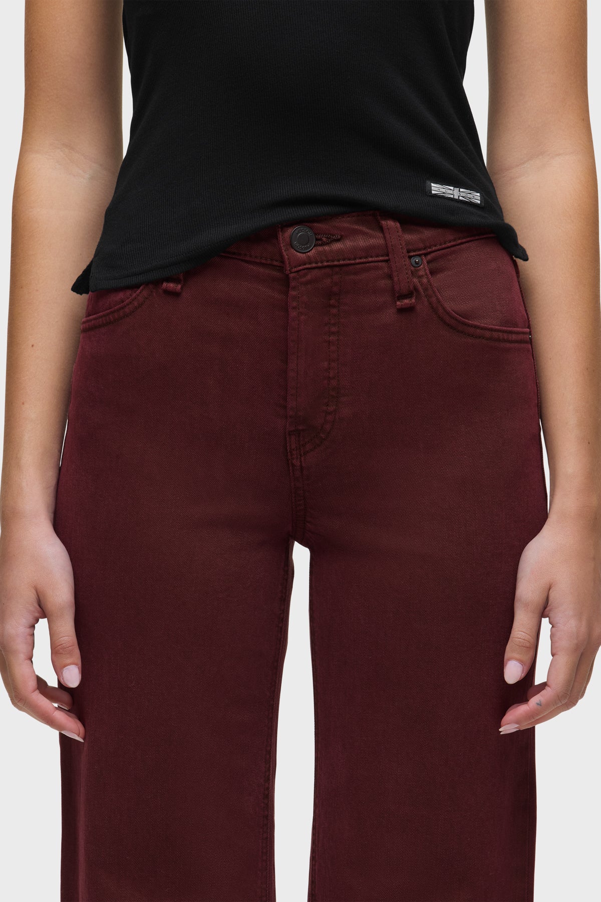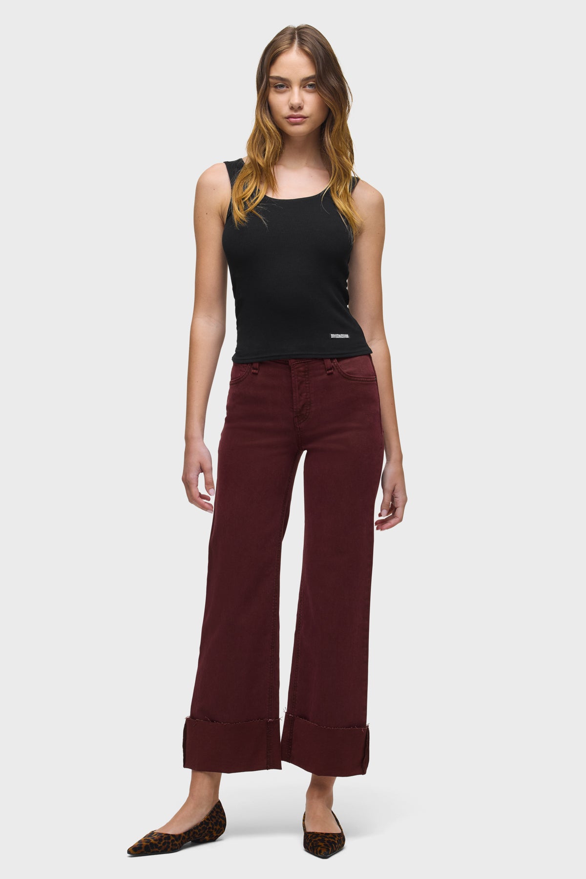 - Our Rosie High-Rise Wide Leg with Cuff in Port Royal has a classic fit with an elevated waistline and a roomy leg. Crafted in overdyed deep burgundy stretch fabric, this full-length 32″ pair is finished with a 5″ cuff, raw hem and covered button fly.