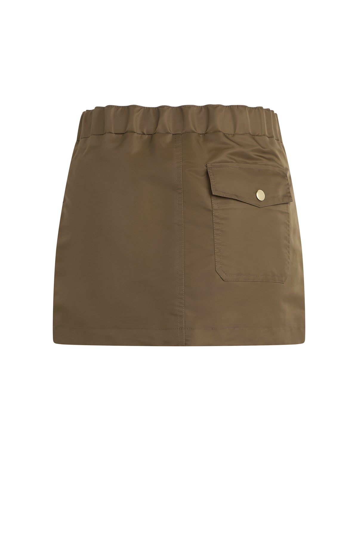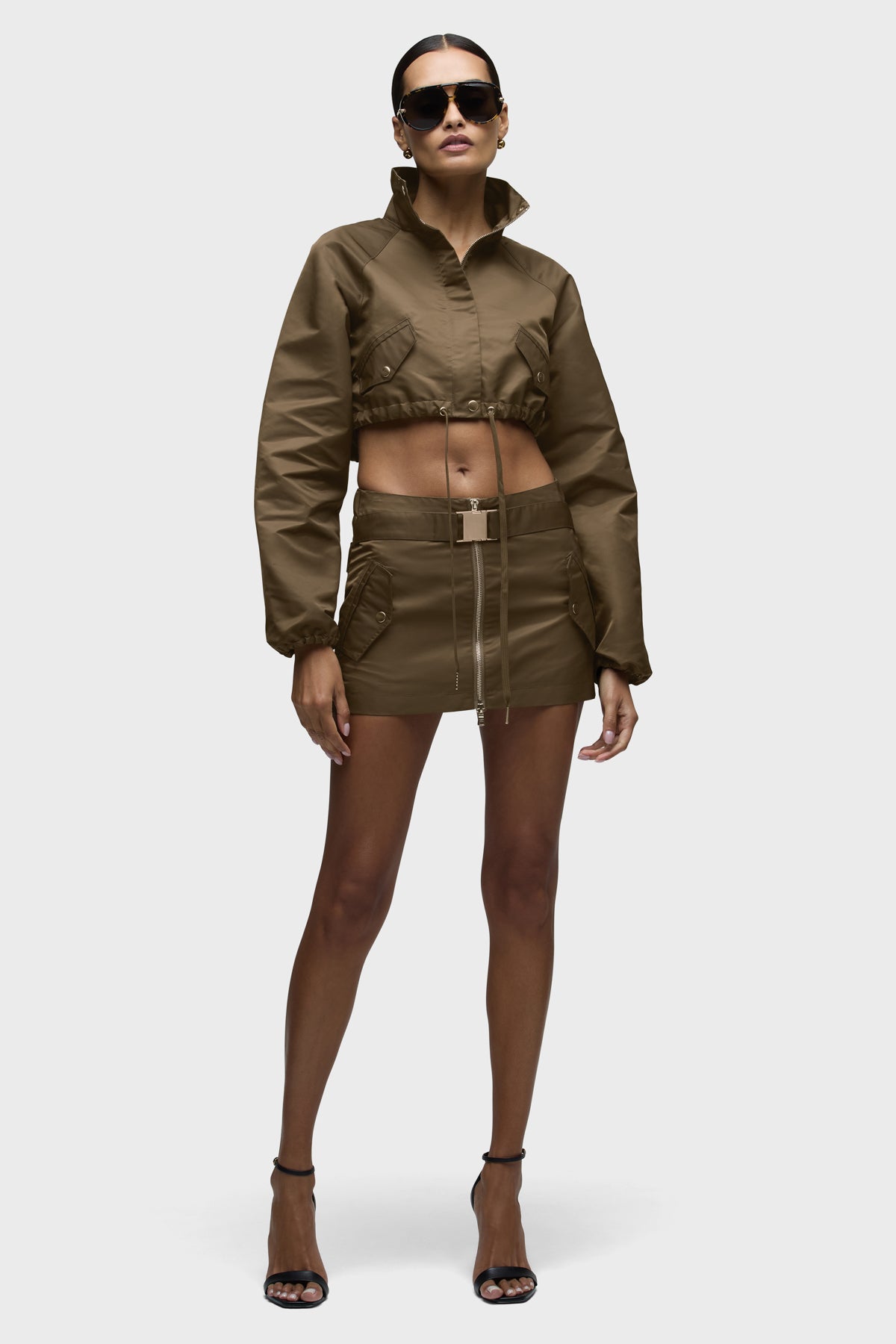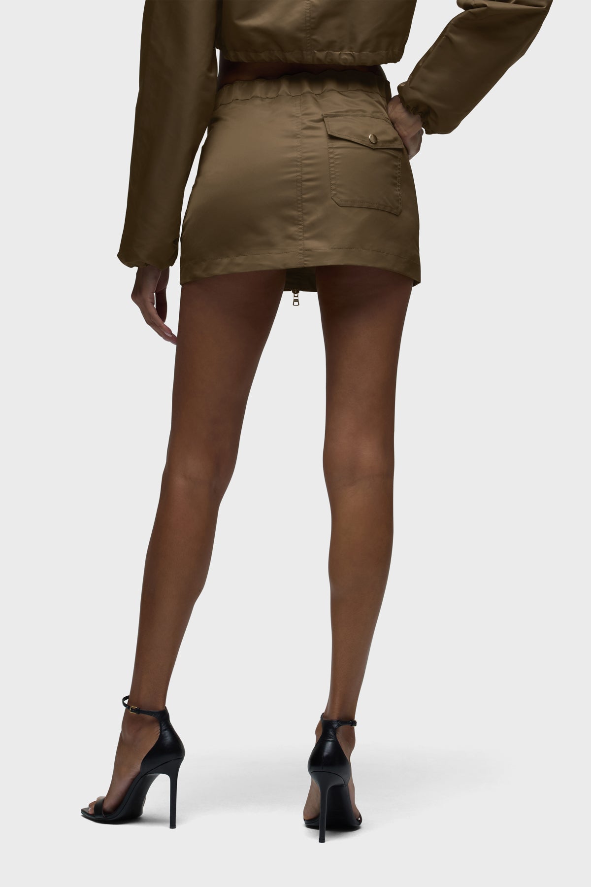 - Part of our Brooks Nader collab capsule, the Grace Ann Micreaux Mini Skirt in Basin features a two-way zipper at center front, a buckle at center front and elastic in the back for optimum comfort. To elevate the look, we added gold branded buttons. This skirt is made from nylon fabric in an olive shade. It pairs great with the Grace Ann Cropped Jacket, or it can be worn by itself. This capsule was curated by model Brooks Nader and features her personal closet must-haves.