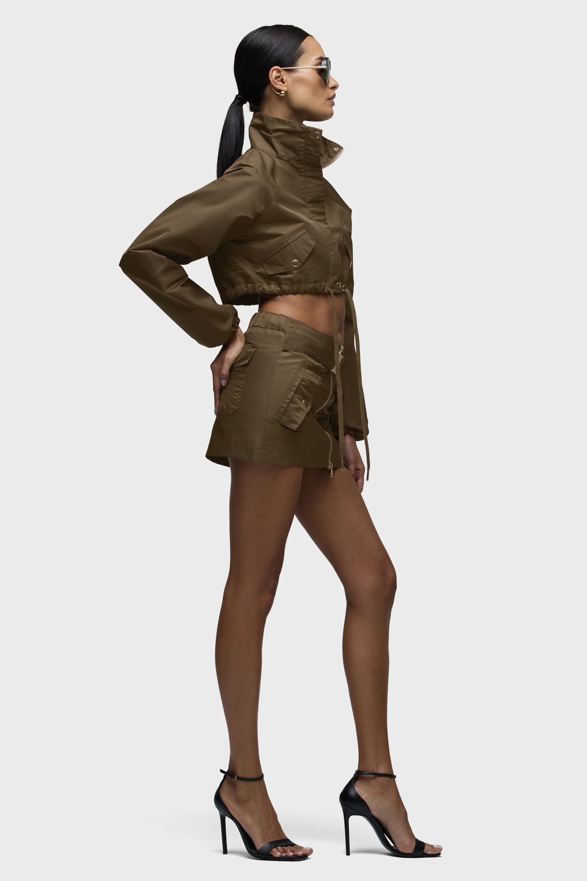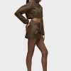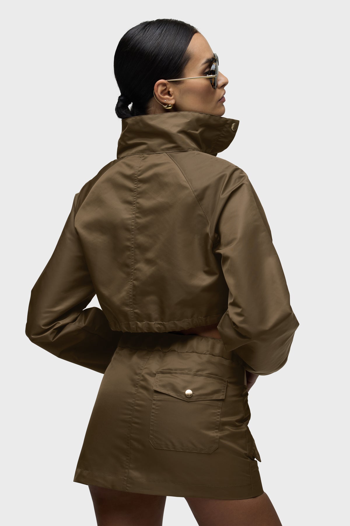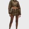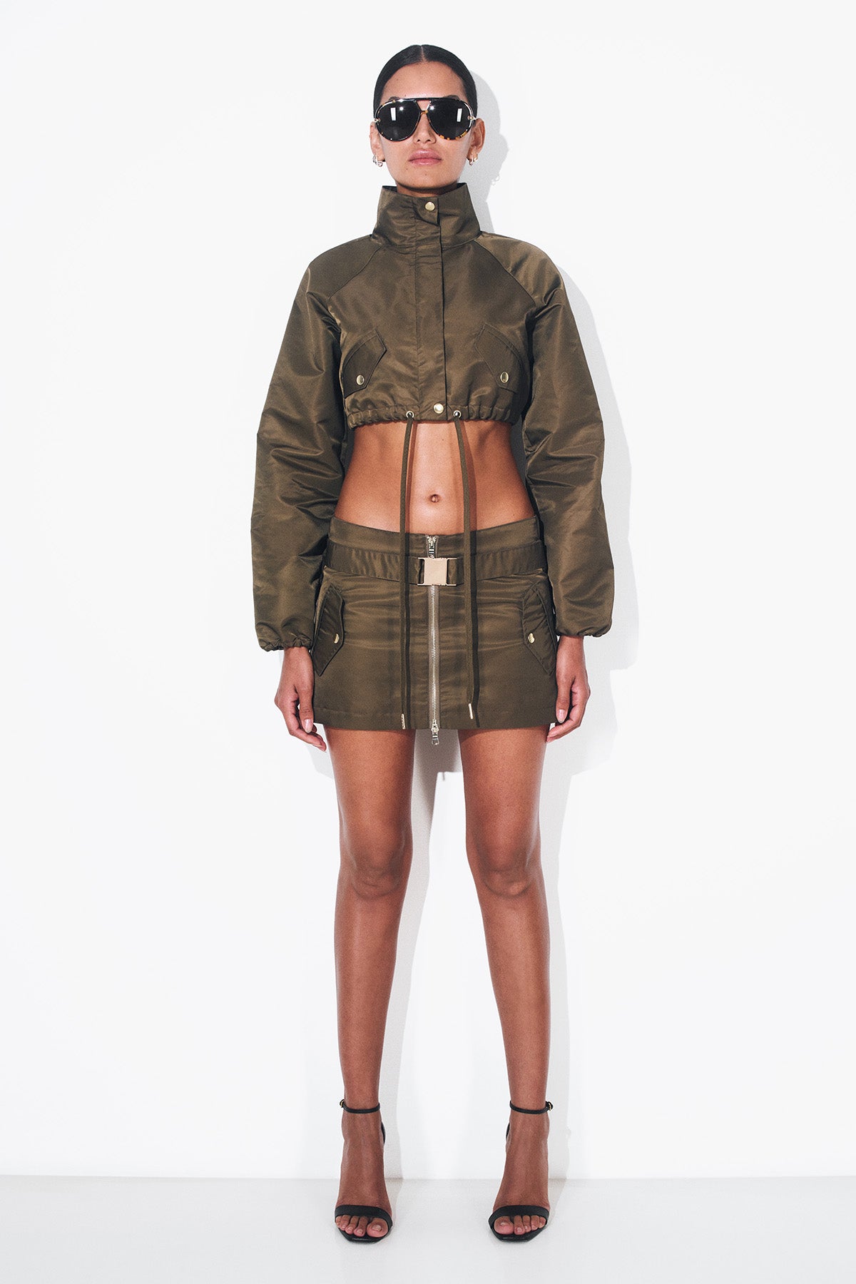 - Part of our Brooks Nader collab capsule, the Grace Ann Micreaux Mini Skirt in Basin features a two-way zipper at center front, a buckle at center front and elastic in the back for optimum comfort. To elevate the look, we added gold branded buttons. This skirt is made from nylon fabric in an olive shade. It pairs great with the Grace Ann Cropped Jacket, or it can be worn by itself. This capsule was curated by model Brooks Nader and features her personal closet must-haves.