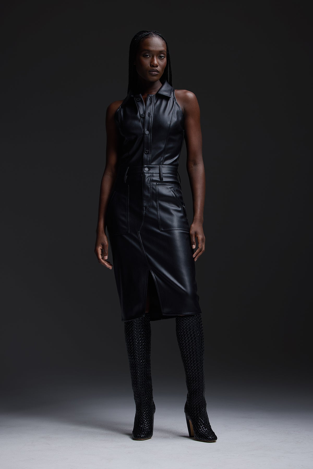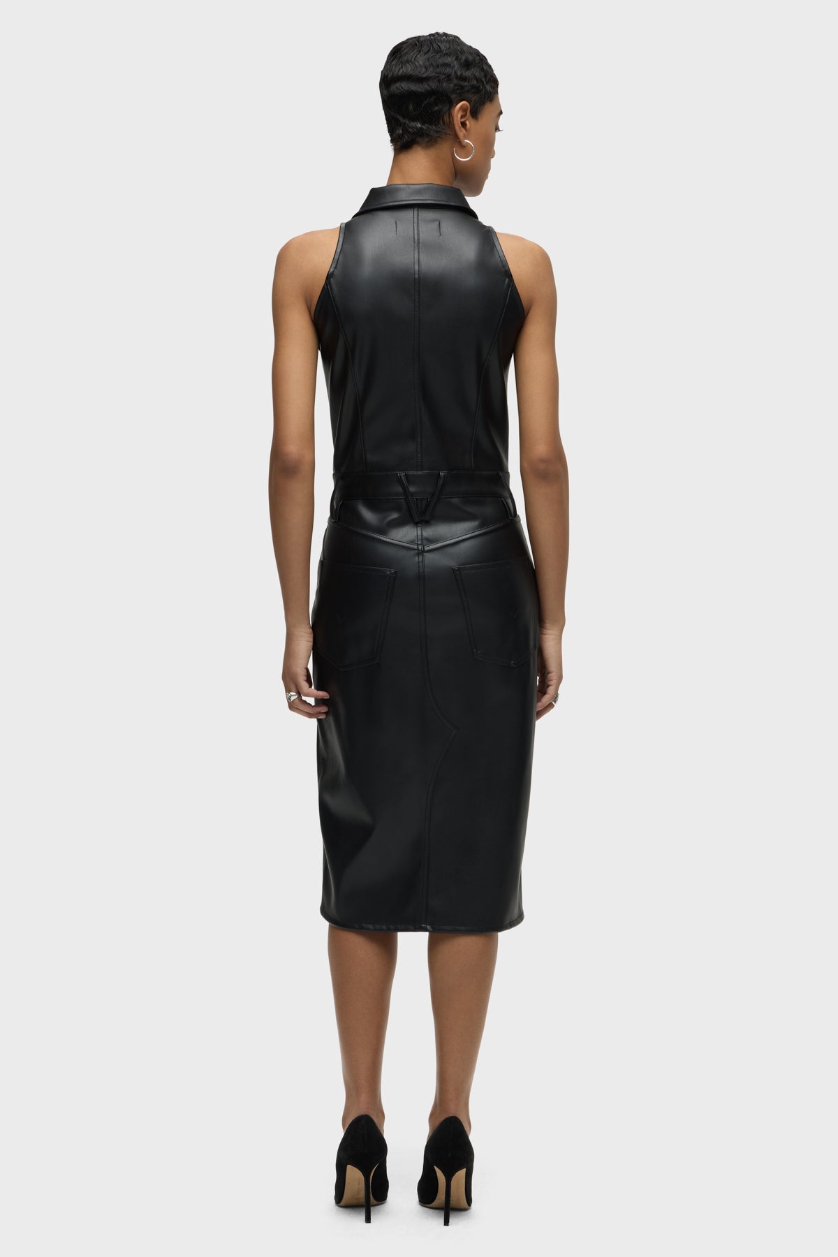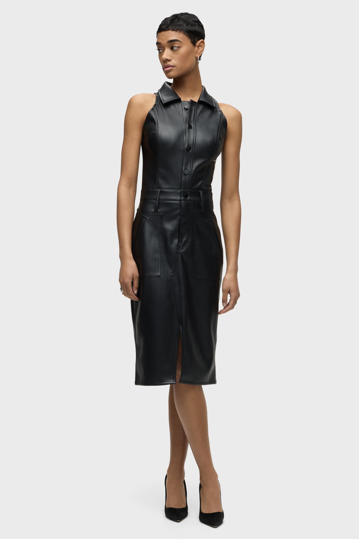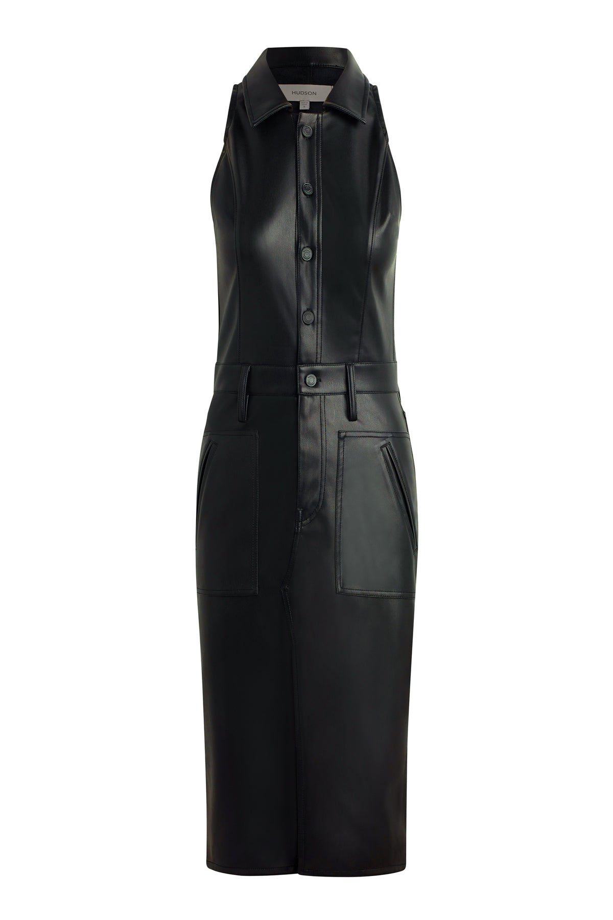 - Our Halter Utility Dress in Black Illusion vegan leather features a midi length and sleeveless cut. Button front closure, pointed collar and front patch pockets finish the look.