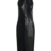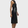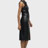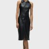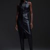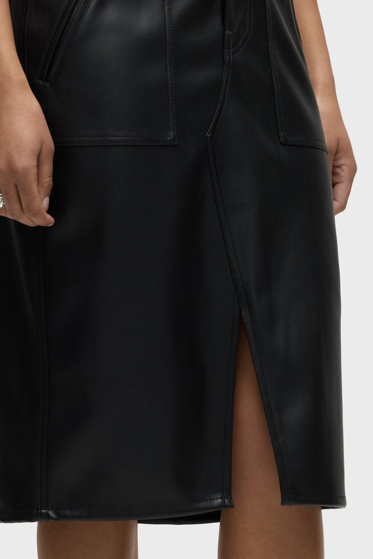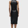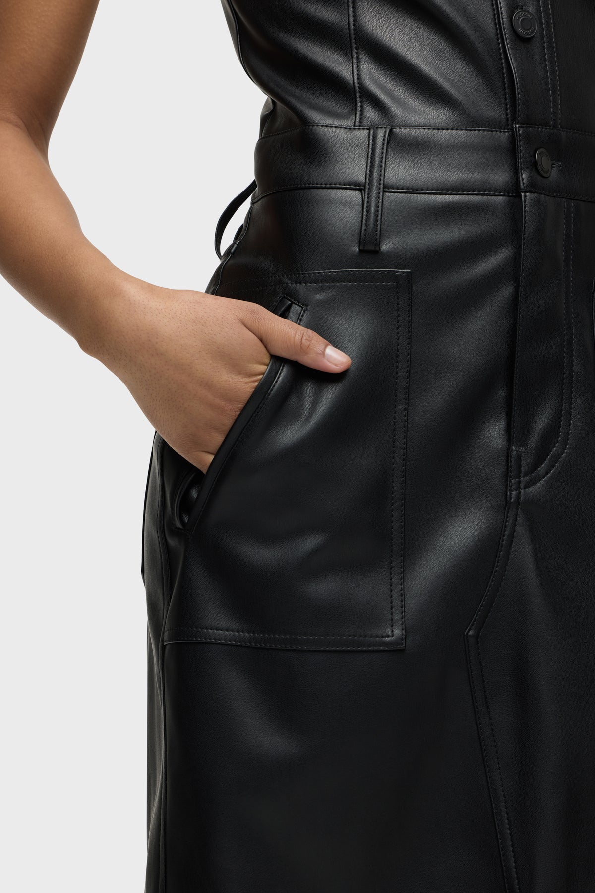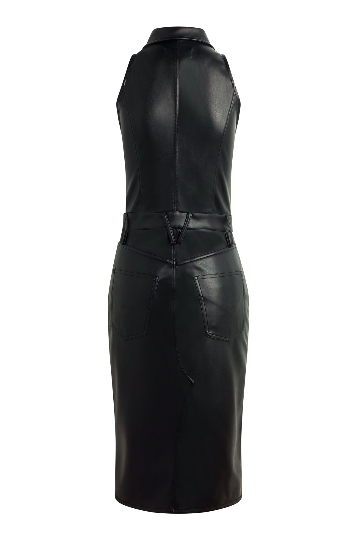 - Our Halter Utility Dress in Black Illusion vegan leather features a midi length and sleeveless cut. Button front closure, pointed collar and front patch pockets finish the look.