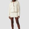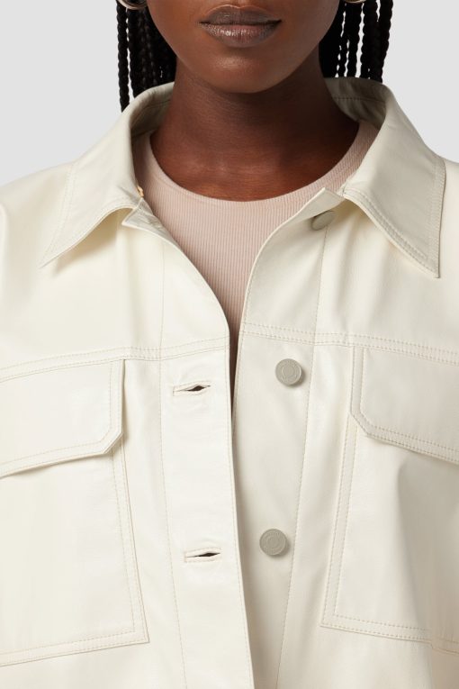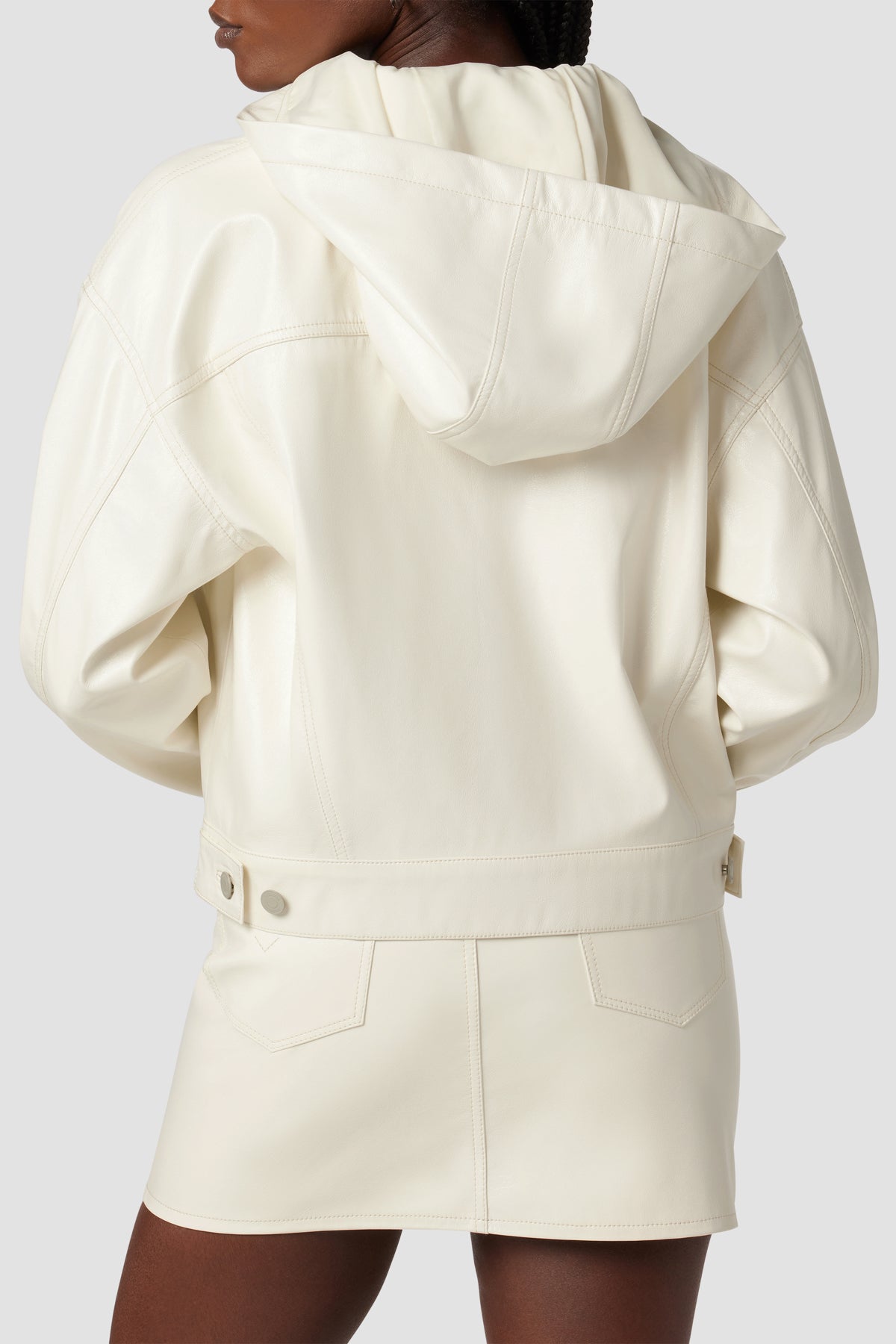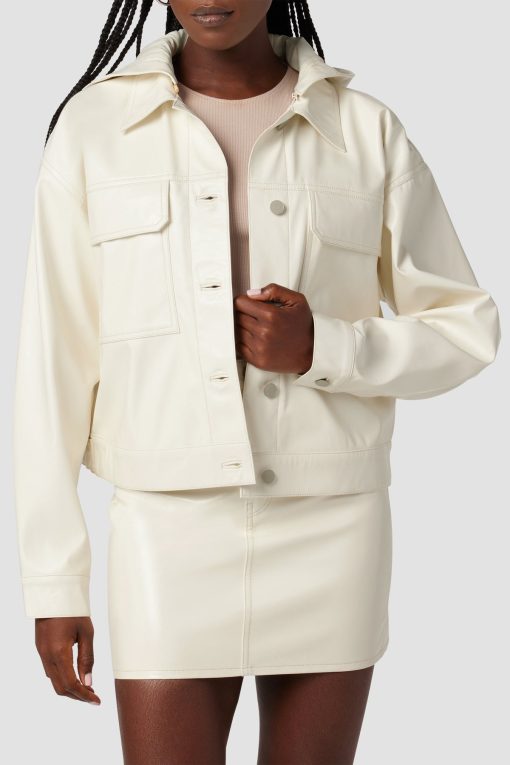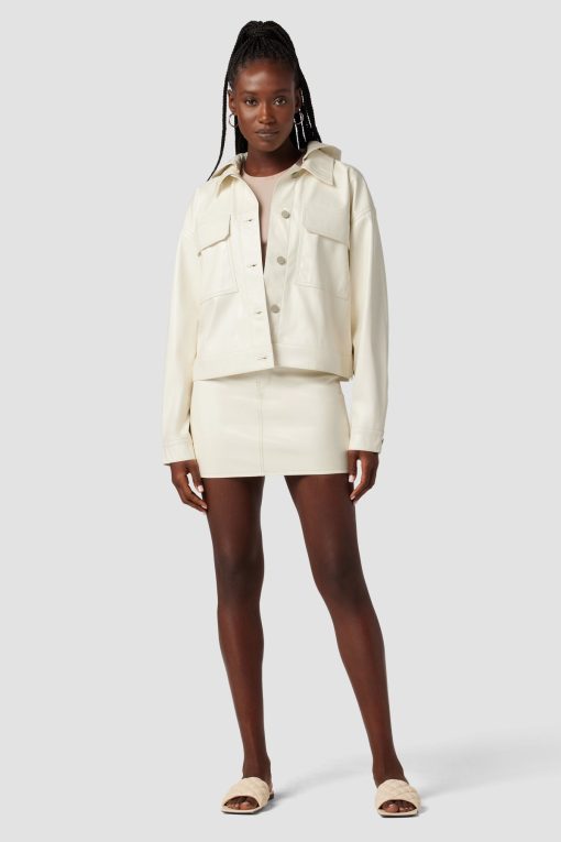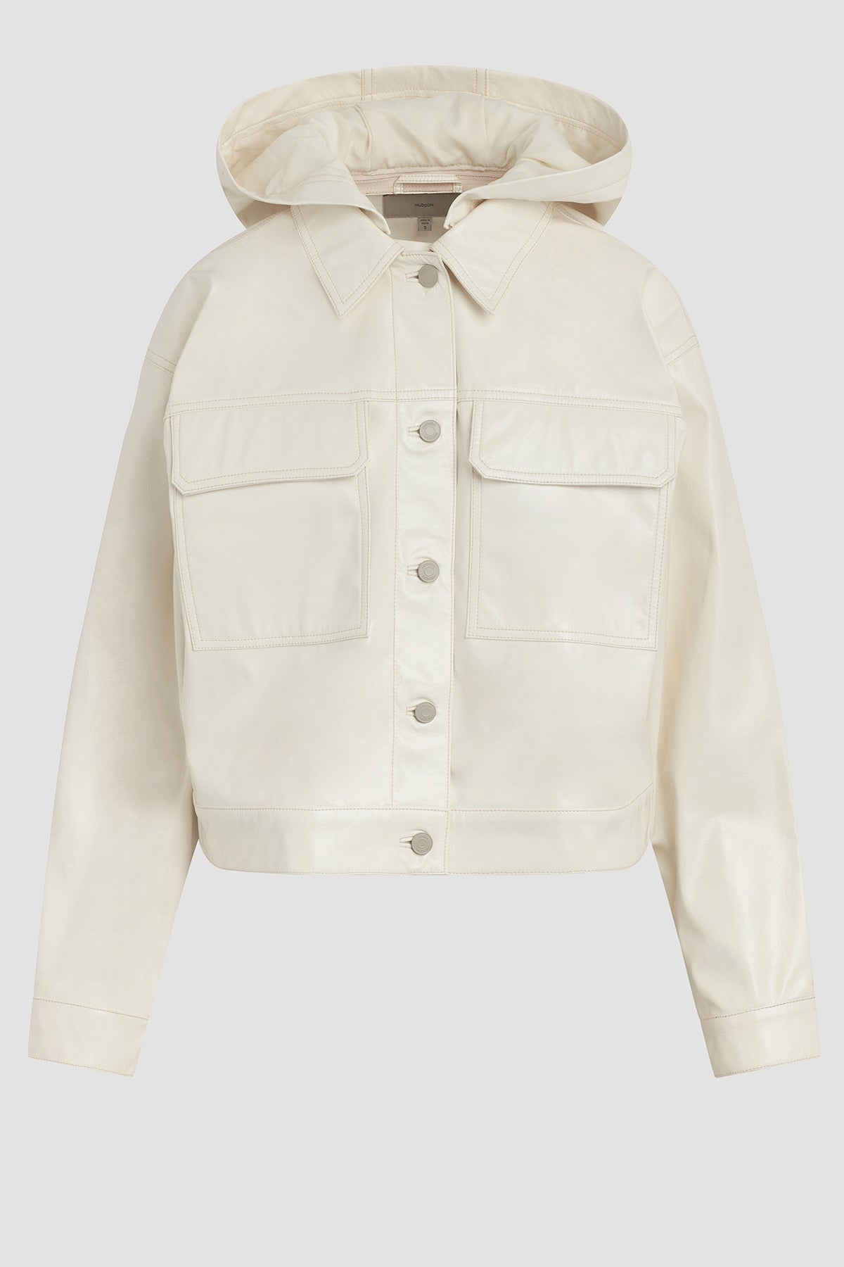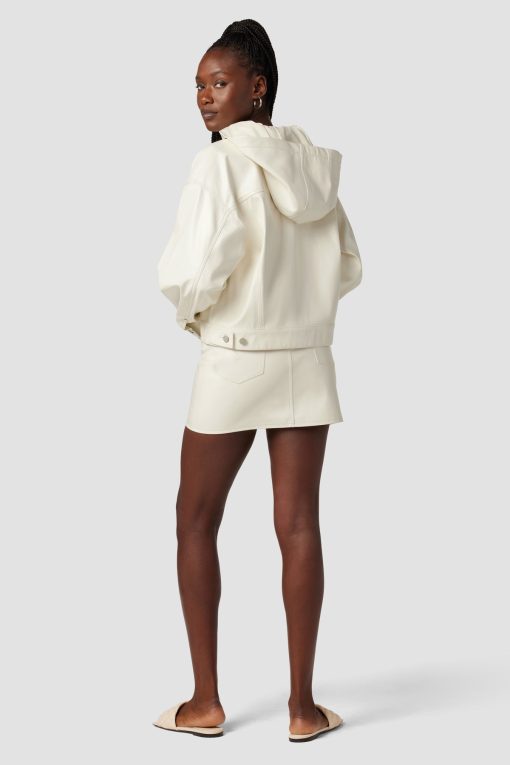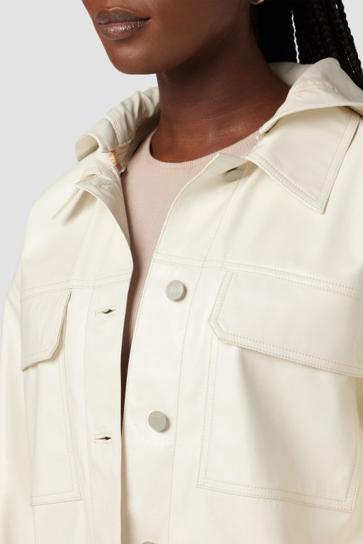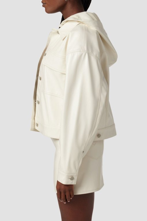 - Our Hoodie Swing Trucker Jacket in Patent Egret is crafted from our vegan Illusion Leather. Front flap pockets and detachable hood finish the look.