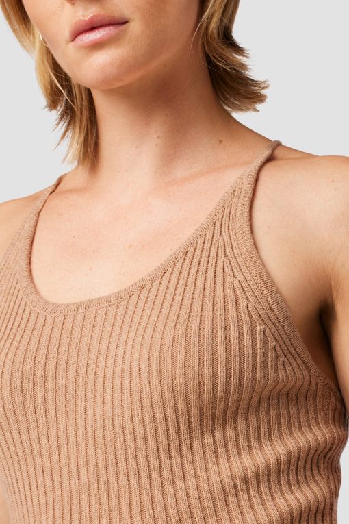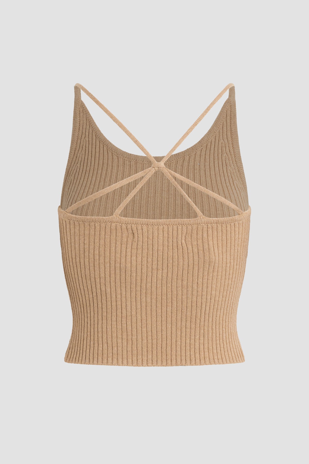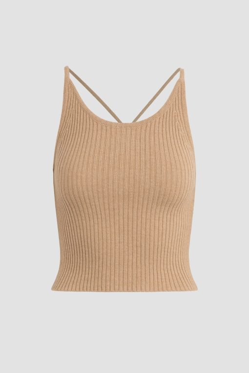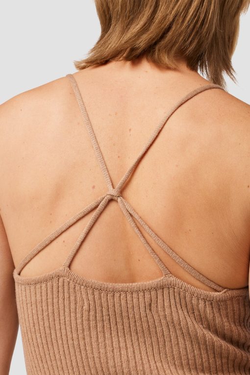 - Cut from a soft knit, our Knot Back Sweater Tank in camel is finished with a strappy back and slim silhouette. Pairs well as a set when styled with the Button Down Sweater.