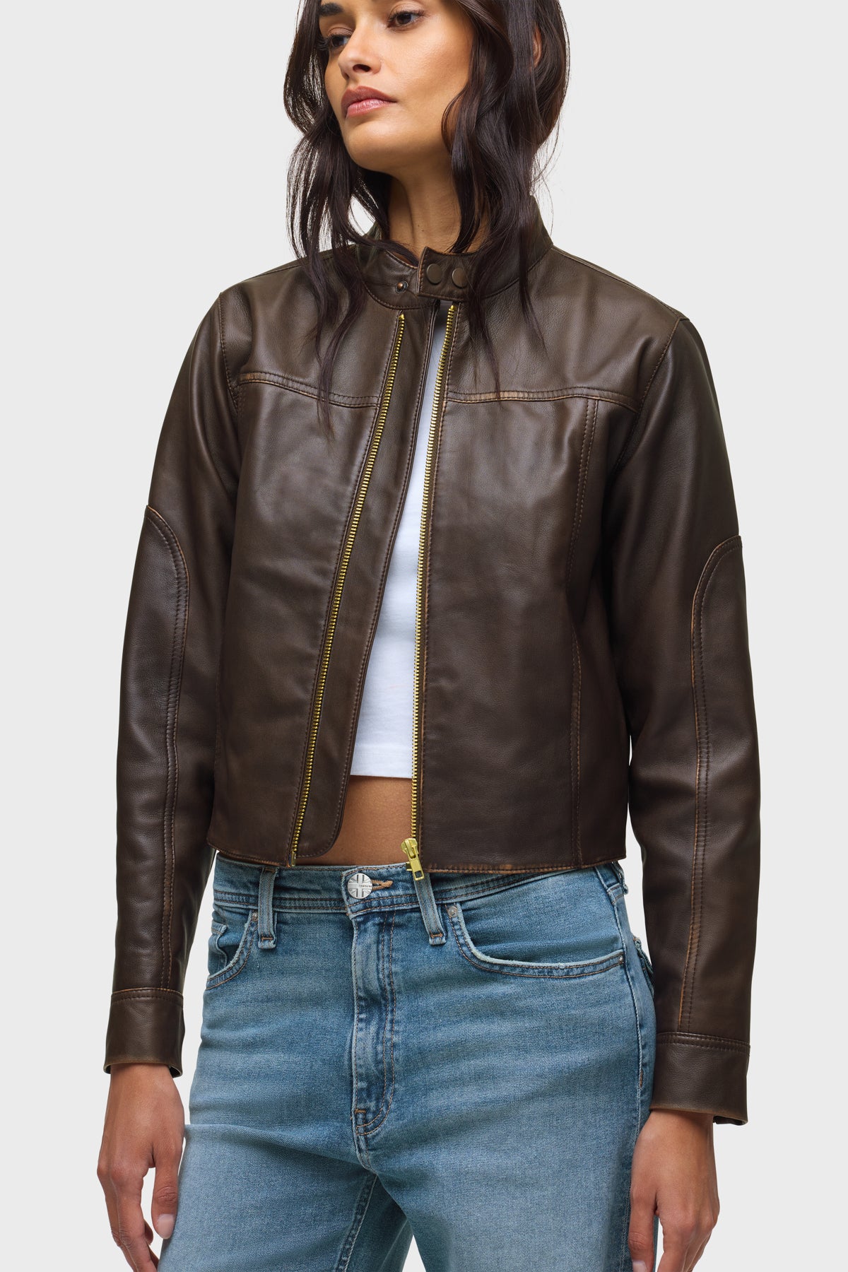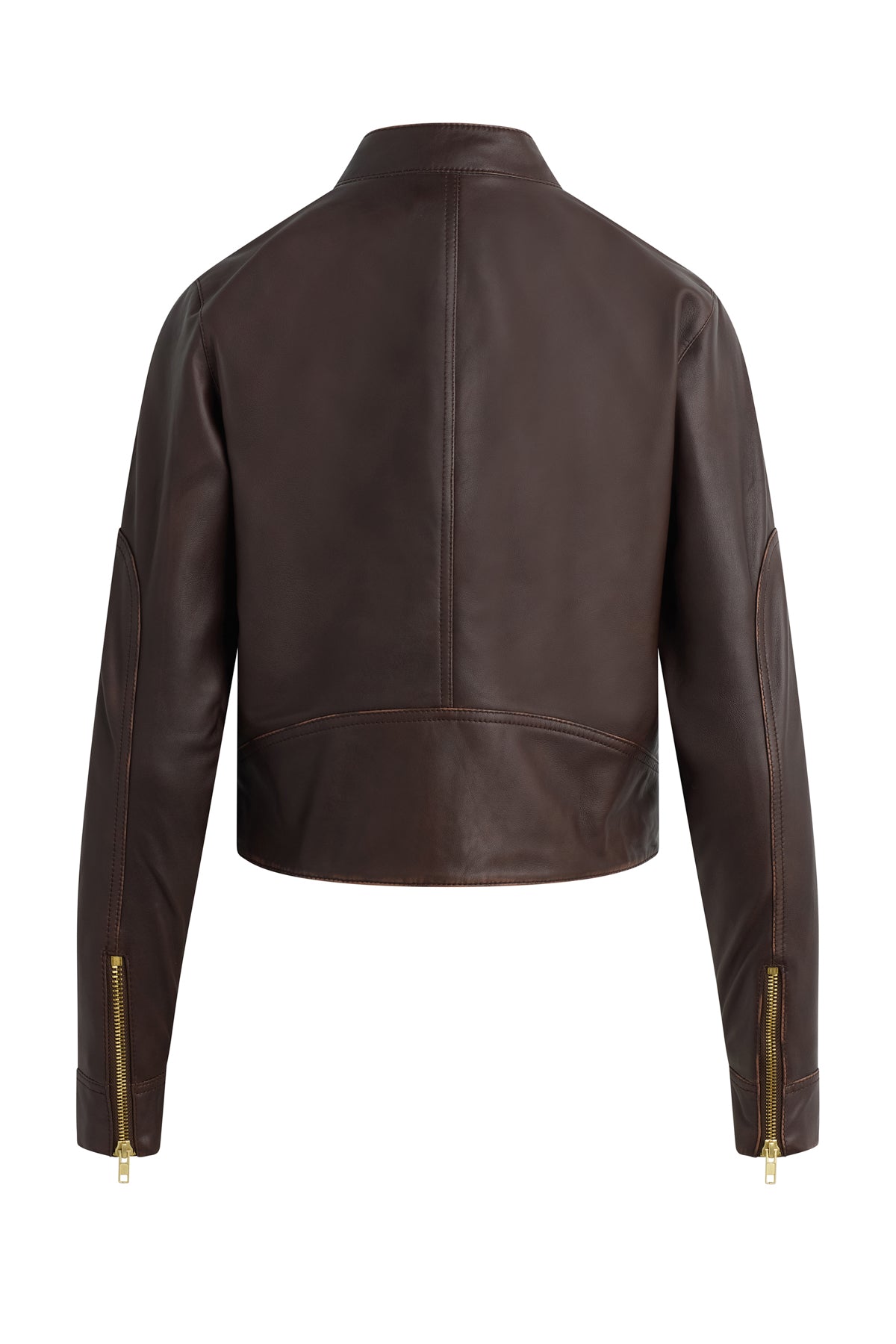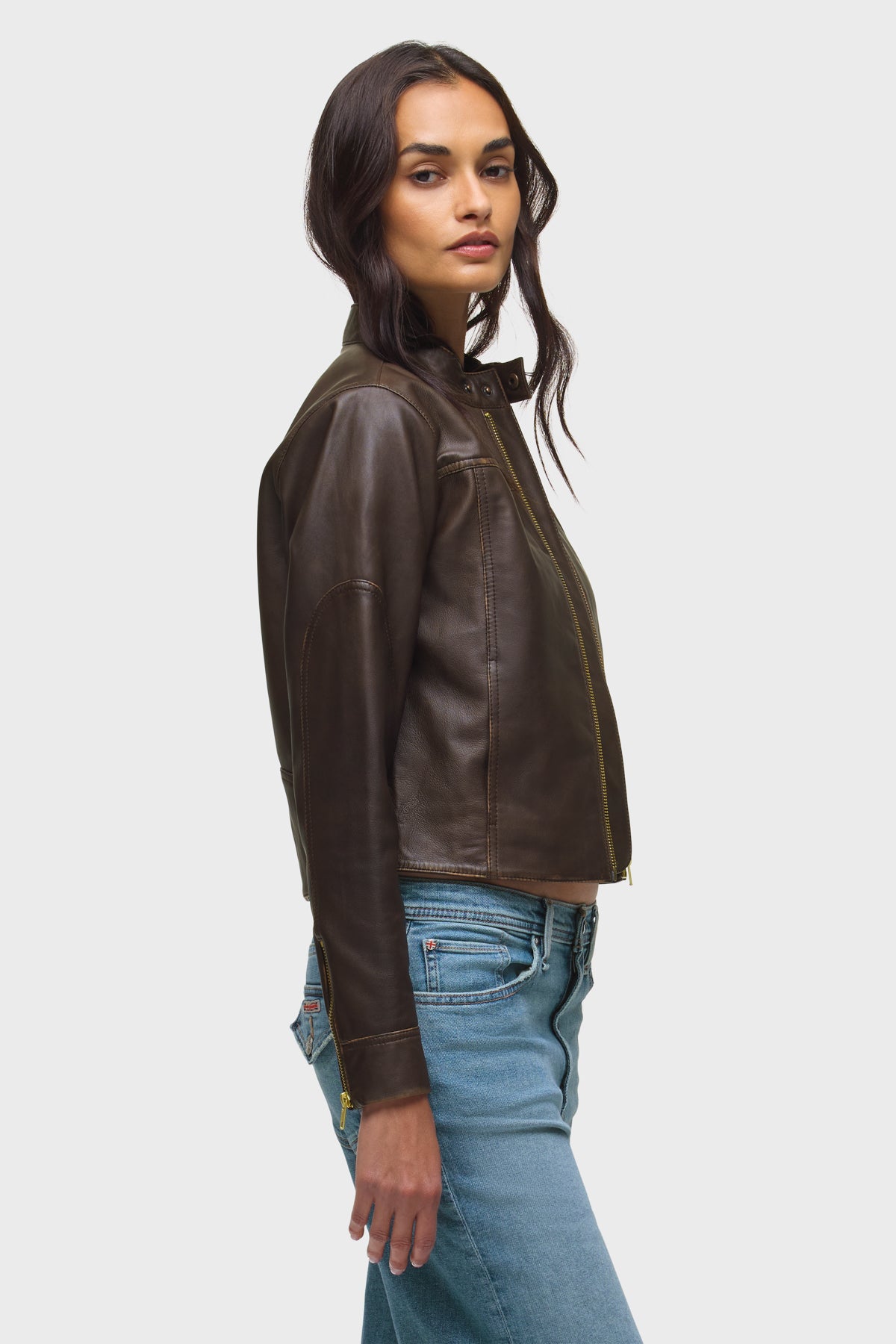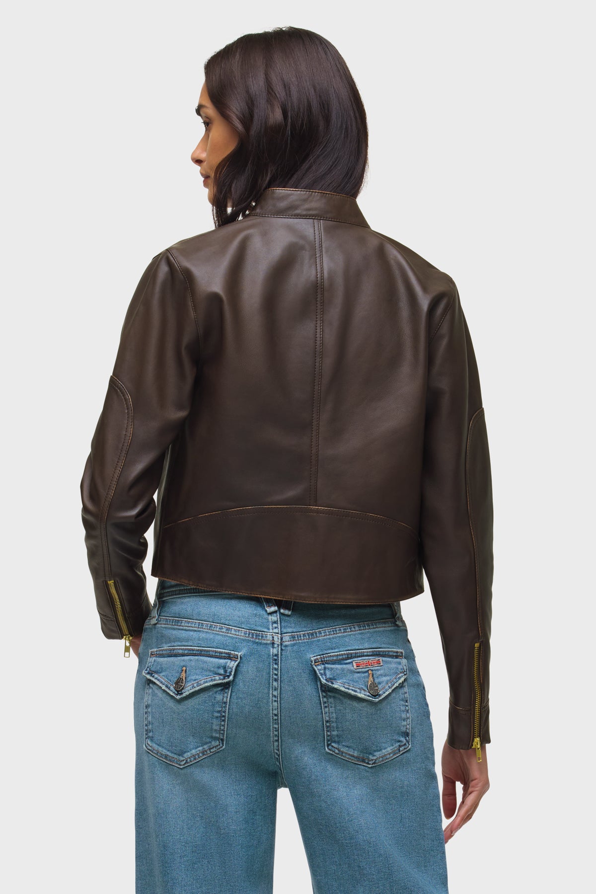 - The Moto Jacket in Umber is a classic jacket made of dark brown genuine leather. This leather jacket features zippers at the sleeves with gussets and a center front zipper with a snap closure at the collar stand. The snaps and zipper are finished in an antique gold finish.