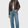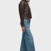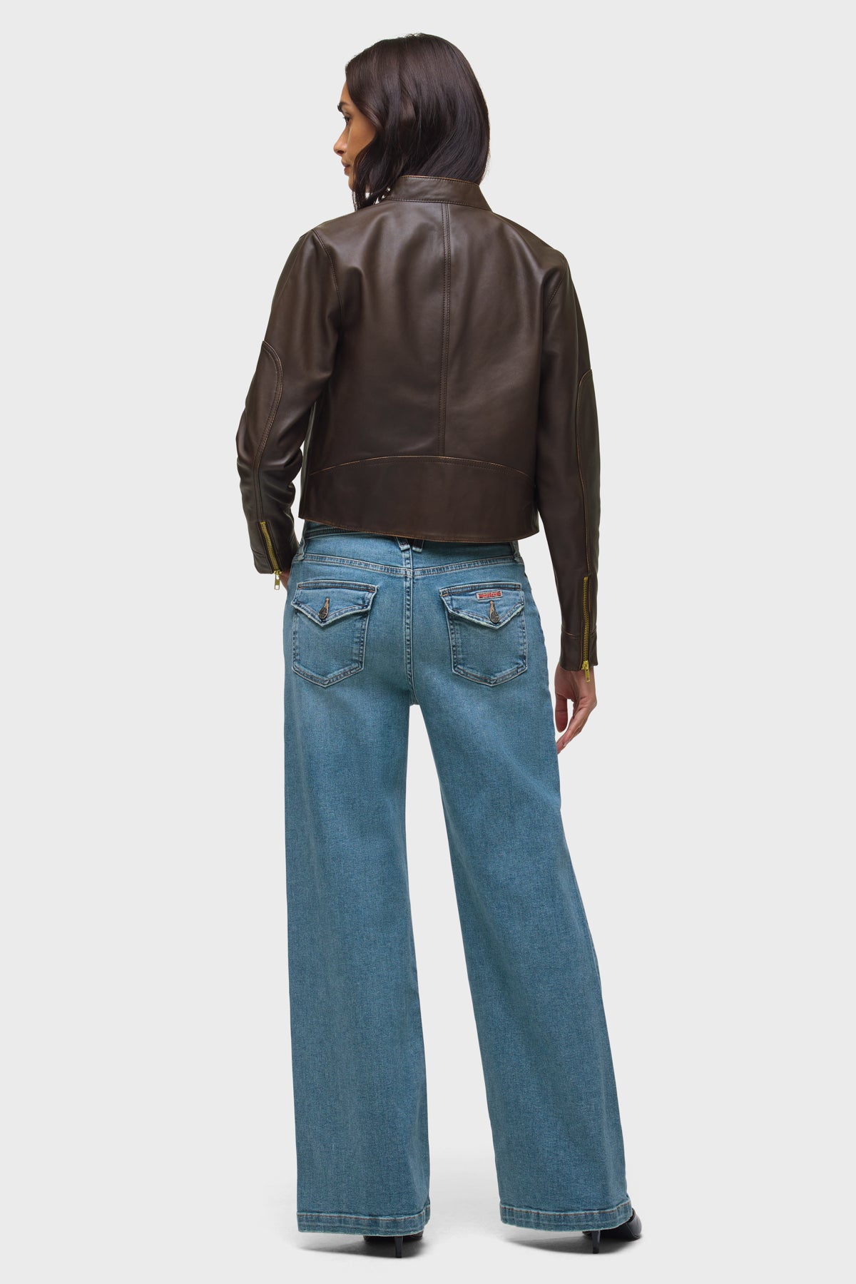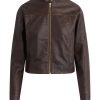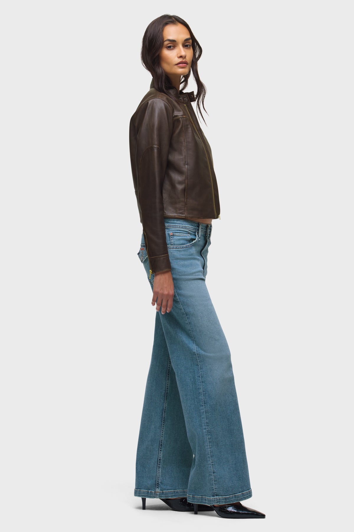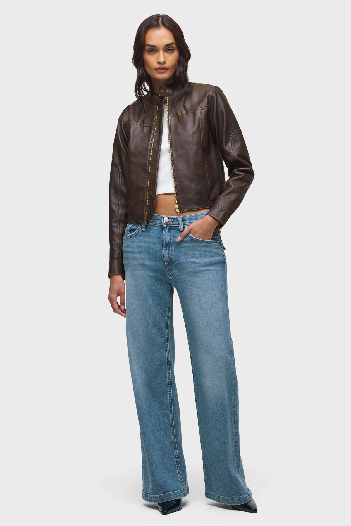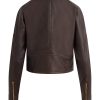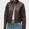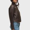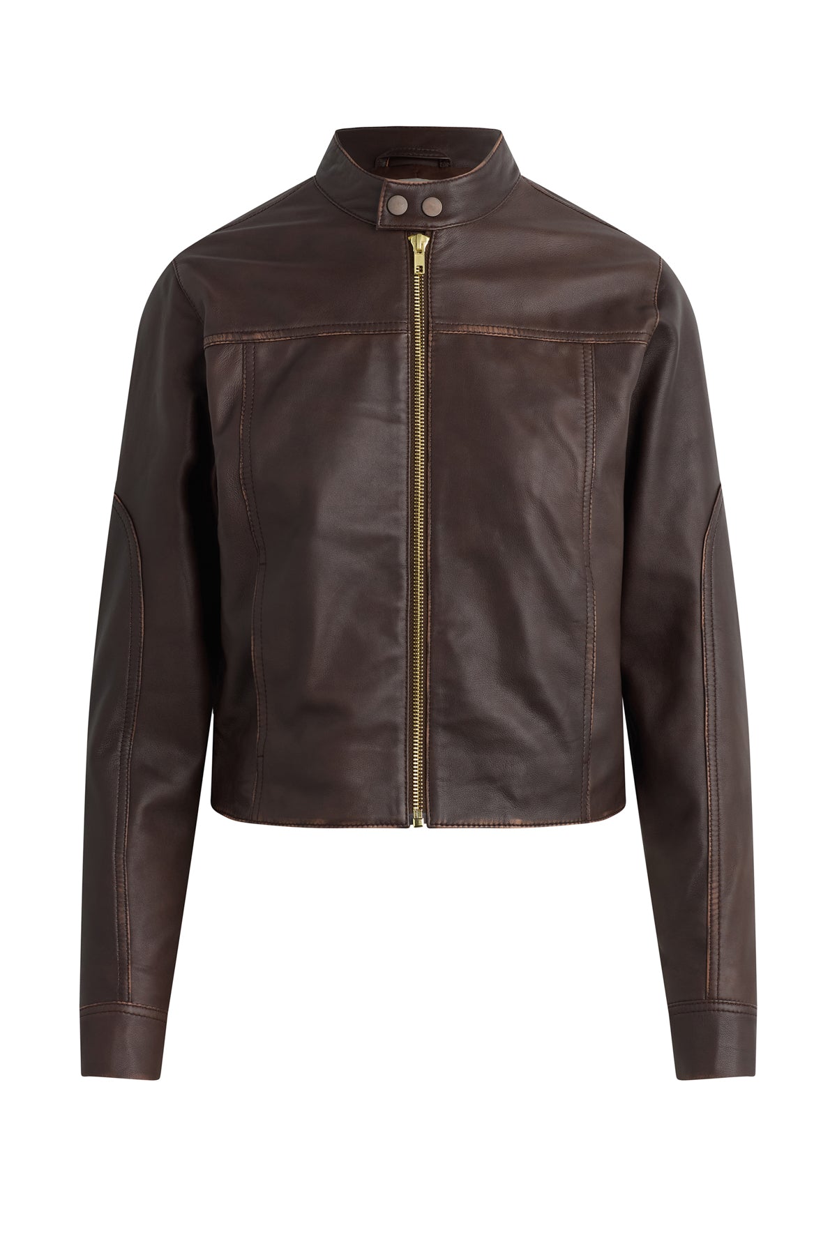 - The Moto Jacket in Umber is a classic jacket made of dark brown genuine leather. This leather jacket features zippers at the sleeves with gussets and a center front zipper with a snap closure at the collar stand. The snaps and zipper are finished in an antique gold finish.