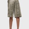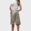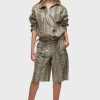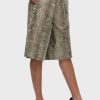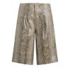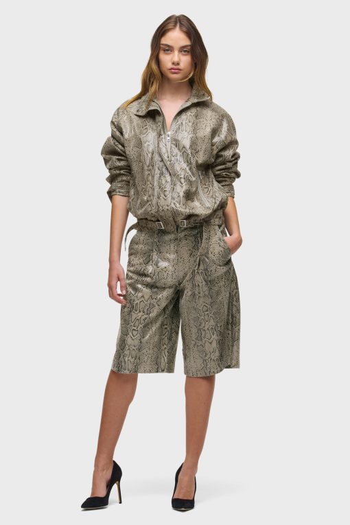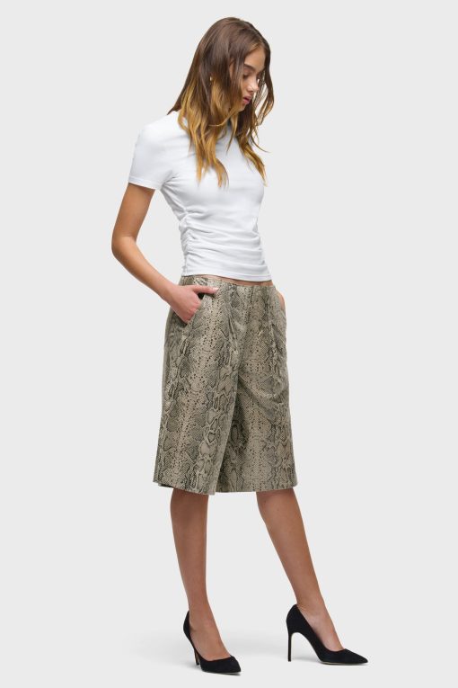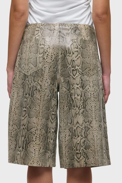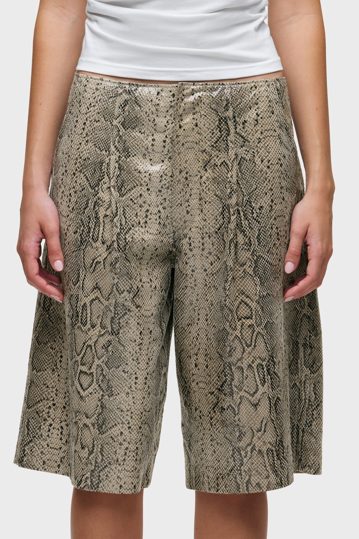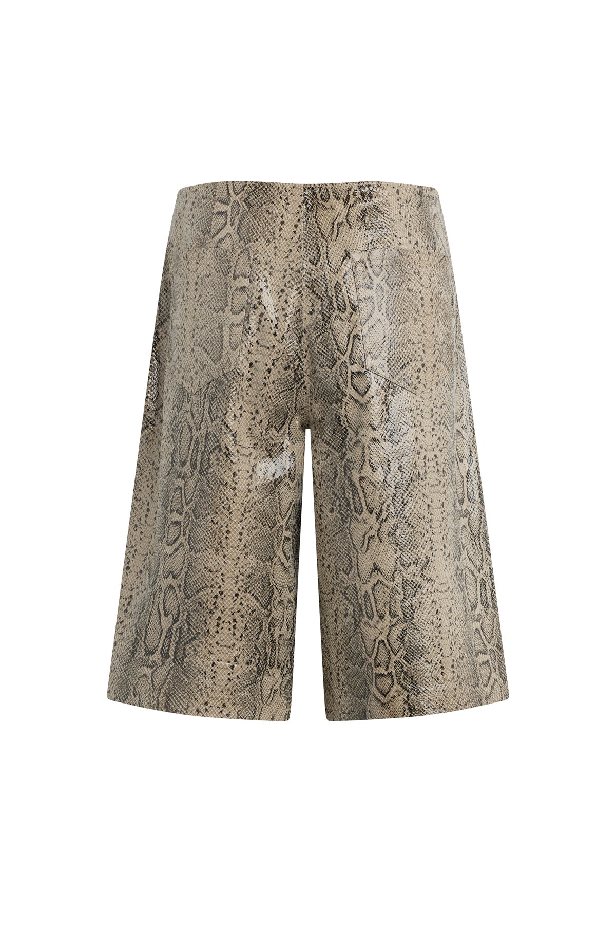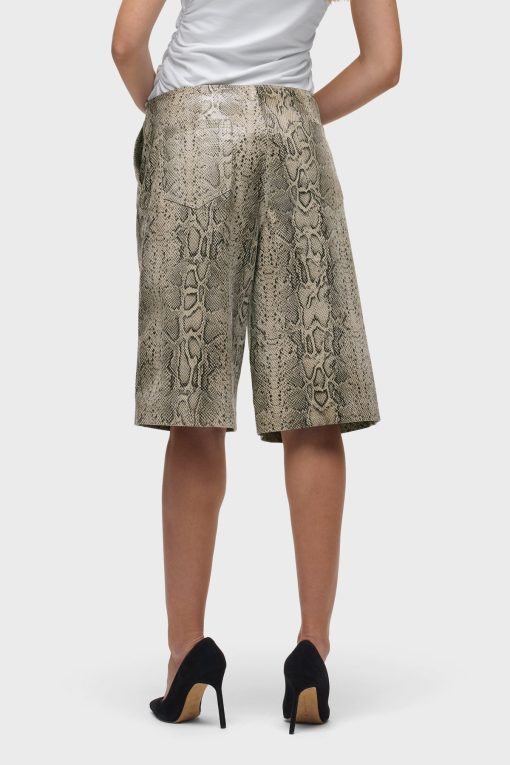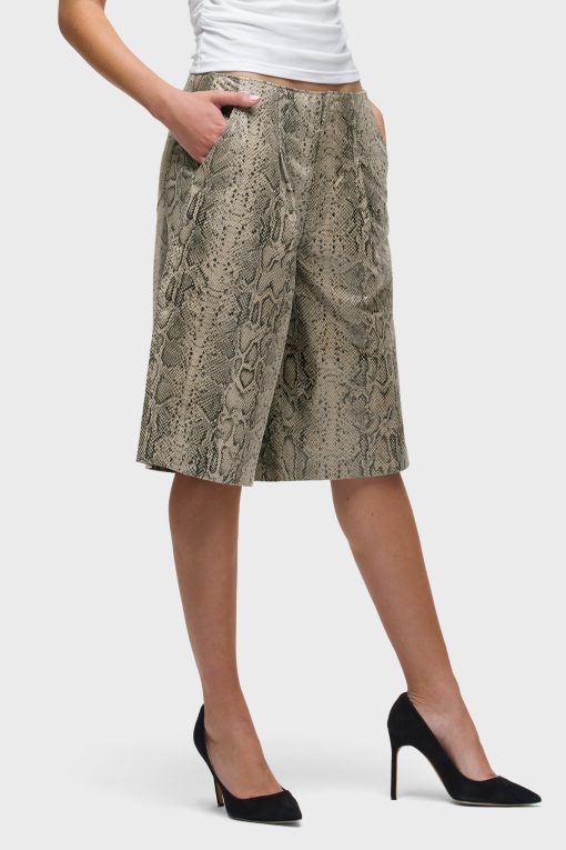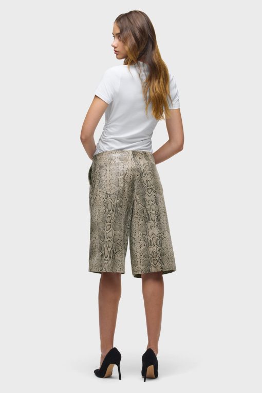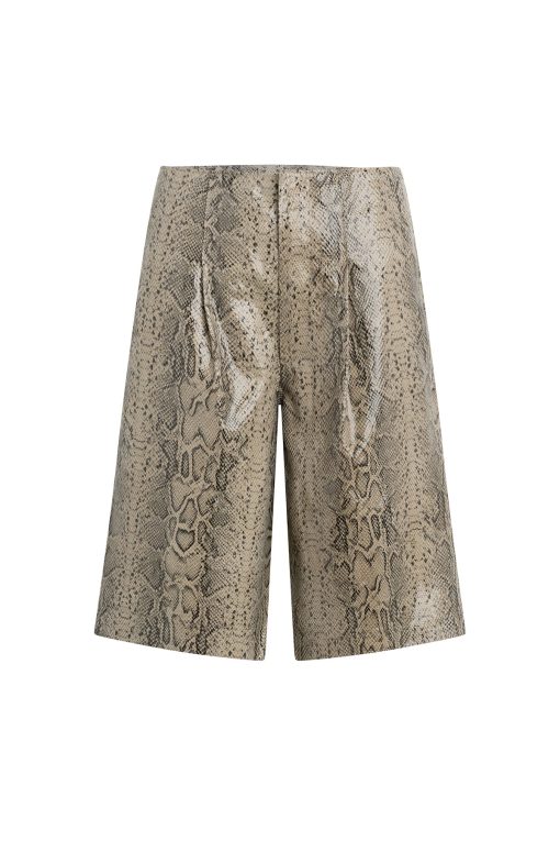 - The Pleated Trouser Short in Taupe Snake features a clean front with pleats and trouser pockets. These chic shorts are made of snake-printed foil on genuine leather and finished with hooks and bars at the inside waistband for closure.