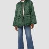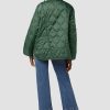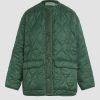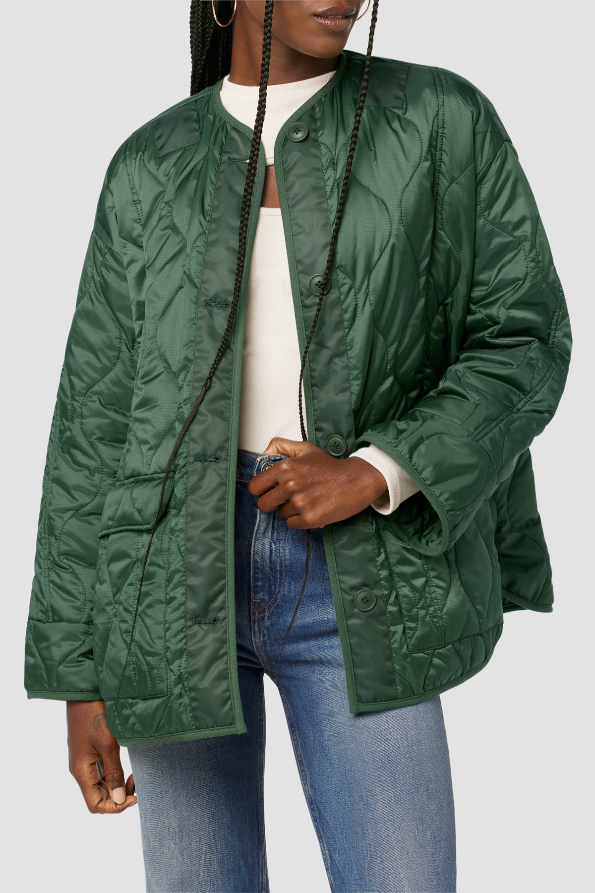 - The Oversized Quilted Jacket is designed for lightweight comfort, made from 100% quilted nylon in the shade Rifle Green. Features a button front and flap pockets.