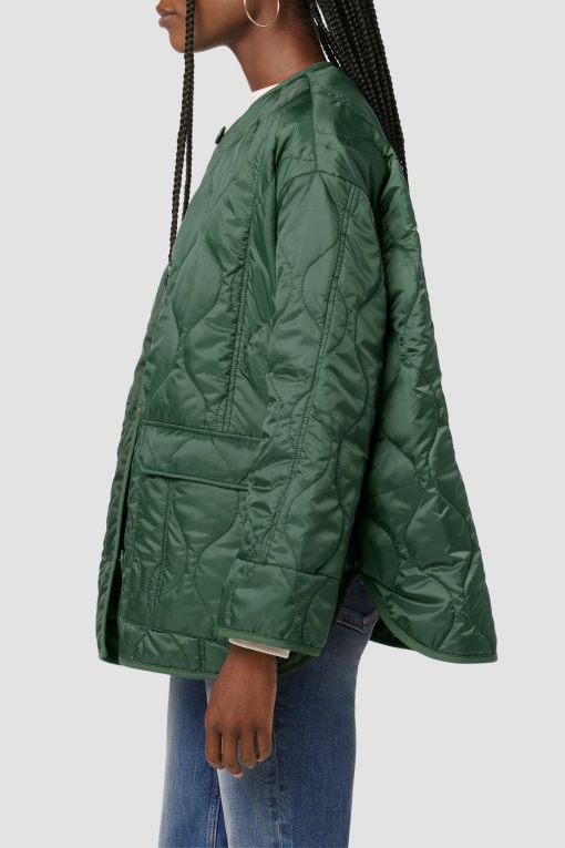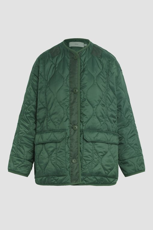 - The Oversized Quilted Jacket is designed for lightweight comfort, made from 100% quilted nylon in the shade Rifle Green. Features a button front and flap pockets.
