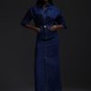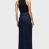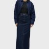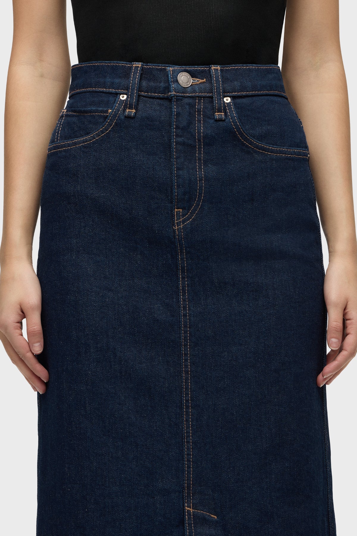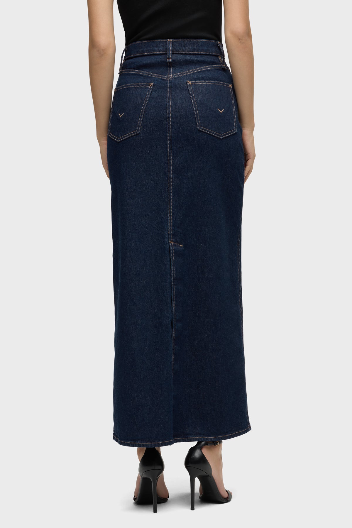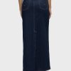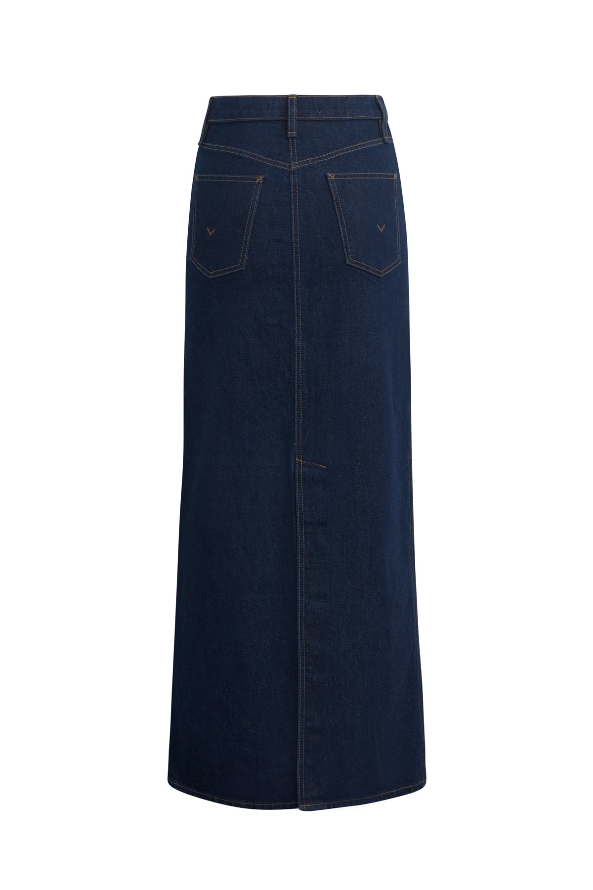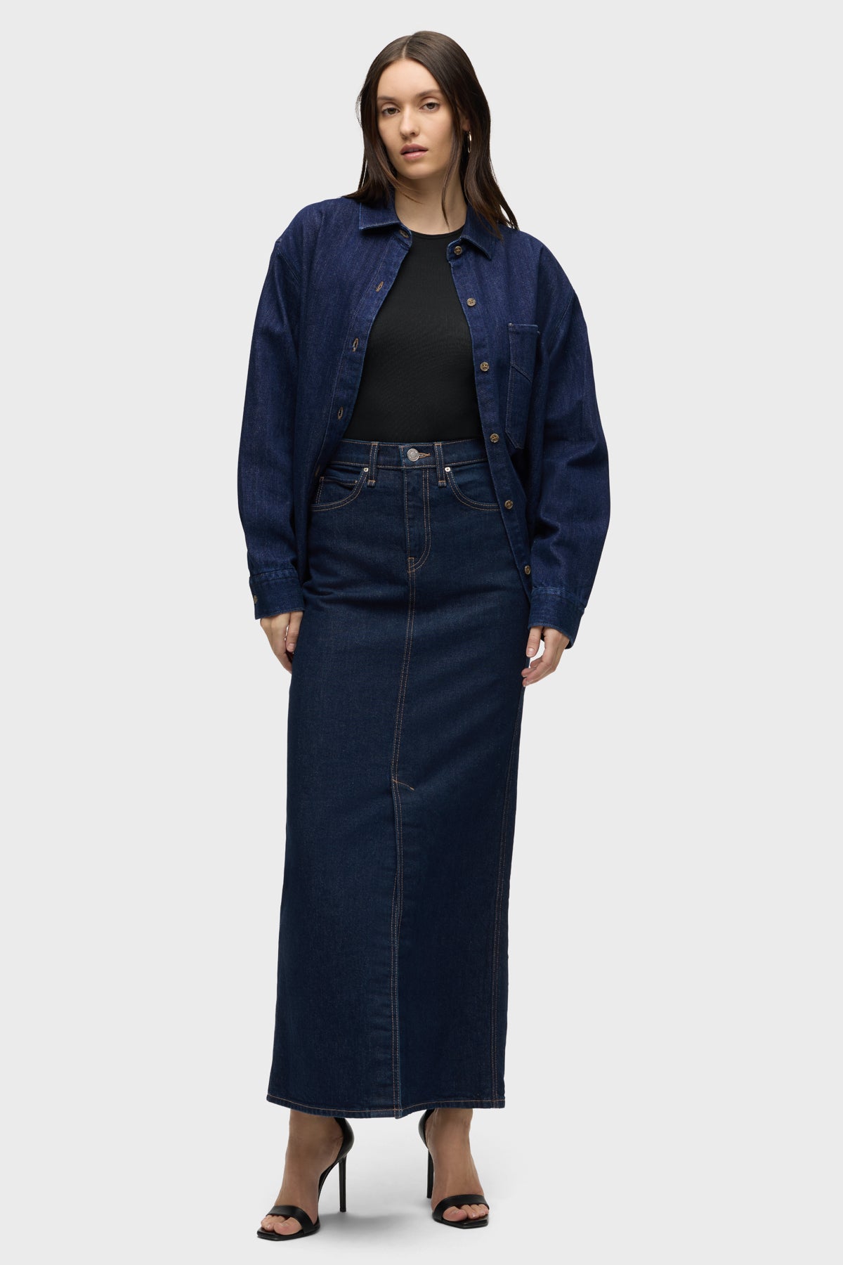 - Our Reconstructed Skirt Maxi in dark indigo Eve is cut from Italian premium comfort stretch denim with just enough stretch for a flattering fit. With a maxi length, it features front and back vents for an easy-to-wear fit.