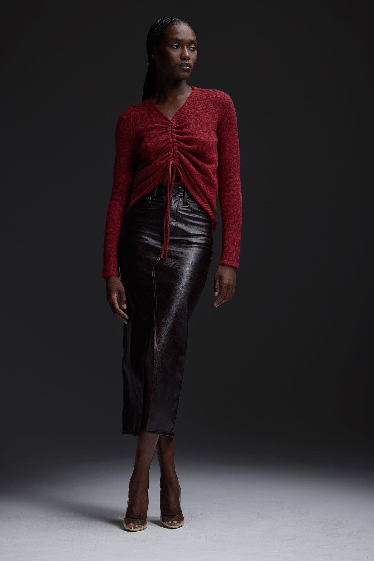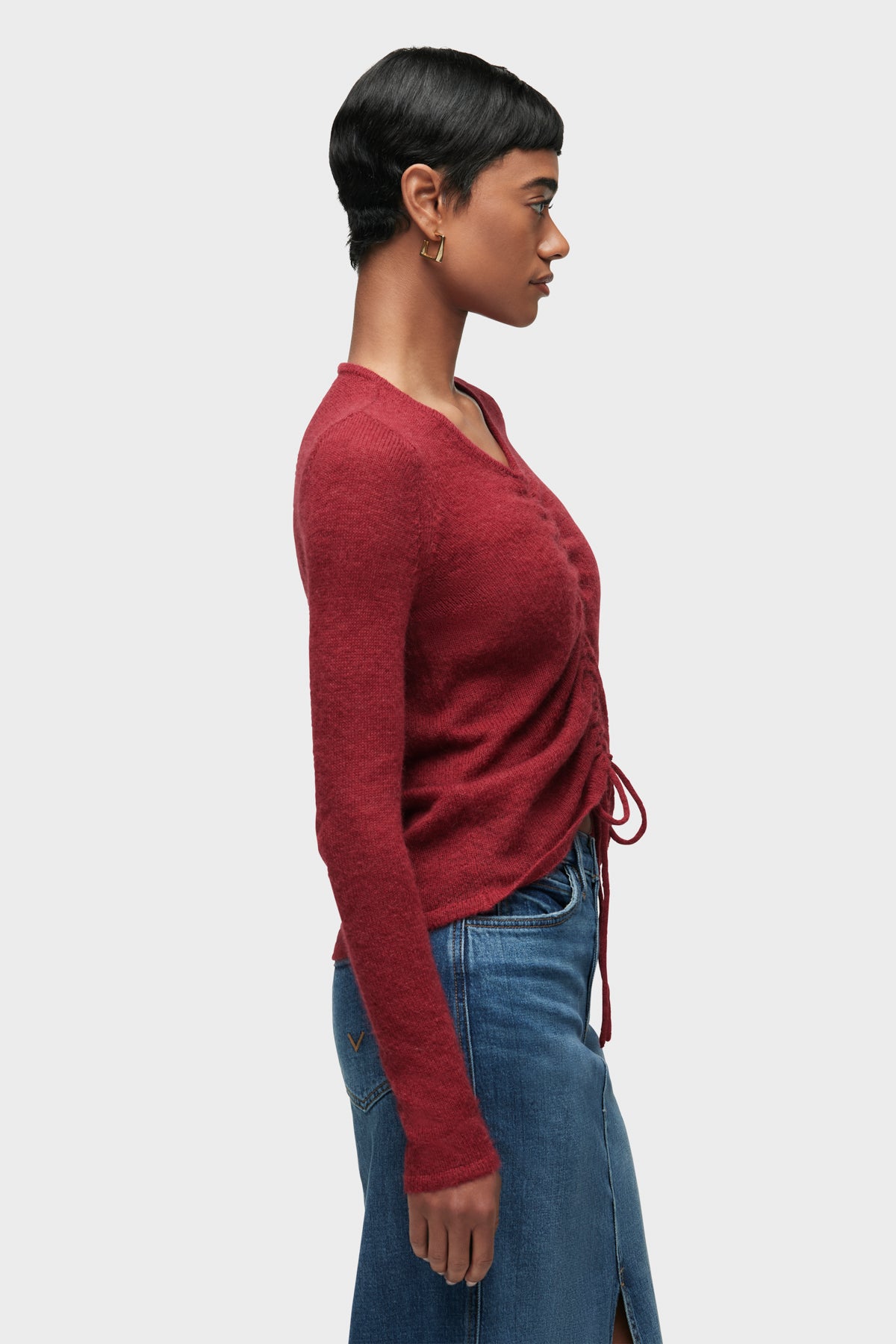 - Knitted from a soft and fuzzy yarn for added texture, the Ruched Long Sleeve Sweater features long sleeves and a slim fit. Adjustable ties and ruching completes the look.