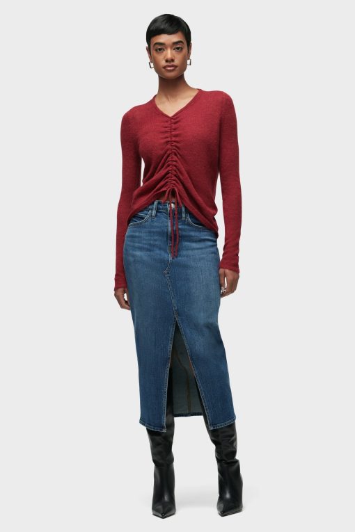 - Knitted from a soft and fuzzy yarn for added texture, the Ruched Long Sleeve Sweater features long sleeves and a slim fit. Adjustable ties and ruching completes the look.