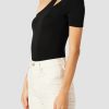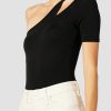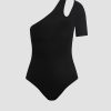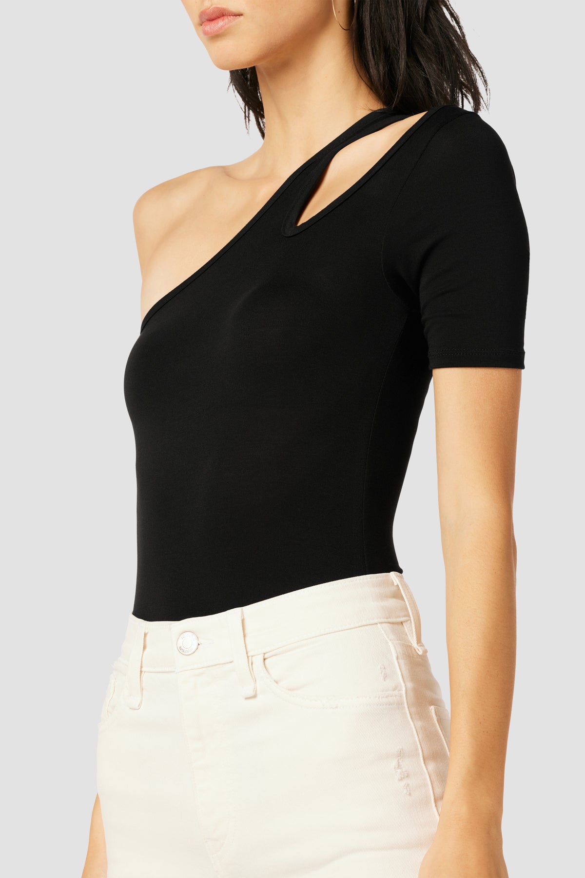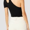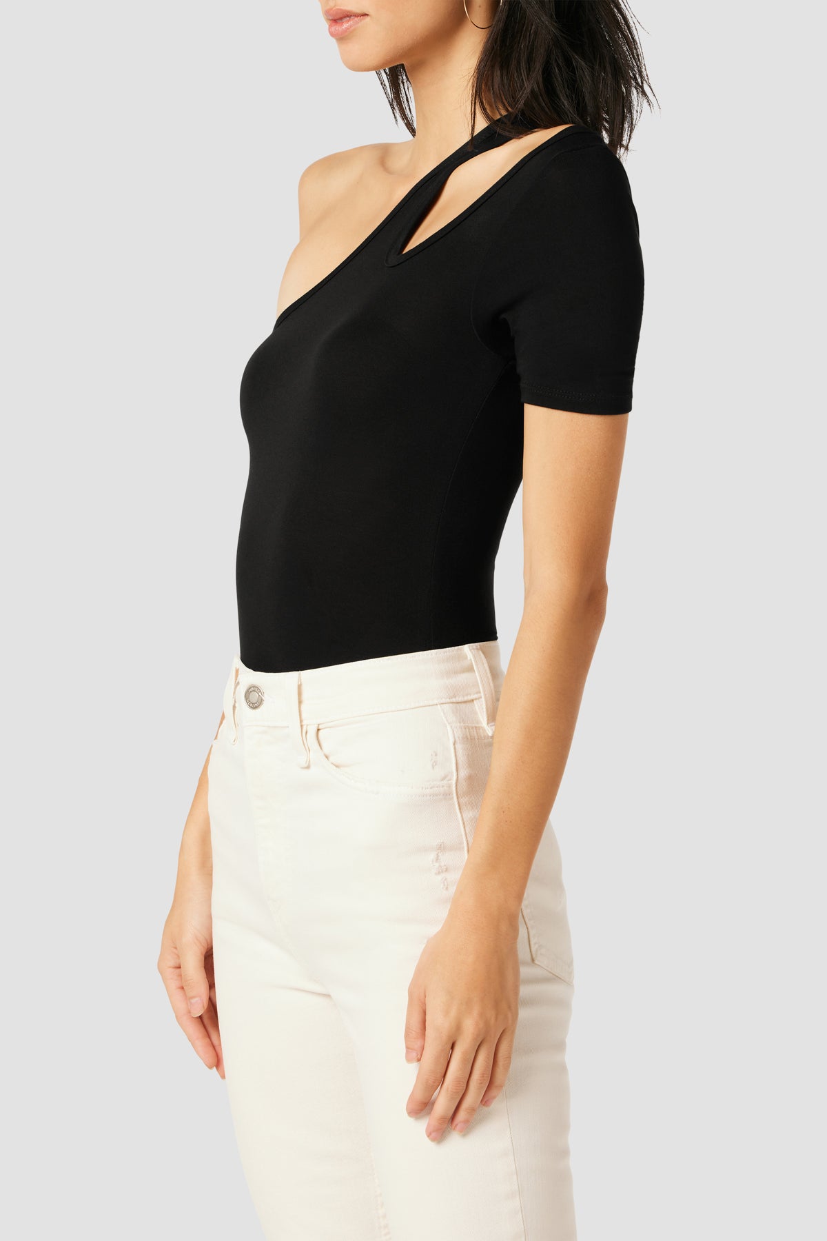 - The Short Sleeve Asymmetrical Bodysuit in Black features a bodycon silhouette with shoulder cutout.