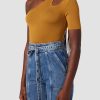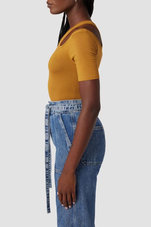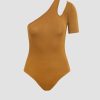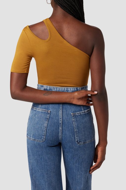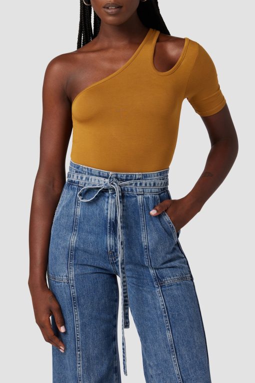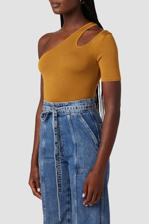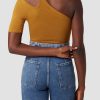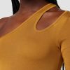 - The Short Sleeve Asymmetrical Bodysuit in Desert Sand features a bodycon silhouette with shoulder cutout.