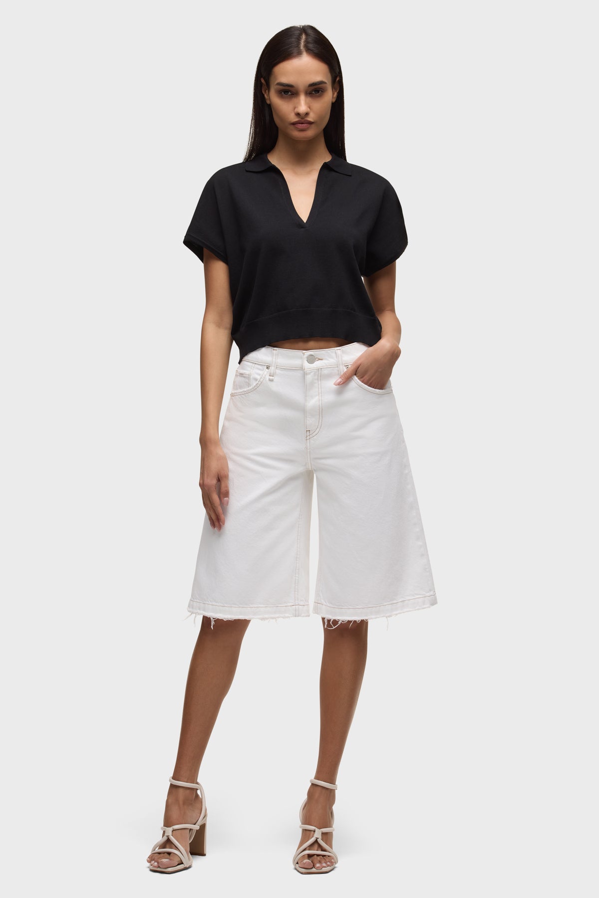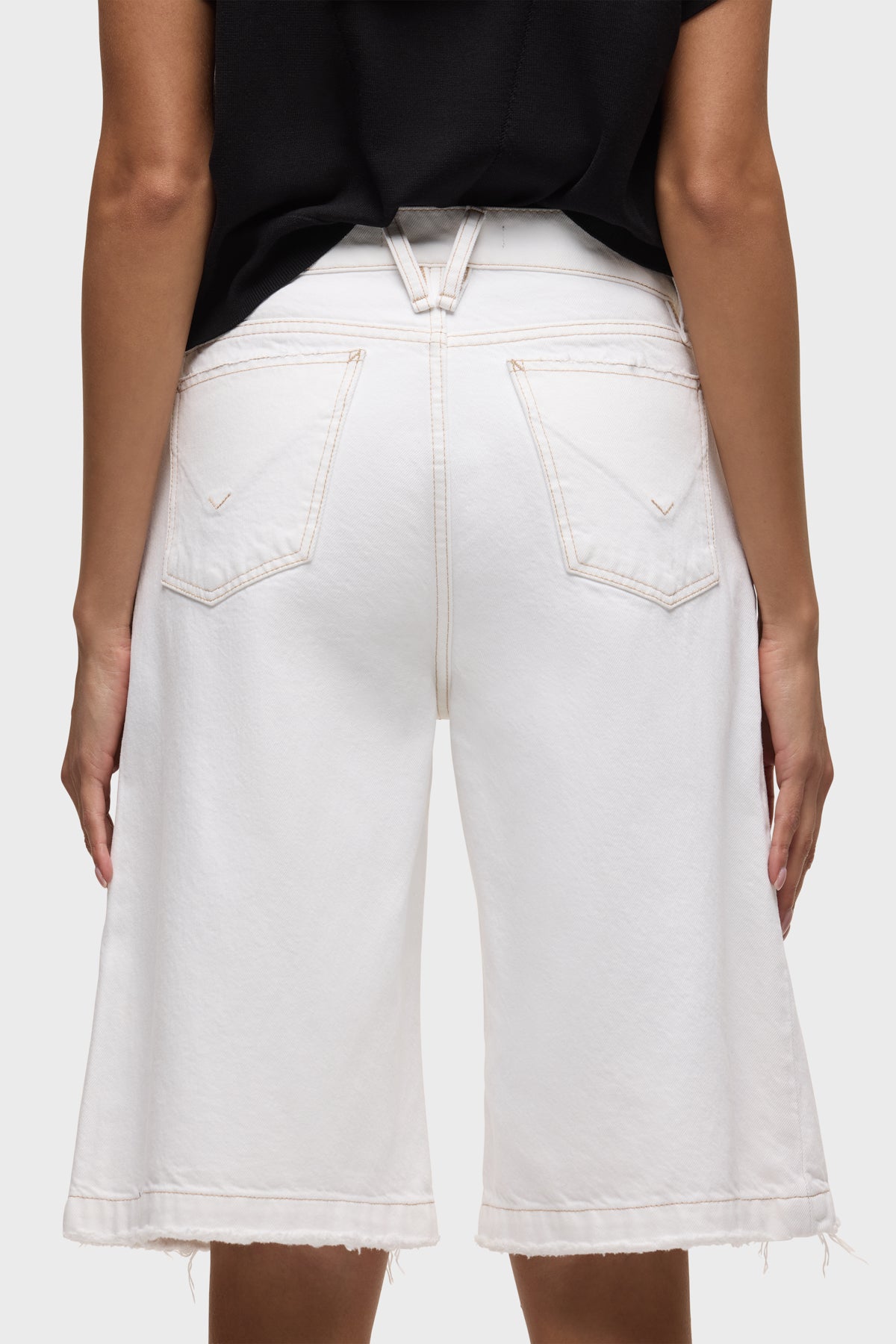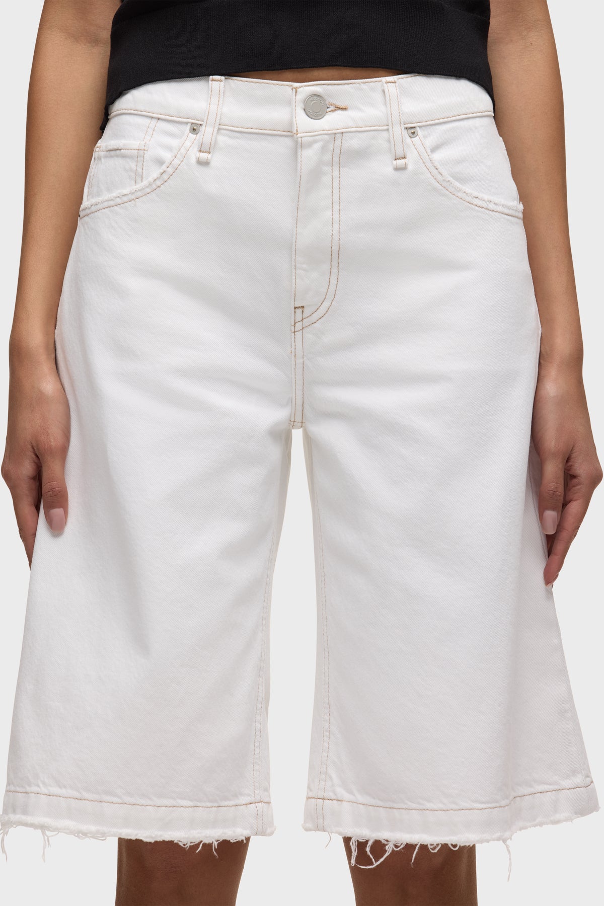 - The Skylar Dropped Long Short in White is a five-pocket short inspired by skate menswear. Designed to be worn relaxed, this long short has a 13″ inseam with a raw hem. It is made of rigid denim in an optic white shade.