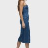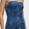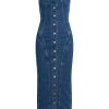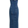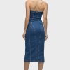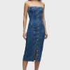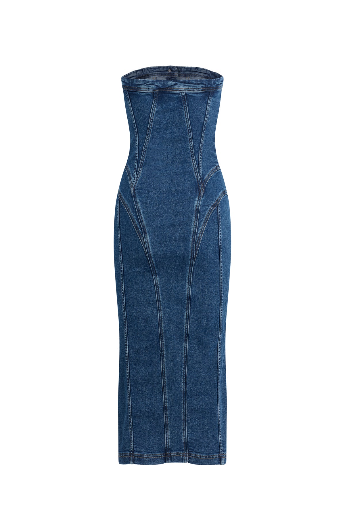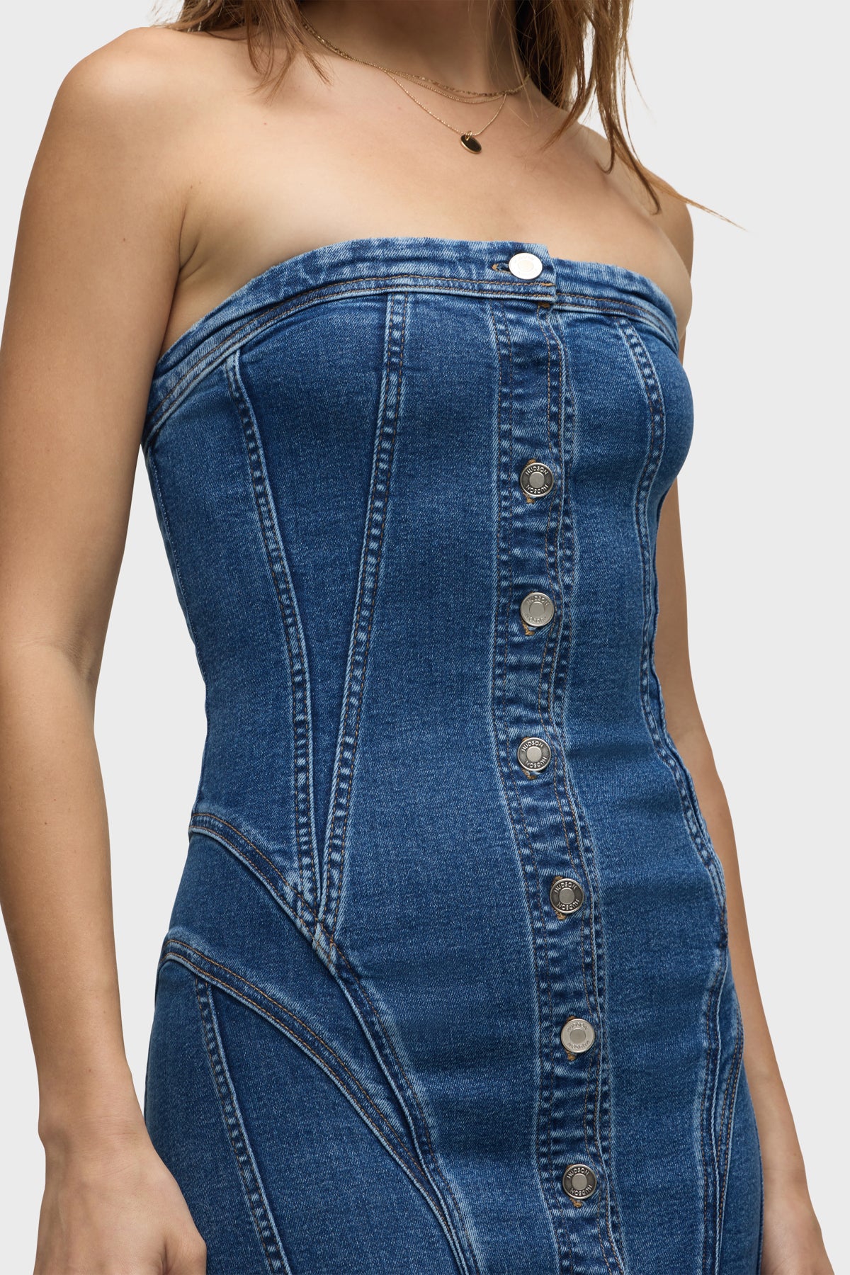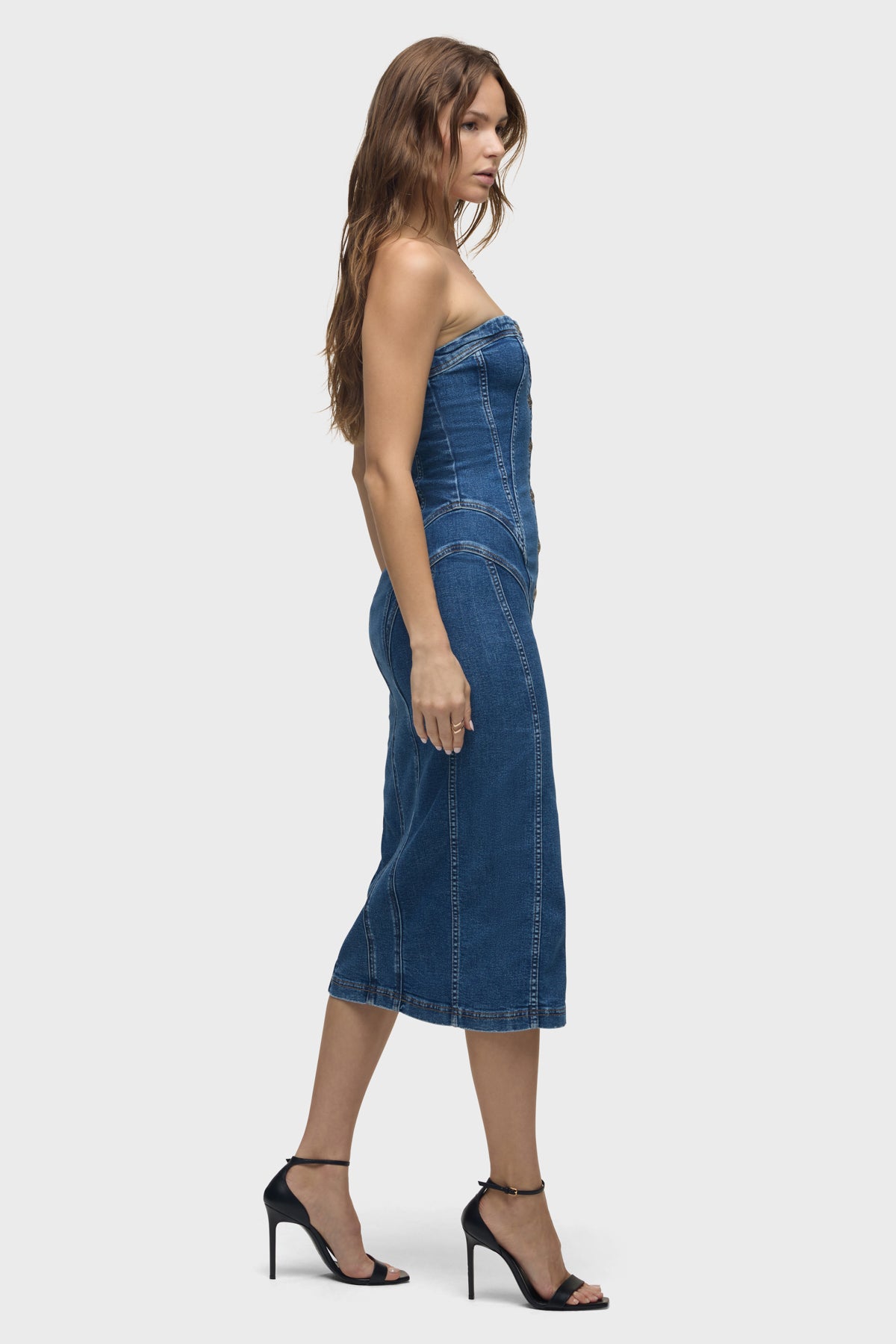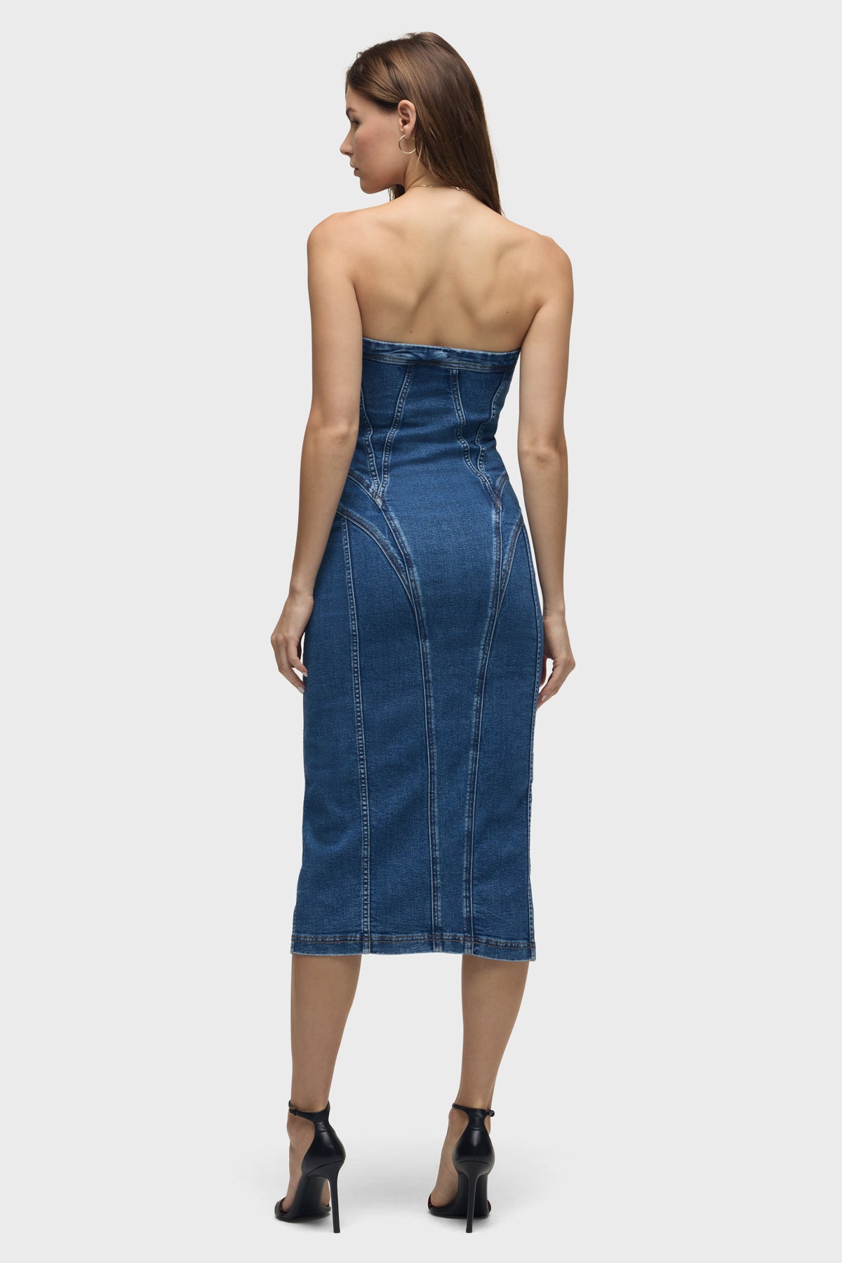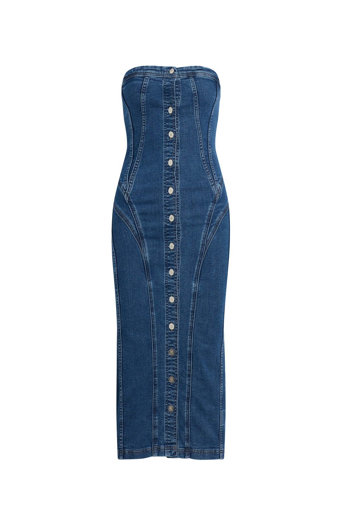 - Our Strapless Seamed Midi Dress in Cupcake features flattering curved seam lines and an exposed button placket down the front. This strapless dress is made of stretch denim designed to hug every curve in a medium dark indigo wash with heavy stone washing.