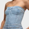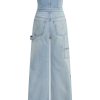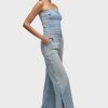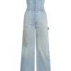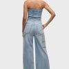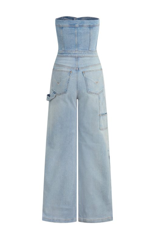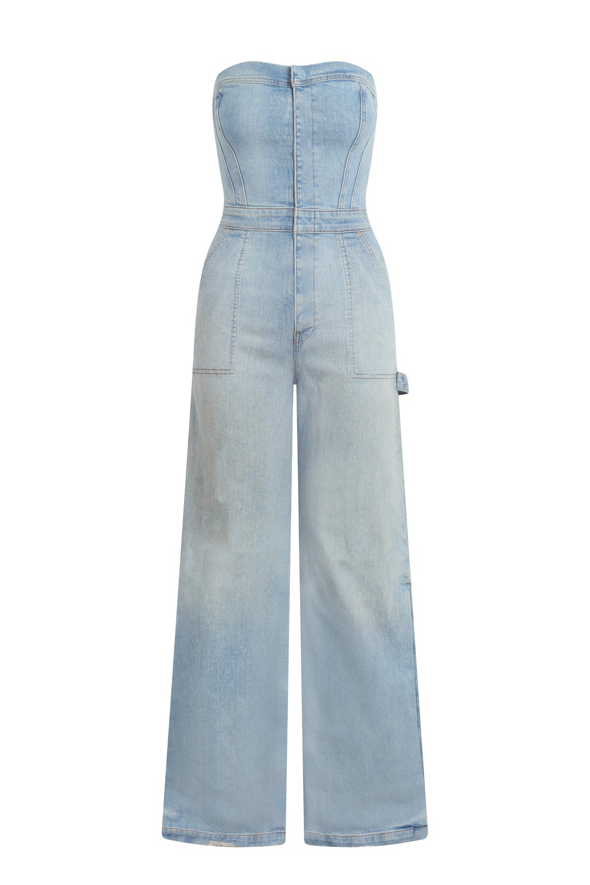 - The Strapless Wide Leg Jumpsuit in Tough is a our one-and-done jumpsuit, featuring mixed carpenter detailing and a flattering silhouette. It is made of a comfort stretch denim in a light indigo wash. The jumpsuit is finished with a center front zipper for entry, strapless styling, a hammer loop at back and side snaps down the legs.