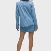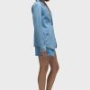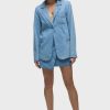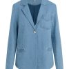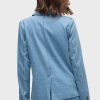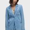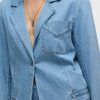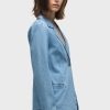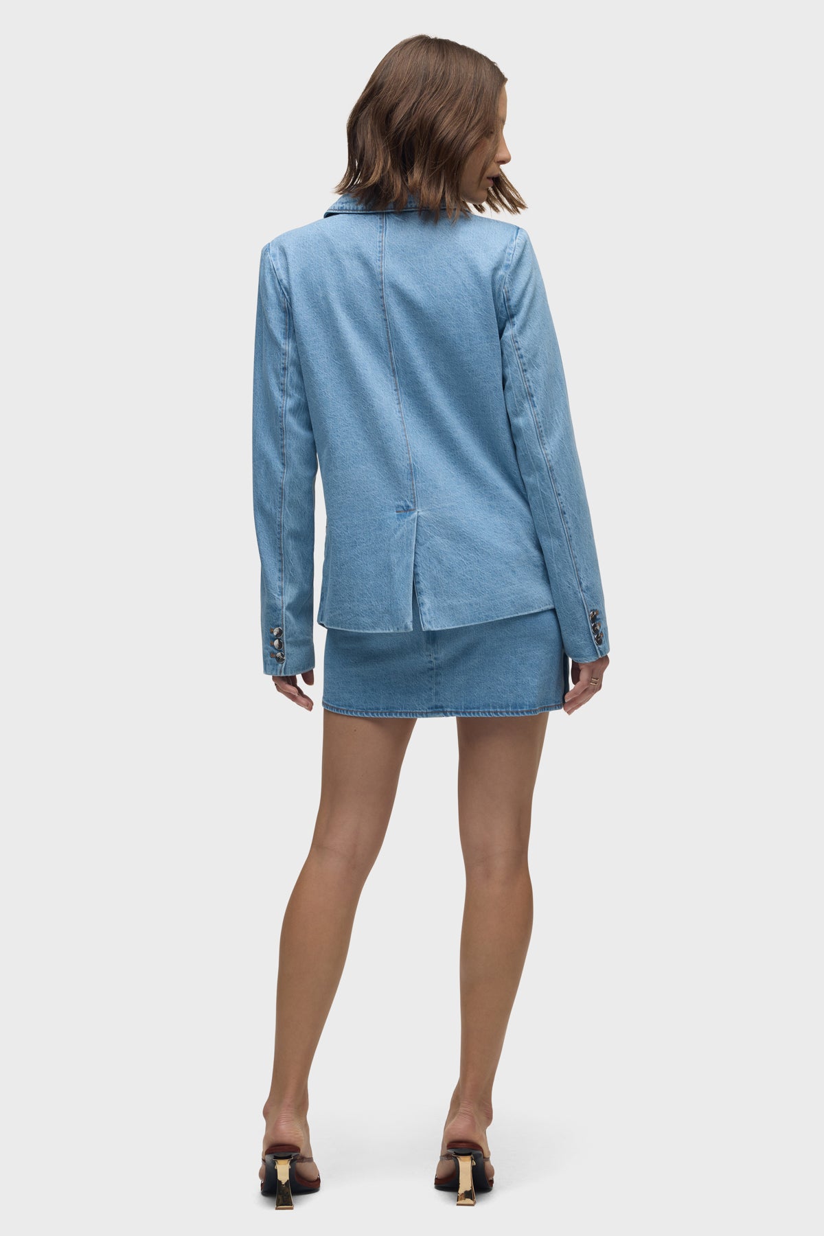 - The Stylized Boyfriend Blazer in Mountain features a collar, lapel with a single button closure, buttons at the sleeve opening and a vent at the center back. This closet classic is made from lightweight, rigid denim in a light-medium indigo with heavy stone washing and bleaching.