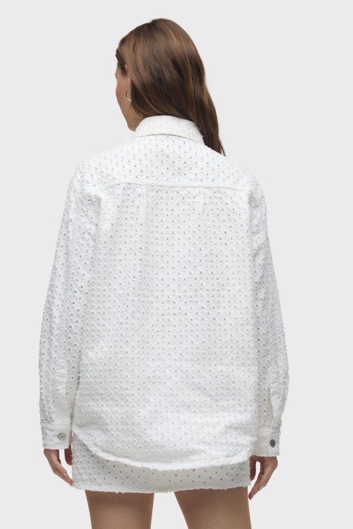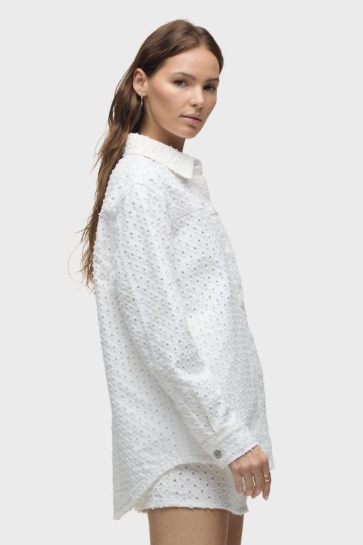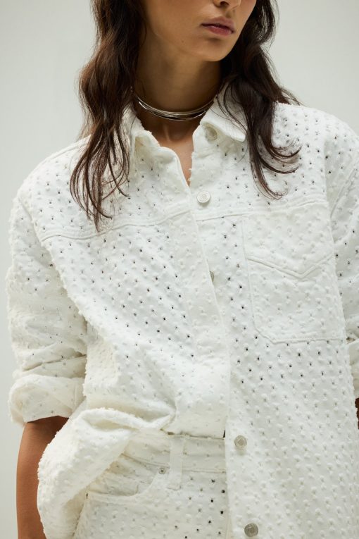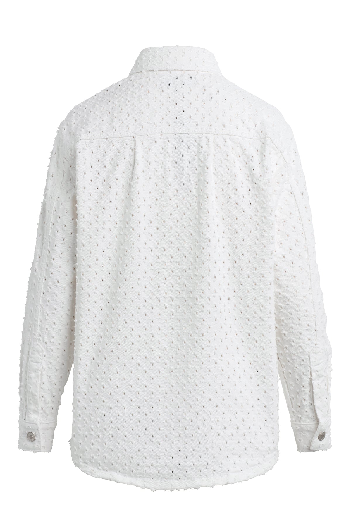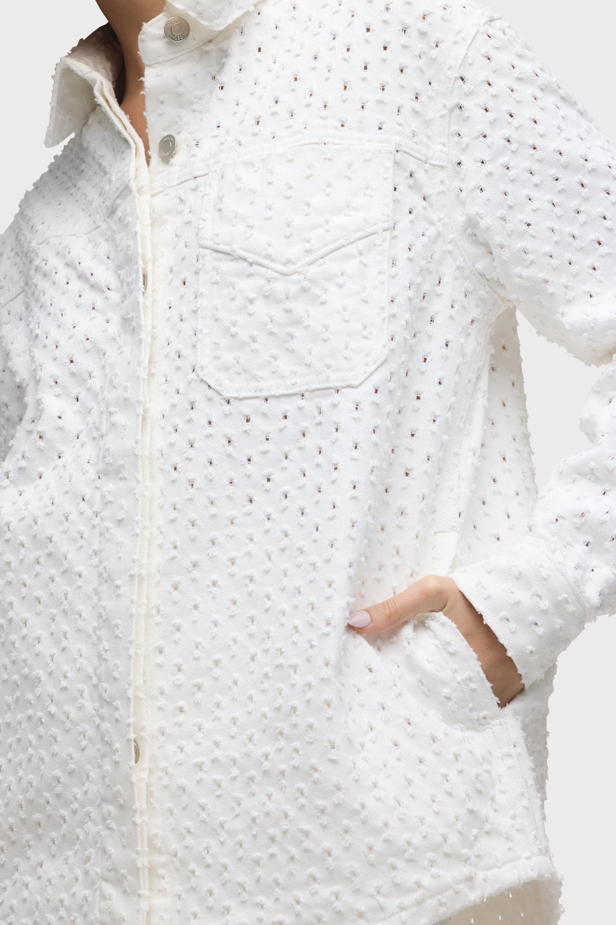 - Our Tattered Shacket in Tattered White features side entry pockets, a collar and a hidden button placket down the front. This style features an optic white rigid fabric with a tattered look.