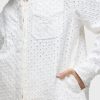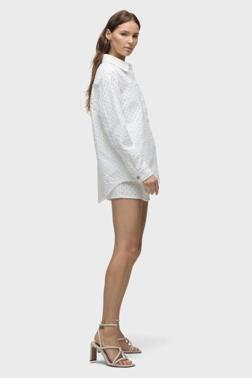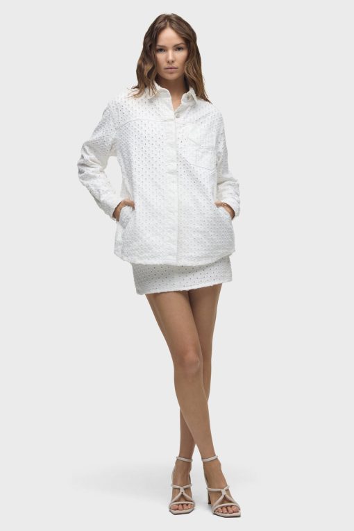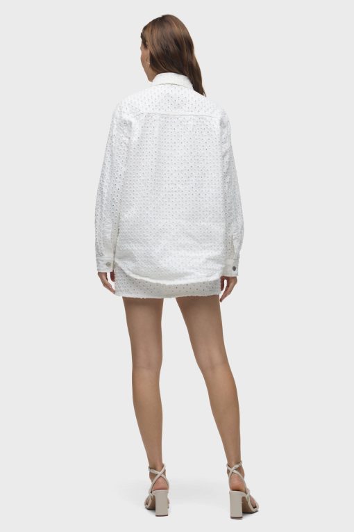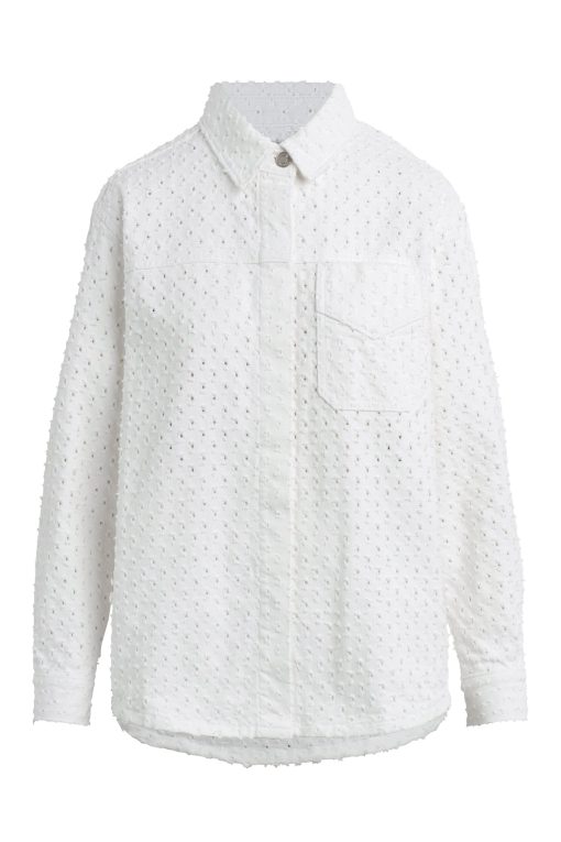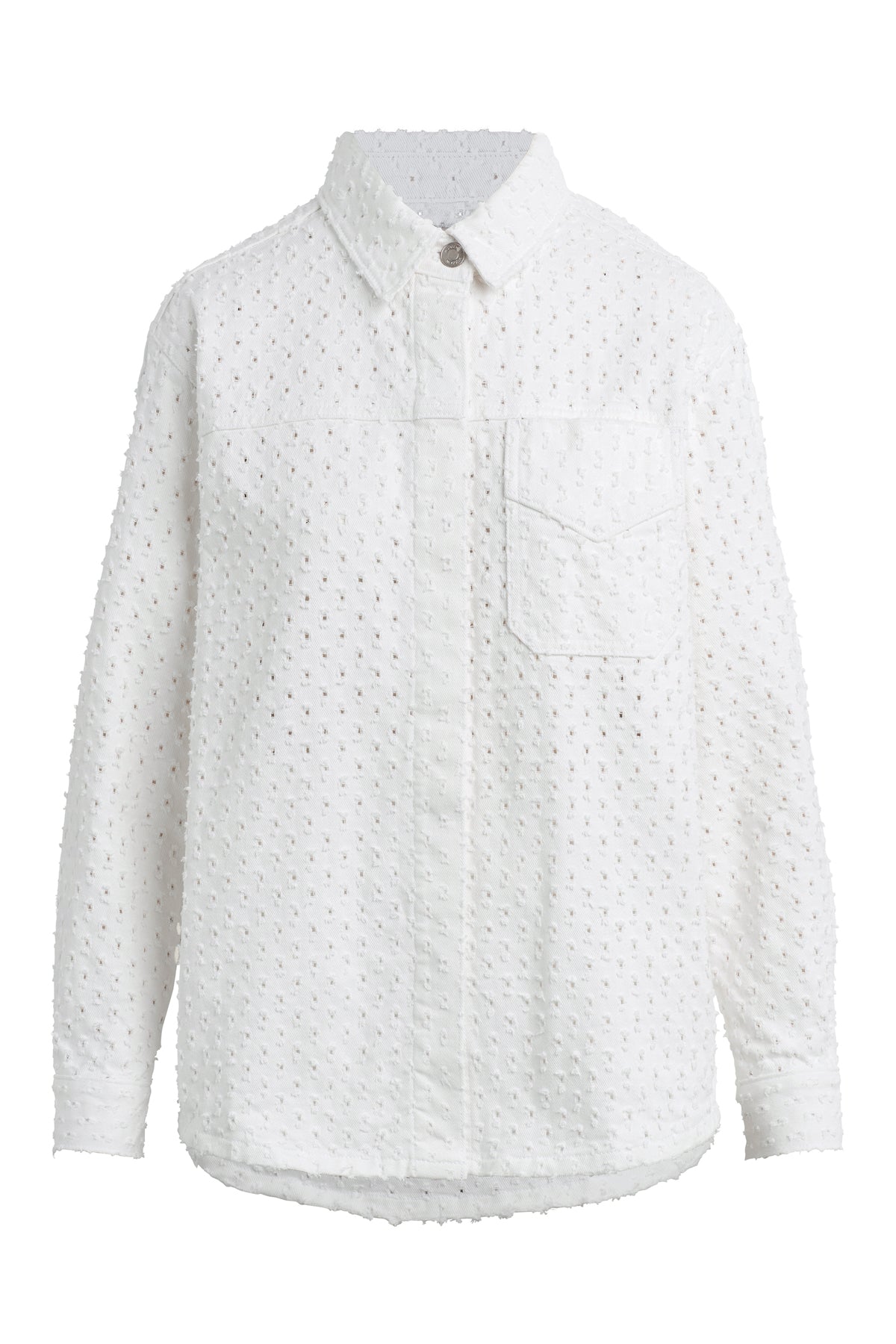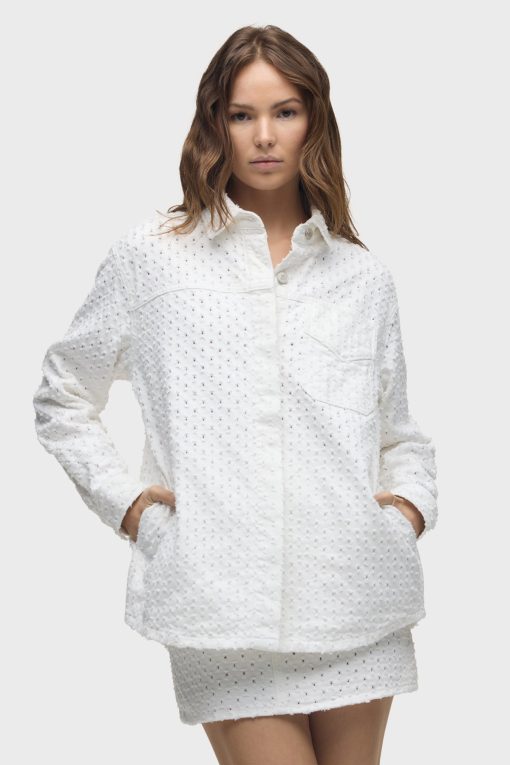 - Our Tattered Shacket in Tattered White features side entry pockets, a collar and a hidden button placket down the front. This style features an optic white rigid fabric with a tattered look.