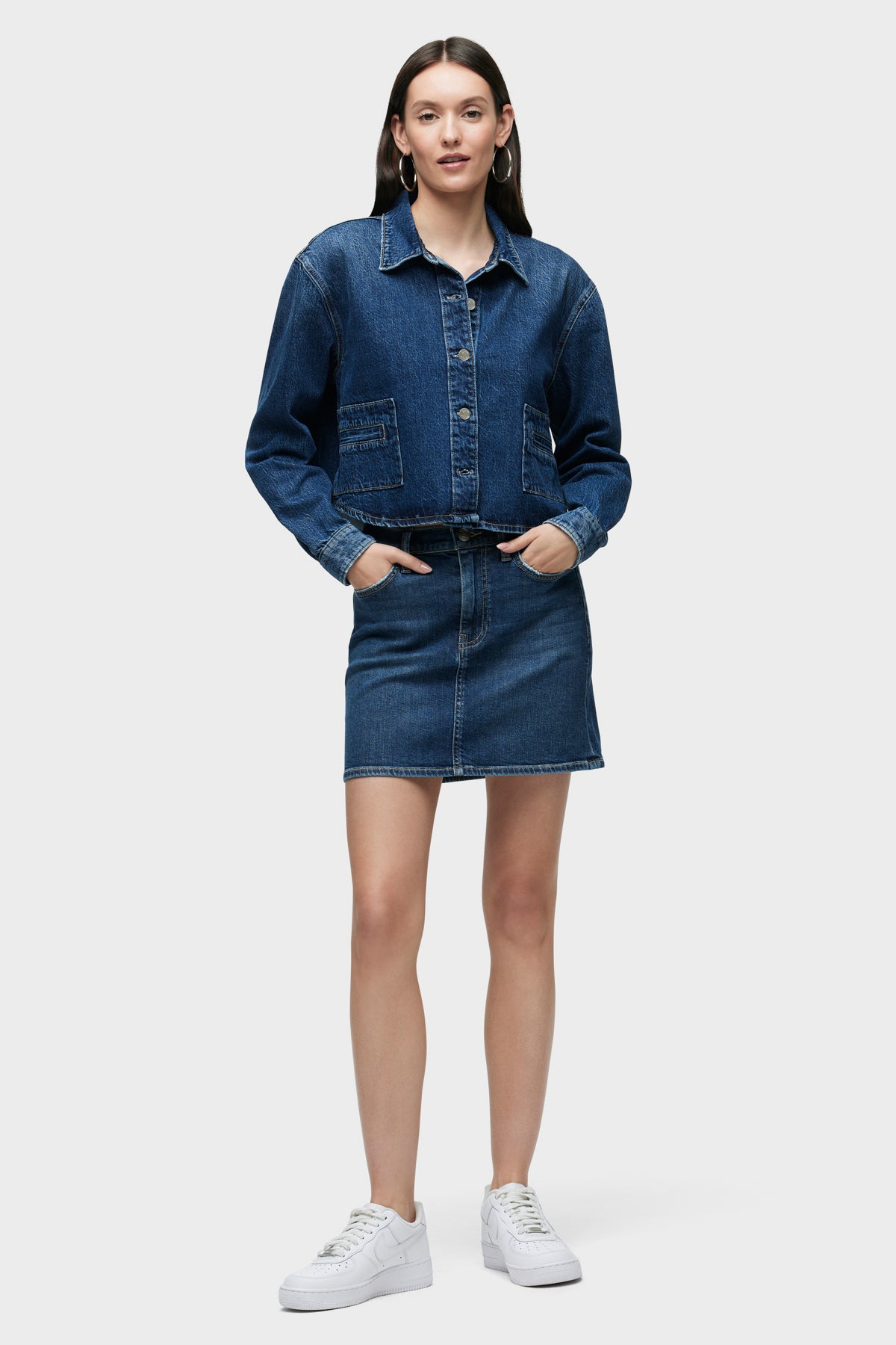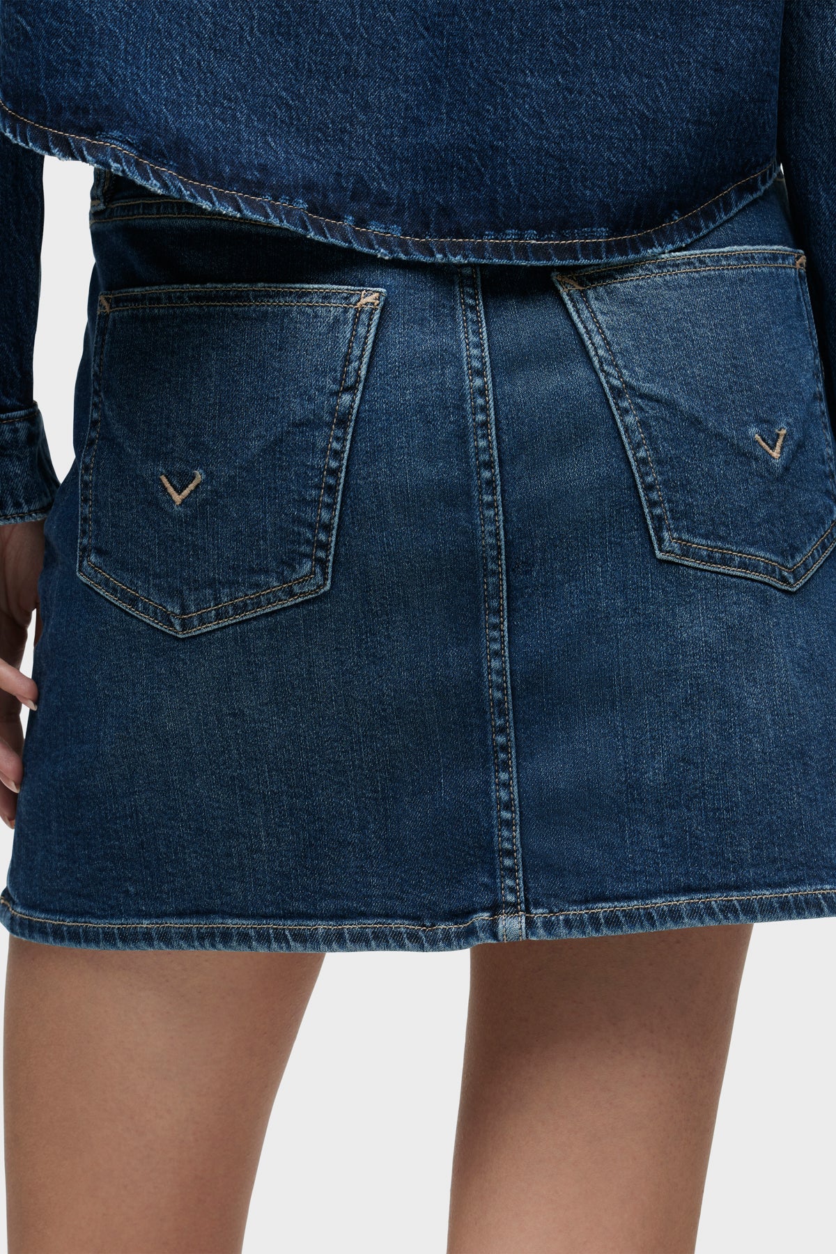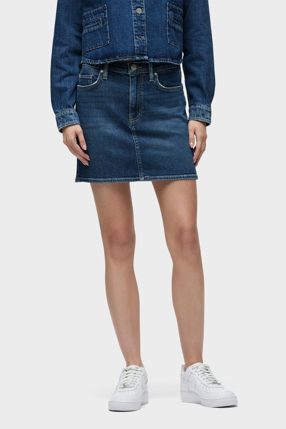 - Our Viper Mini Skirt in medium-dark Riot is cut from premium stretch denim made from recycled cotton. High-rise, A-line shape. Complete with classic five-pocket details and grinding along the edges.
